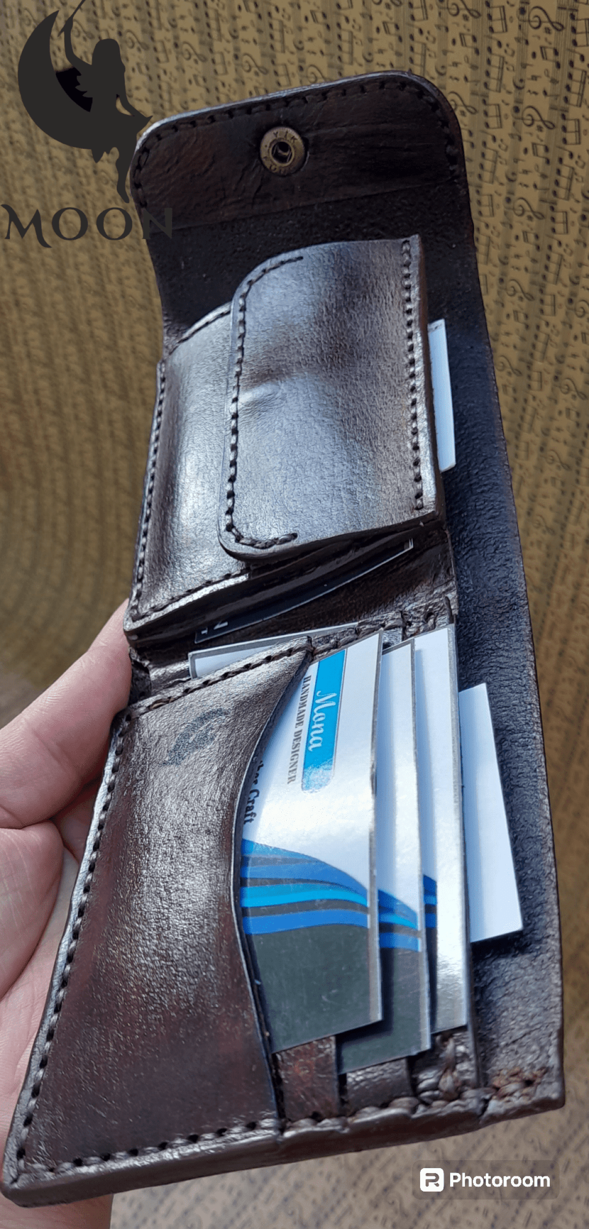 Handmade men's pocket wallet in genuine leather, size 23 x 9, has a place for banknotes, silver coins, and more than 9 cards.