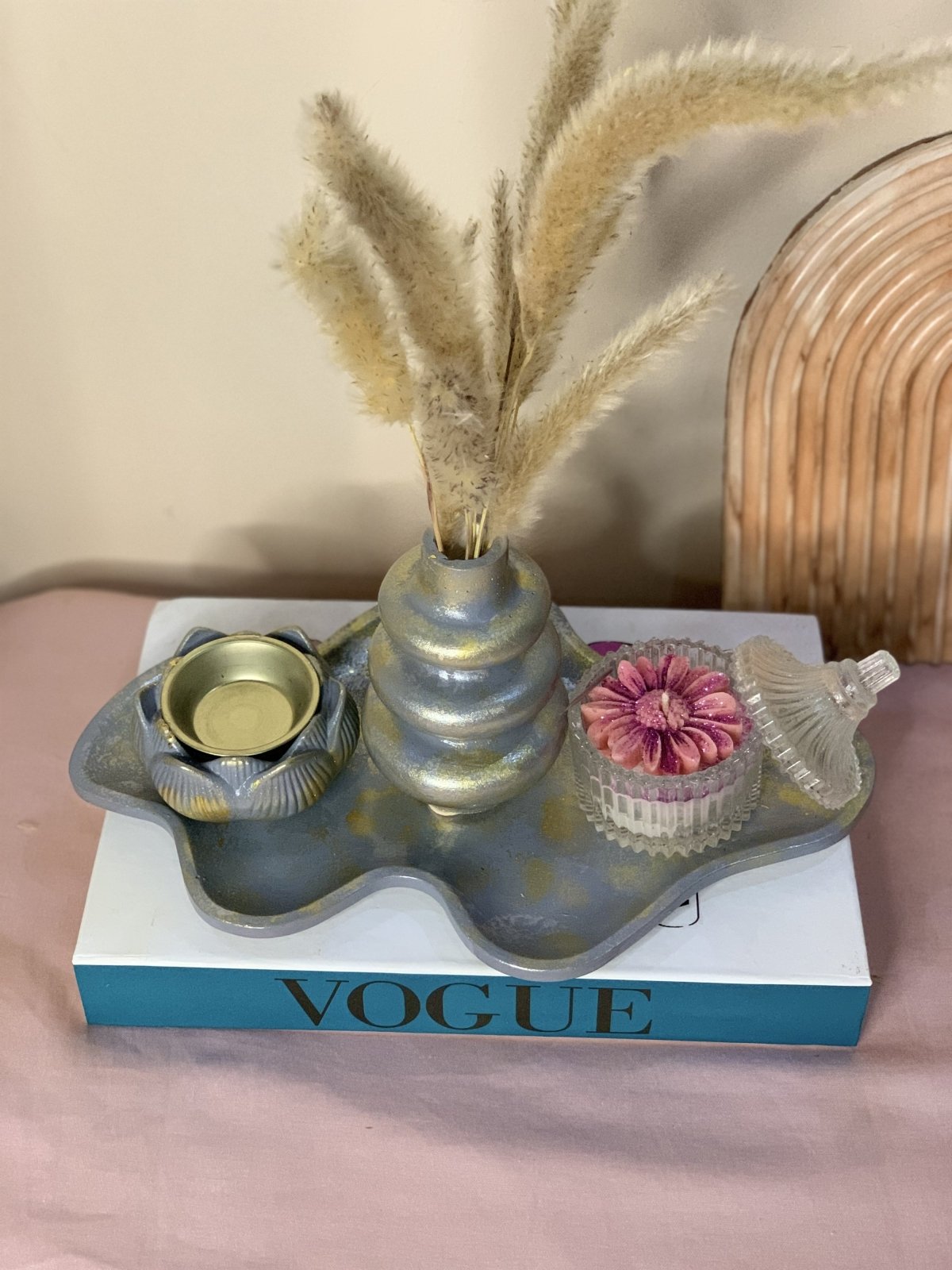 A decorative kit consisting of four tray pieces, a vase, wax, a vaporizer of concrete and candles is available with more than a perfume