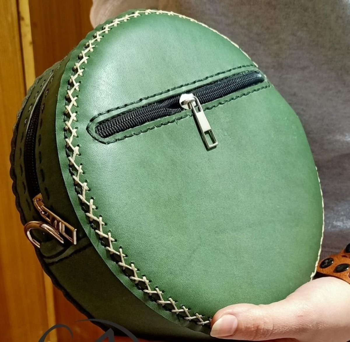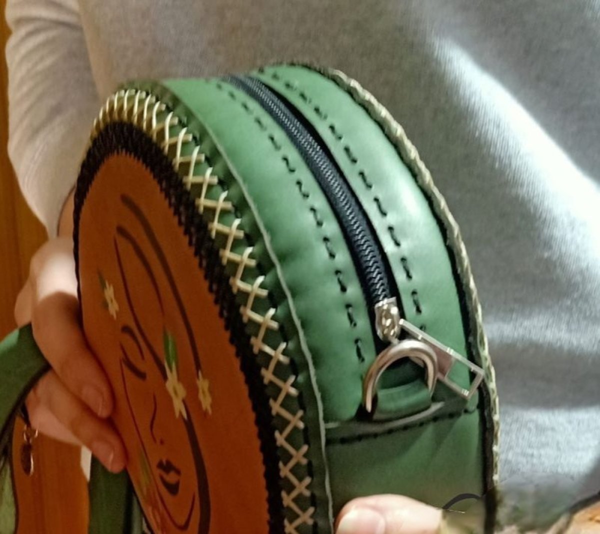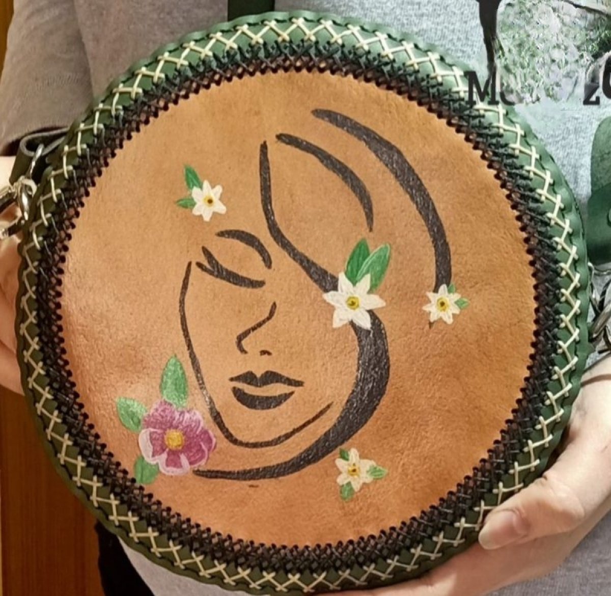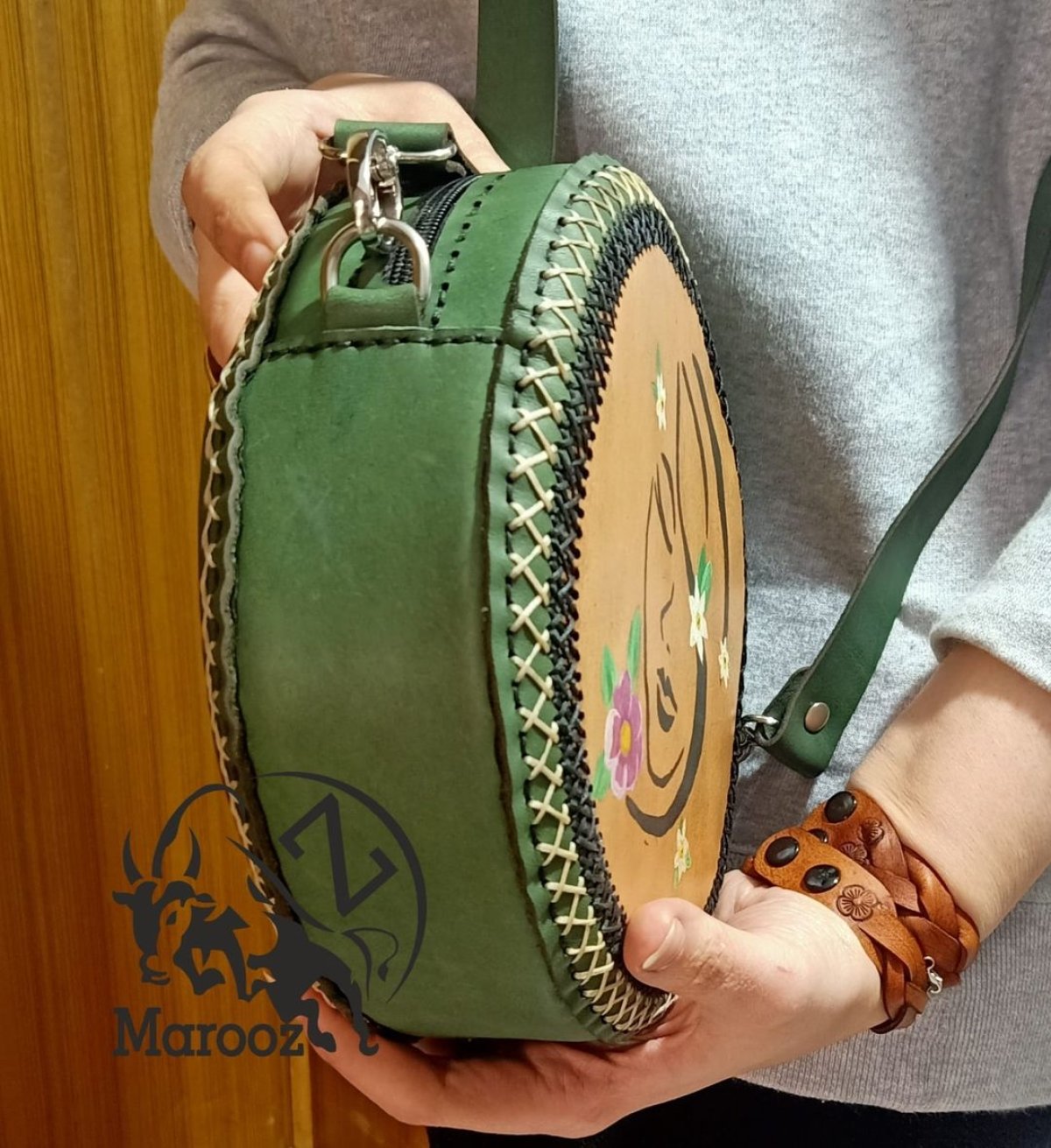 Women's crossbody bag, fully cowhide, lined with leather on the inside, diameter 22 cm, hand drawn and coloured Manual drawing and coloring technique on the skin