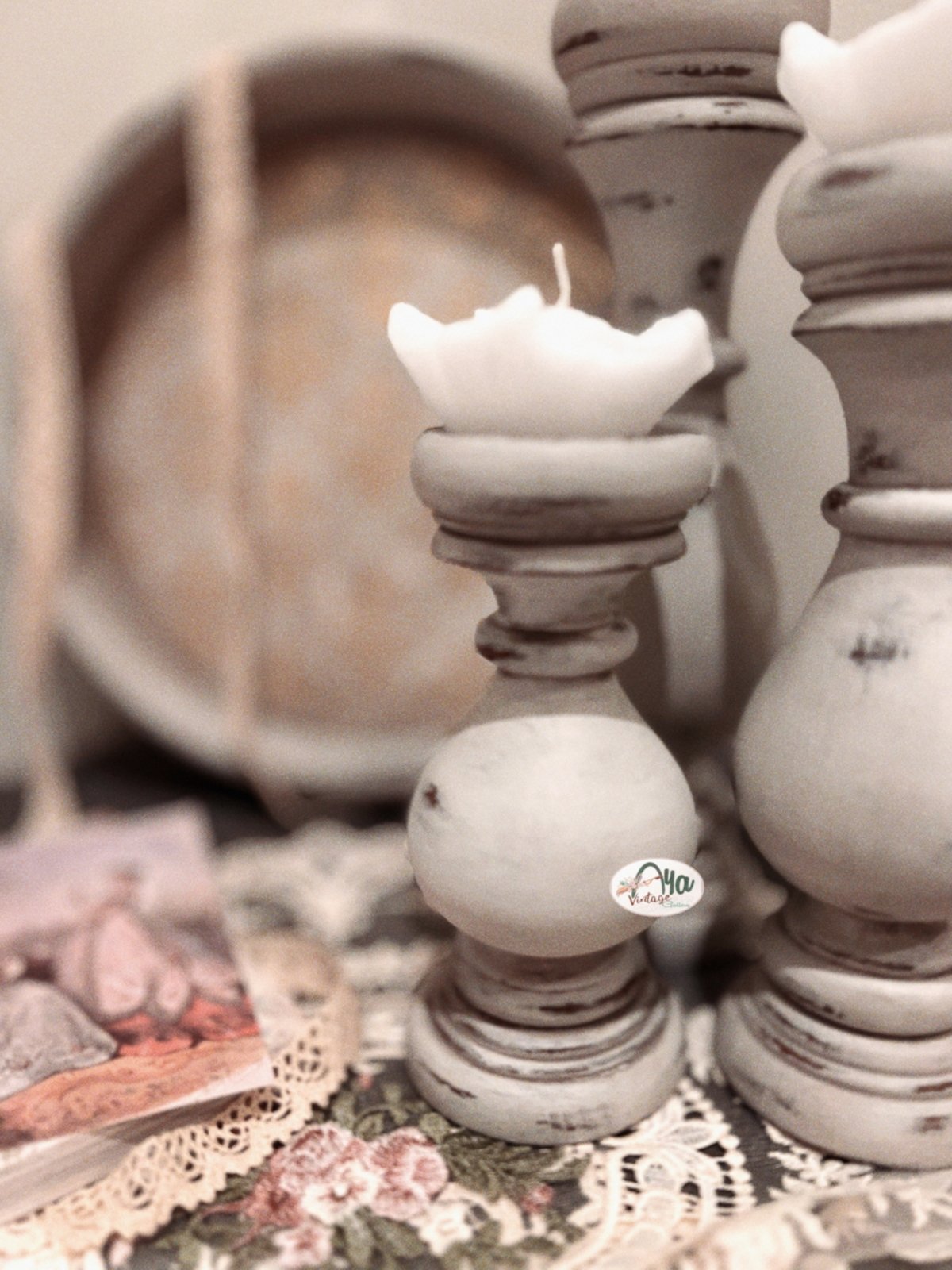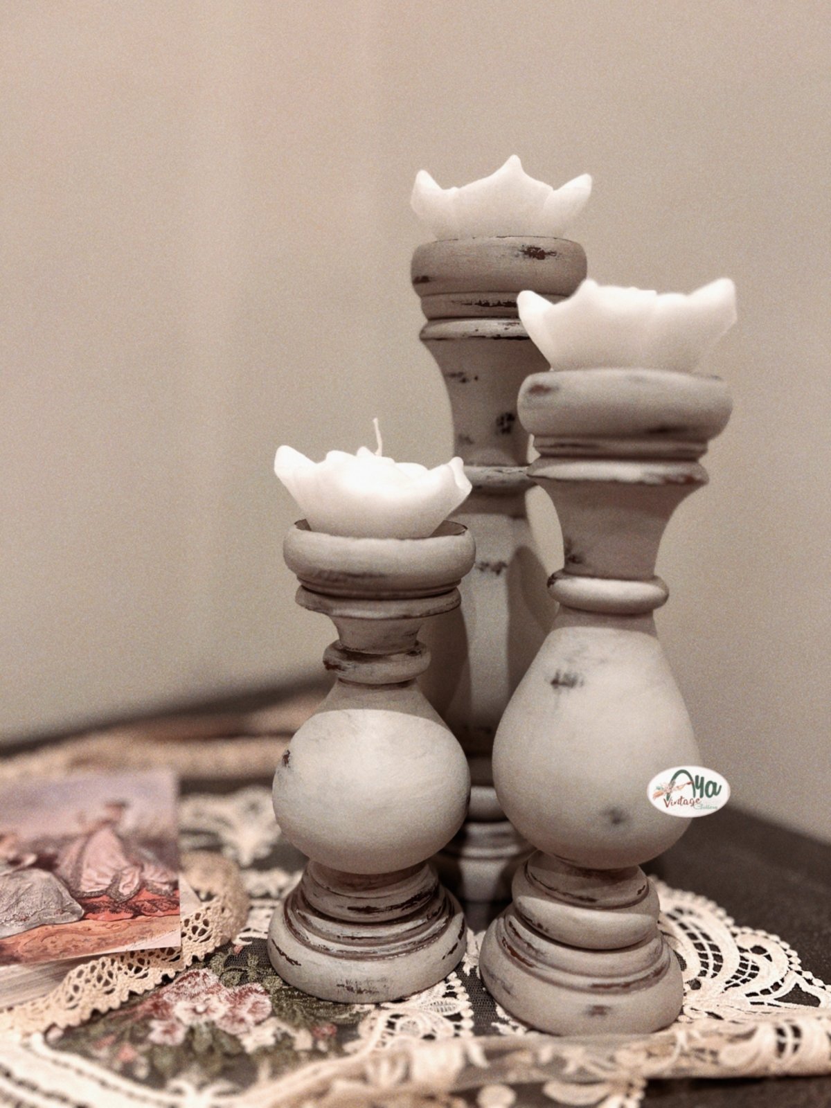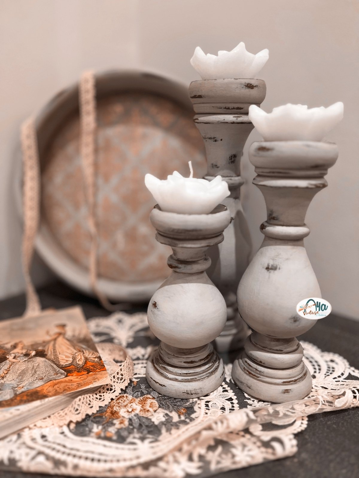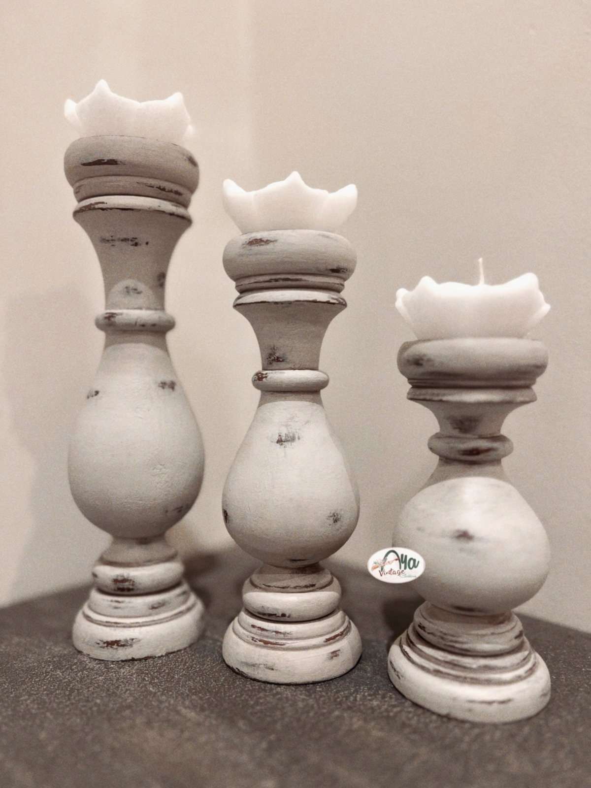 “A set of 3 candle holders, made from natural wood, featuring a shabby chic style that adds a unique aesthetic touch to your home.”