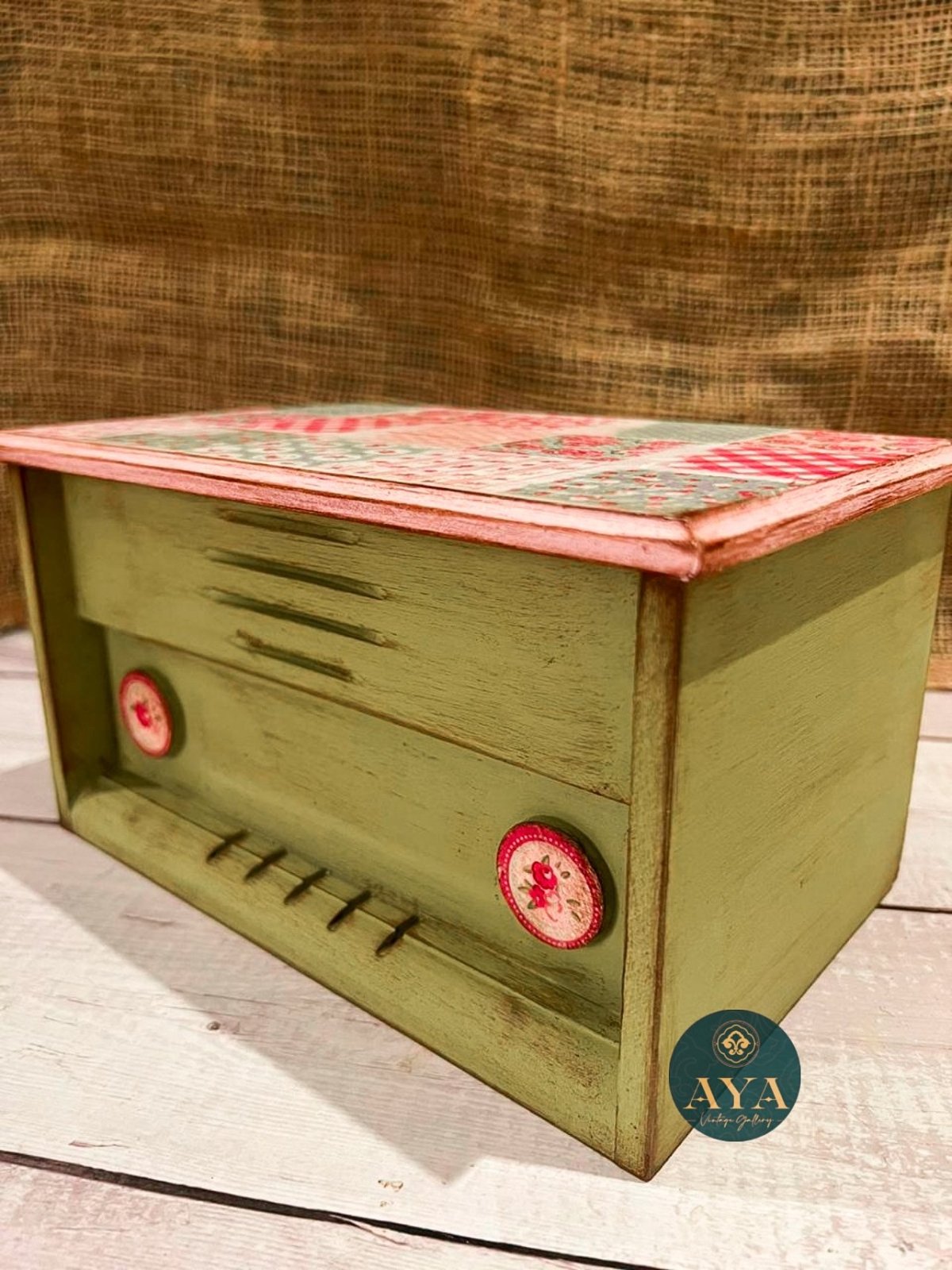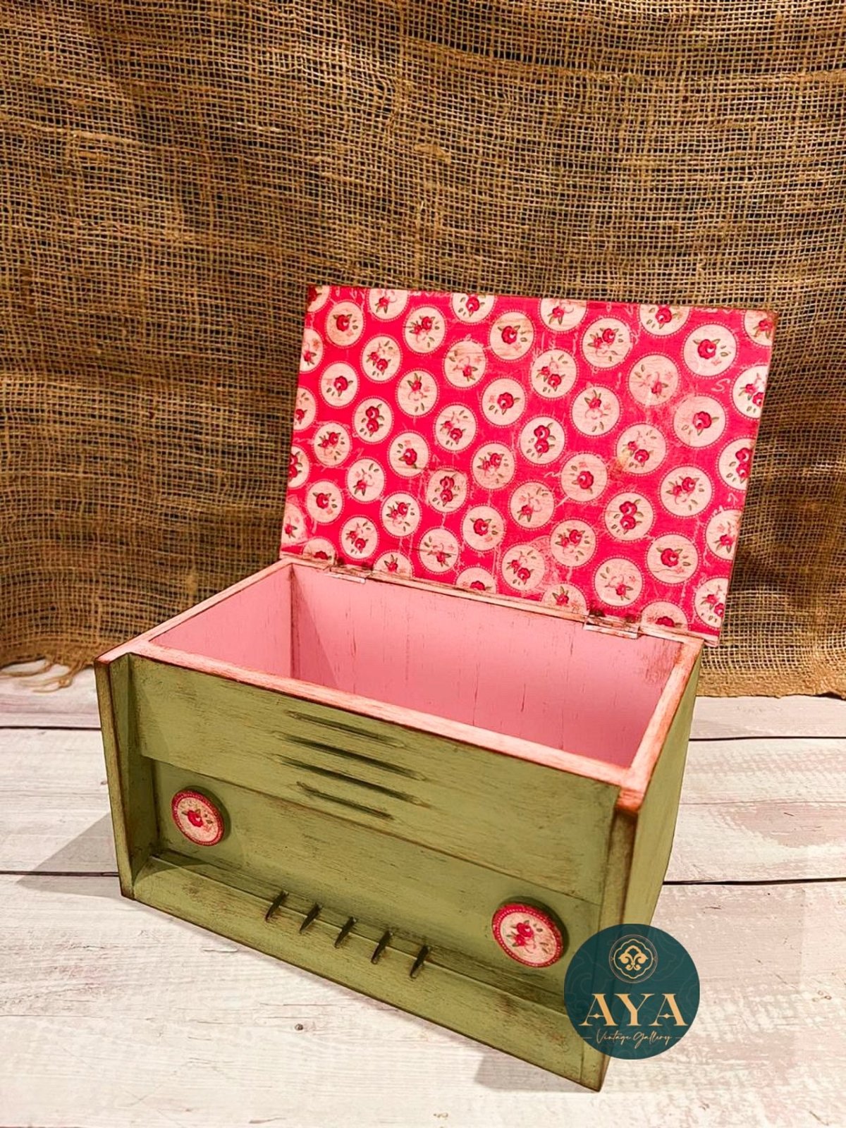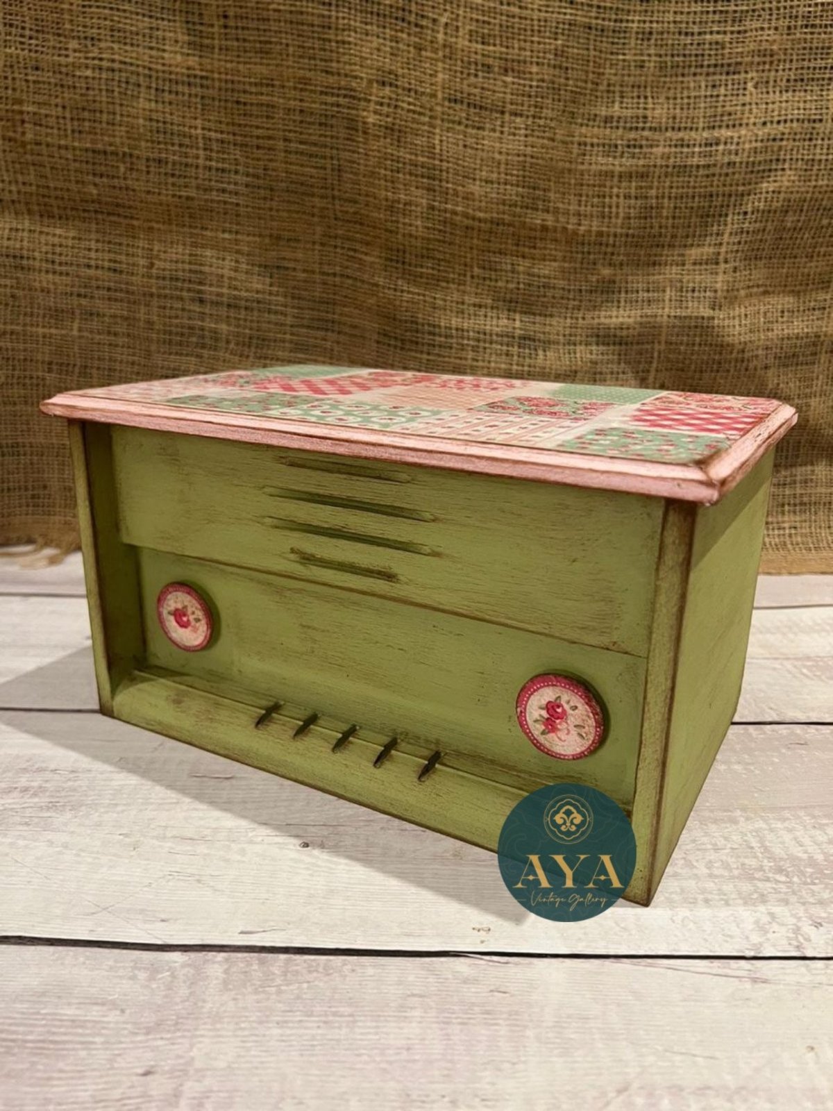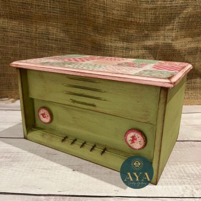 "This box isn't just a piece of décor; it's a work of art that blends the beauty of the past with modern functionality. Crafted from sturdy wood and detailed with meticulous handmade decoupage, its design is inspired by vintage radios, transporting you back to a charming era. At the same time, it serves as a unique storage box for your personal treasures. Whether you place it on a shelf in your home or gift it to someone special, it adds a touch of elegance and nostalgia to any space."