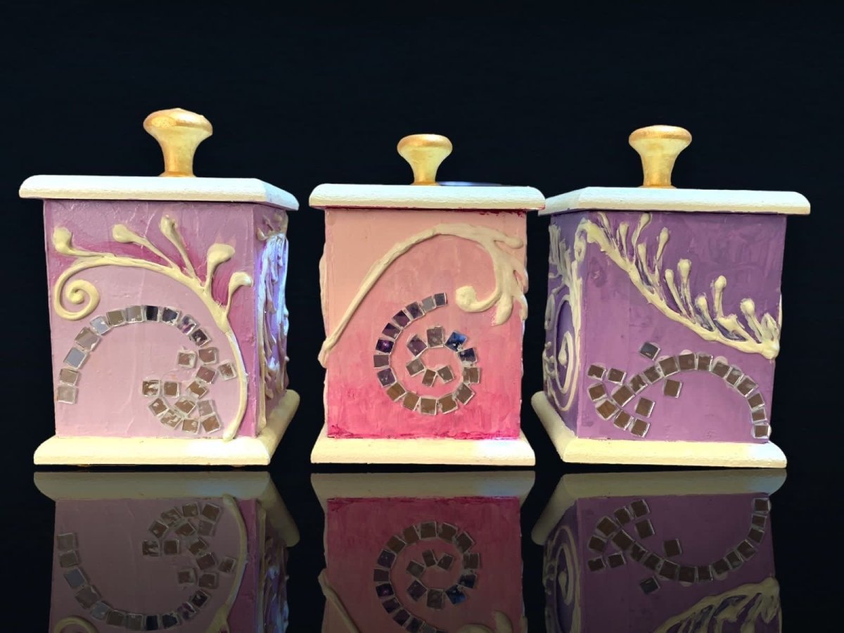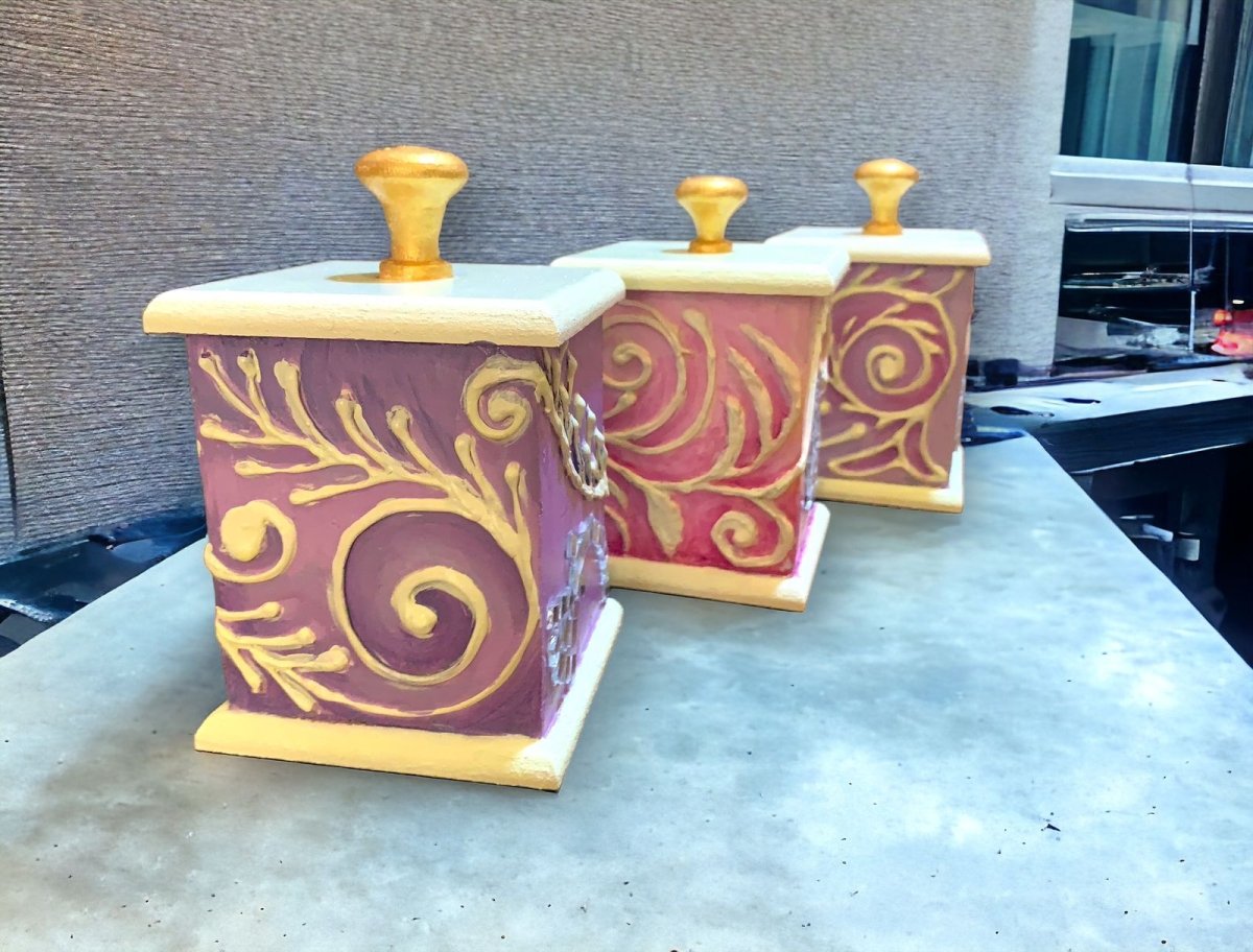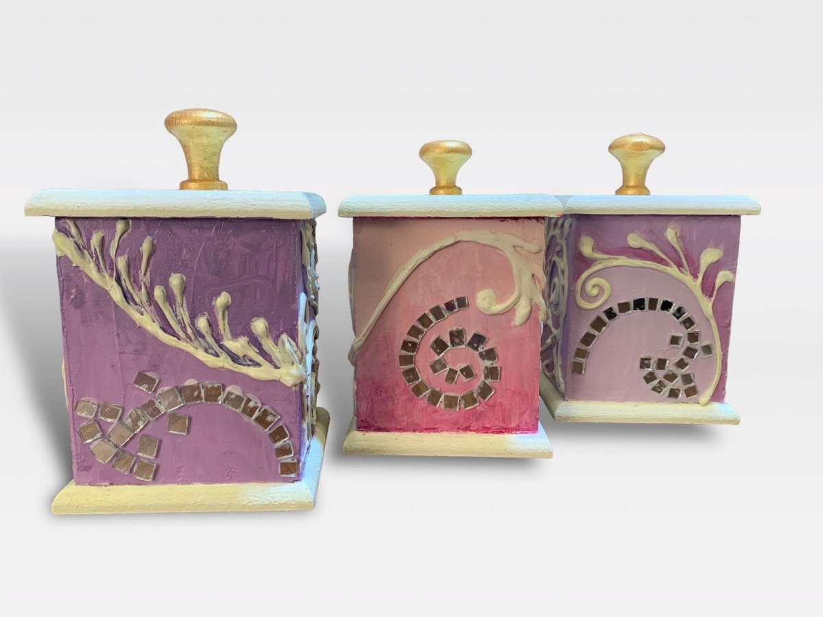 Hand made decoupage set of 3 wooden small containers. Each size 10*14 cm.