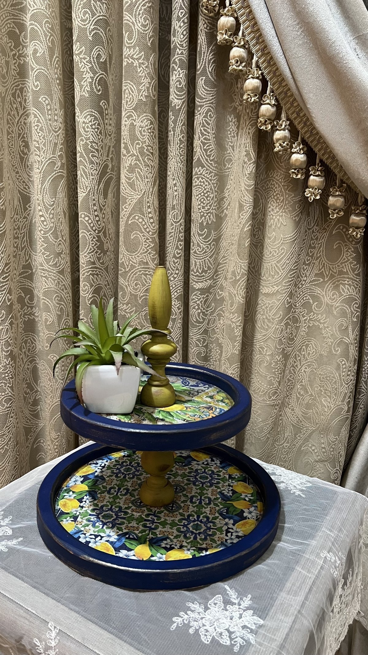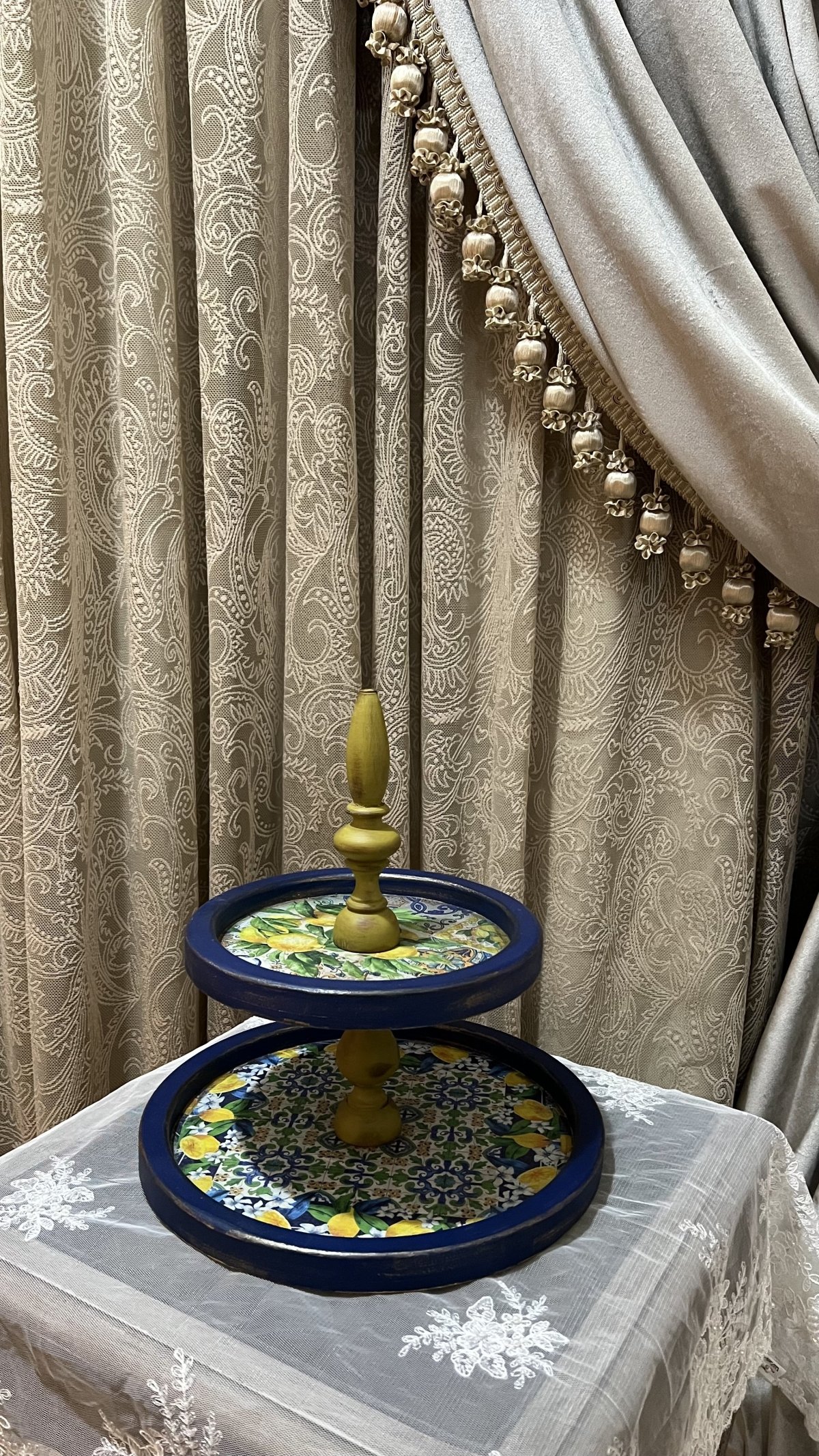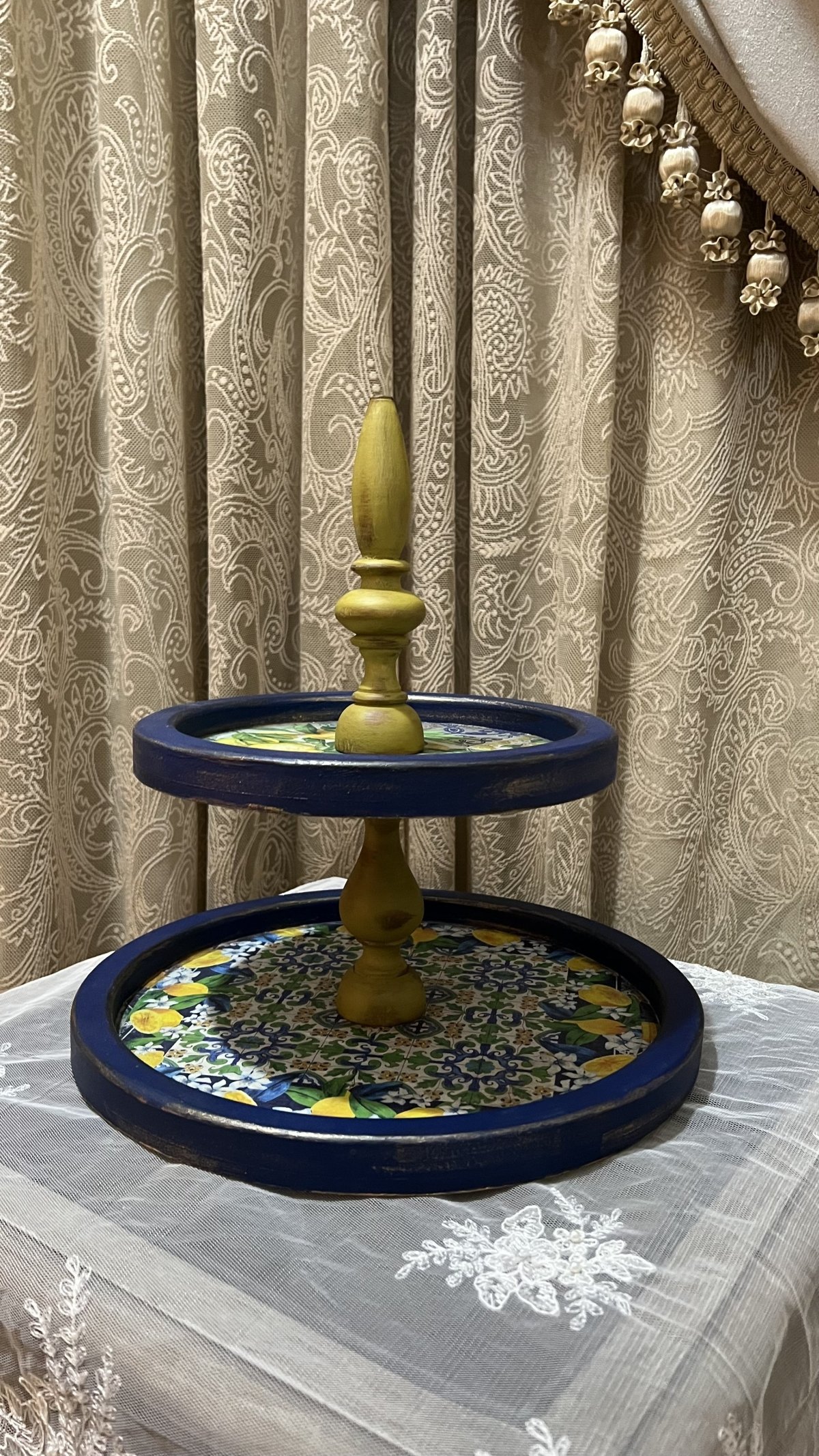 "A two-tiered wooden stand with a vibrant design using decoupage technique. It can be used for serving your desserts, decorating your tables, or arranging your party decor. 🍋💙 Both tiers are detachable, and it comes with an additional taller stand. Size: 25-30 cm."