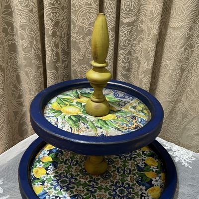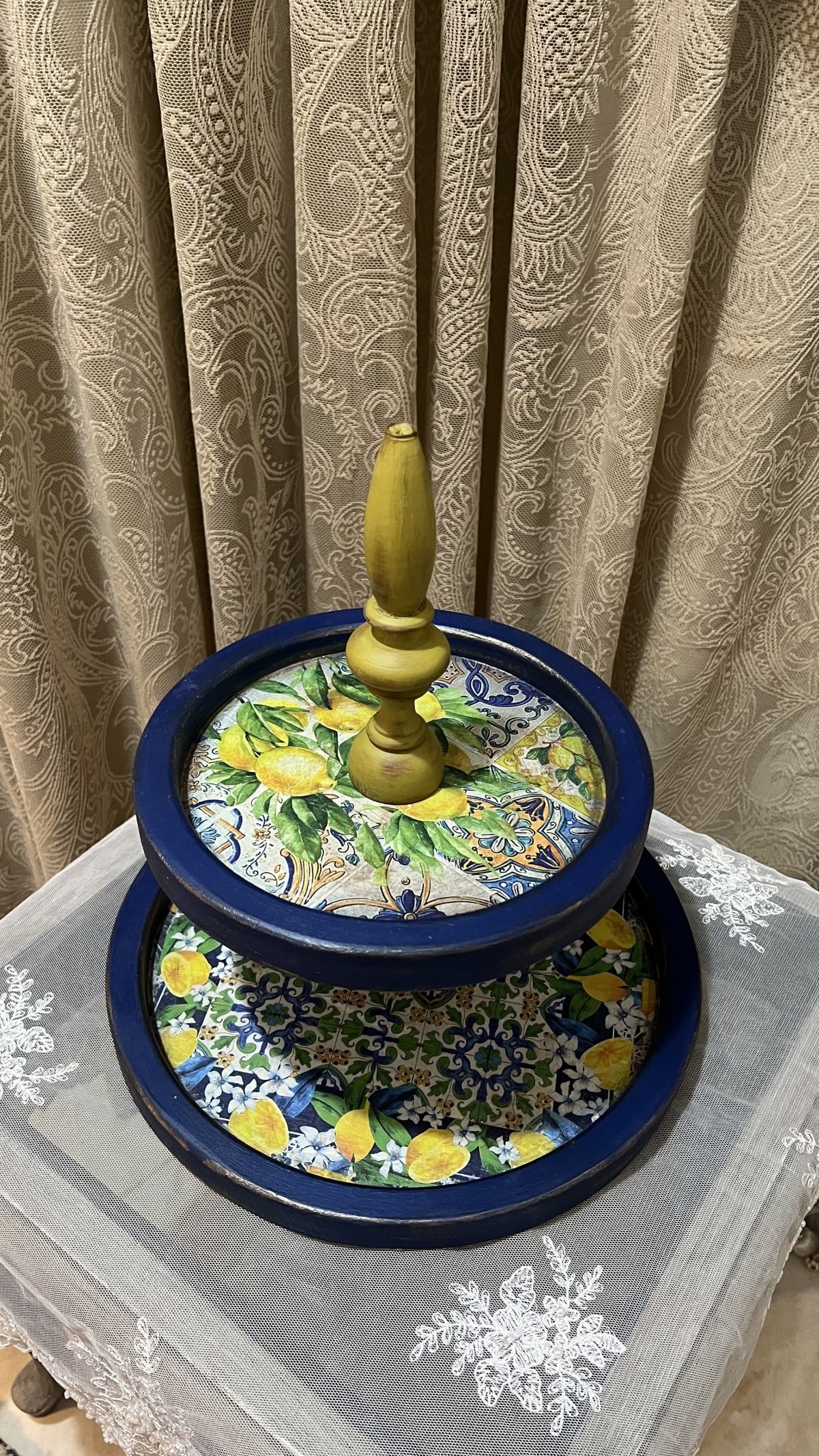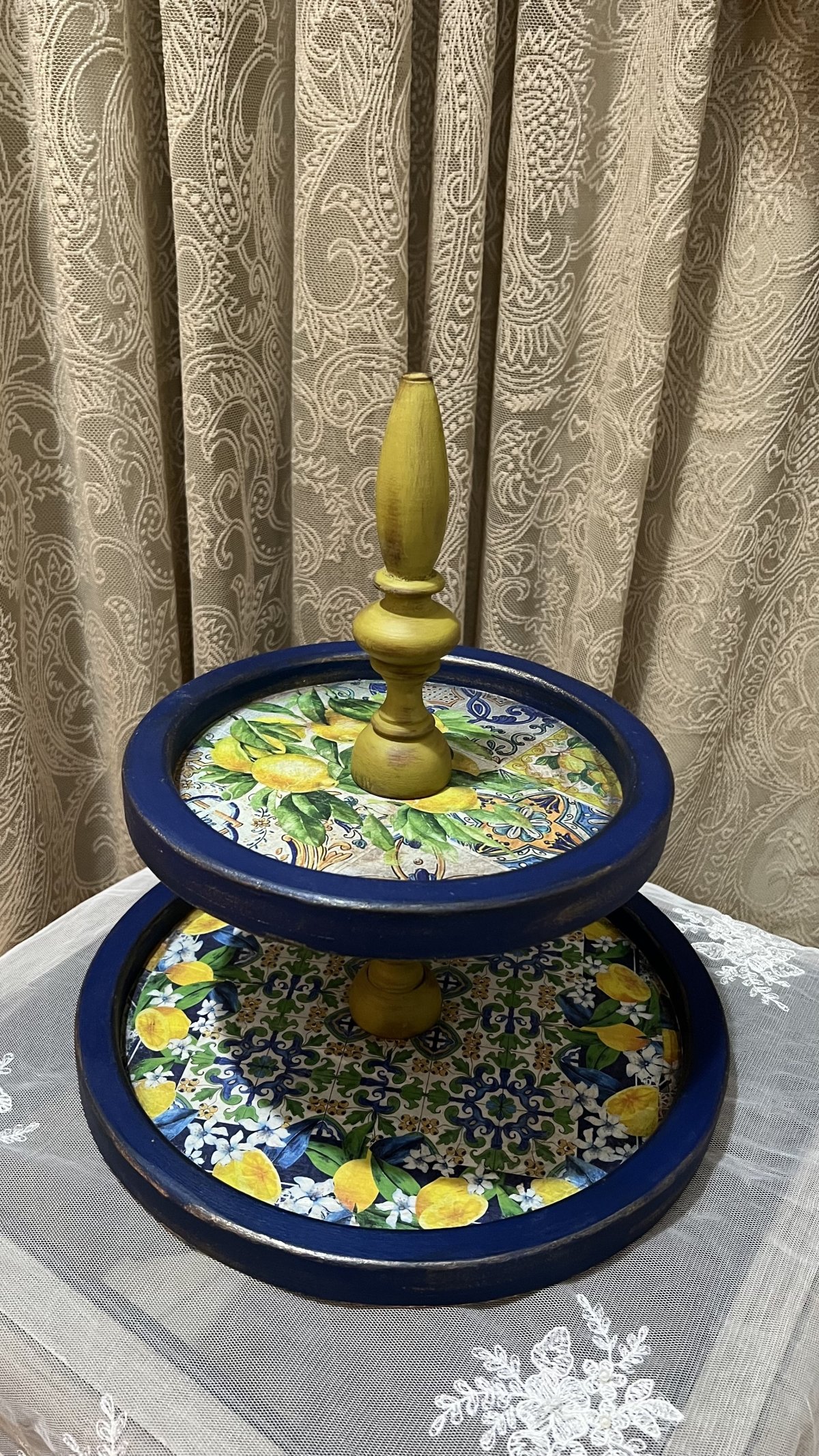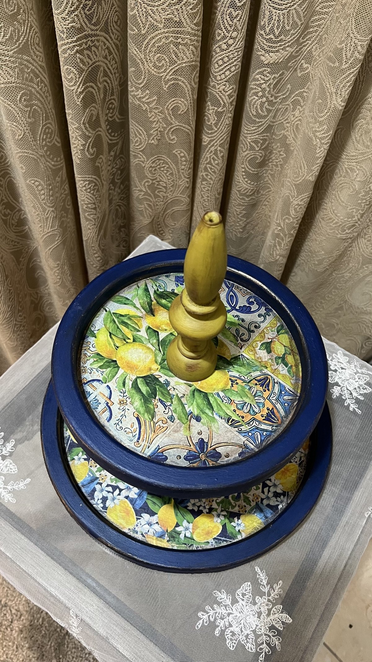 "A two-tiered wooden stand with a vibrant design using decoupage technique. It can be used for serving your desserts, decorating your tables, or arranging your party decor. 🍋💙 Both tiers are detachable, and it comes with an additional taller stand. Size: 25-30 cm."
