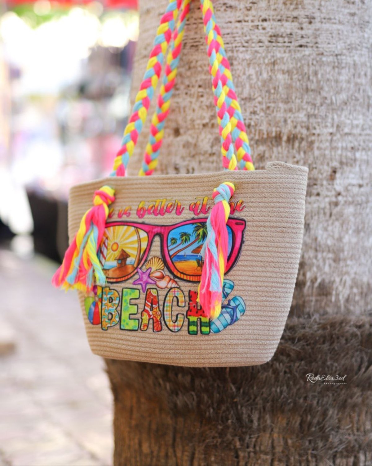 A lightweight and large-sized bag made from pure cotton ropes in beige color. It features vibrant thermal prints of beautiful sea memories and a handle made from brightly colored summer cotton threads. Dimensions: 45 cm width, 32 cm length, with a base of 30 * 15 cm.