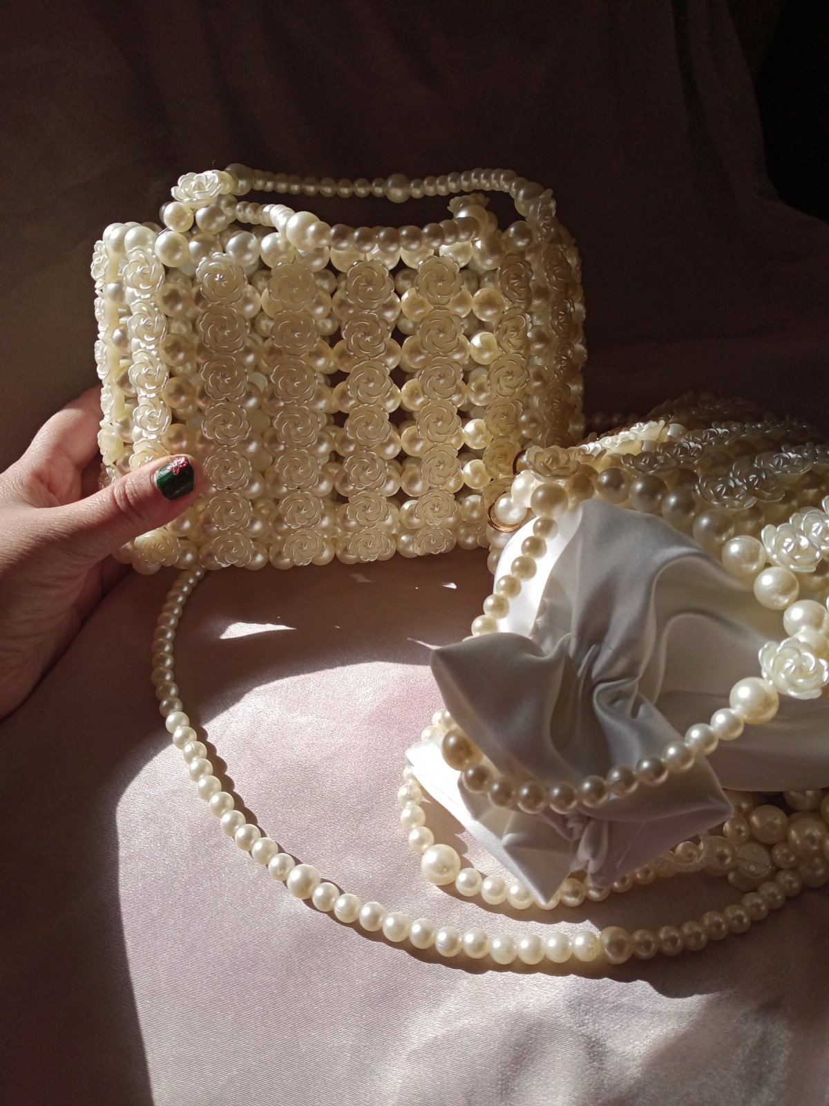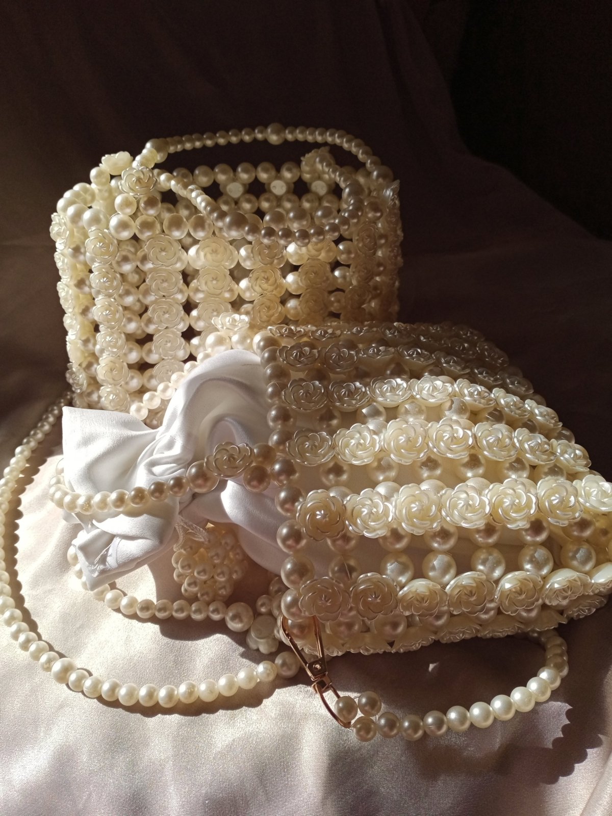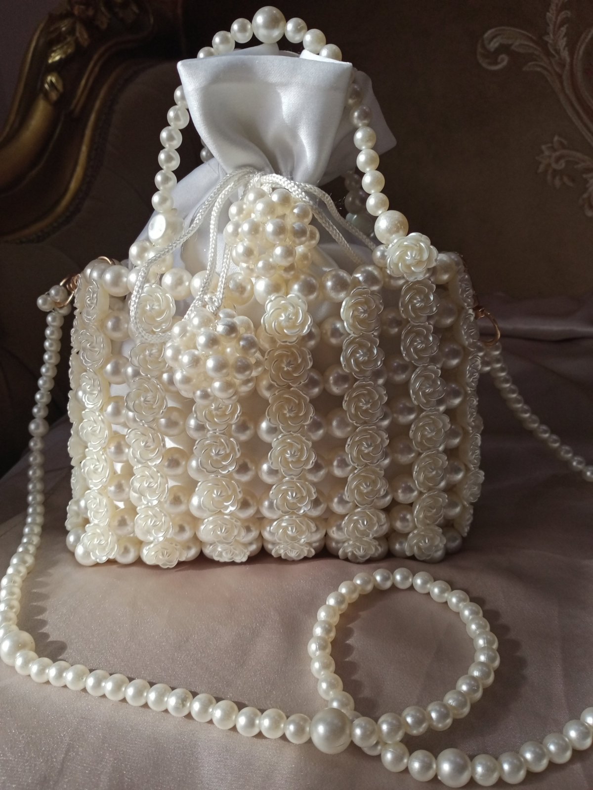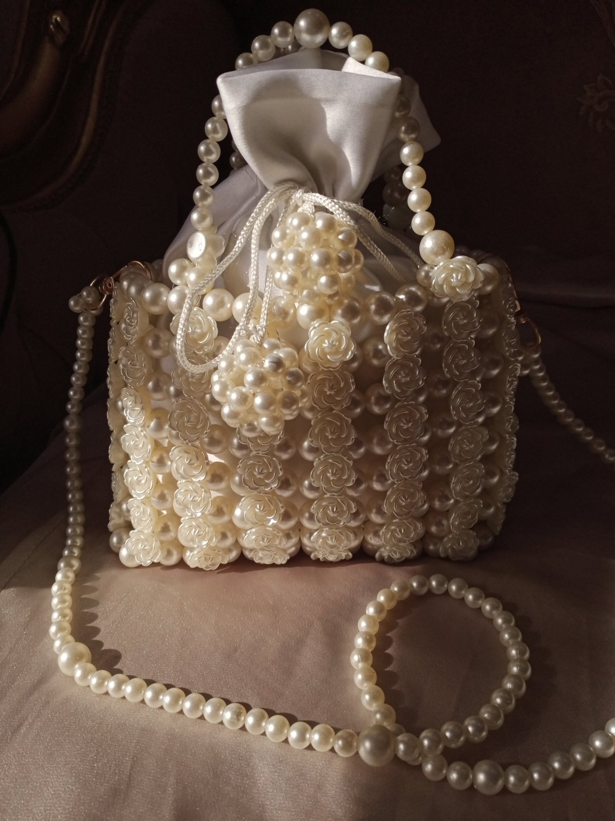 Women's bag made of lollipops and acrylic roses, with an inner satin bag, has a handle and a crossbody made of lollipops, size 20 x 15