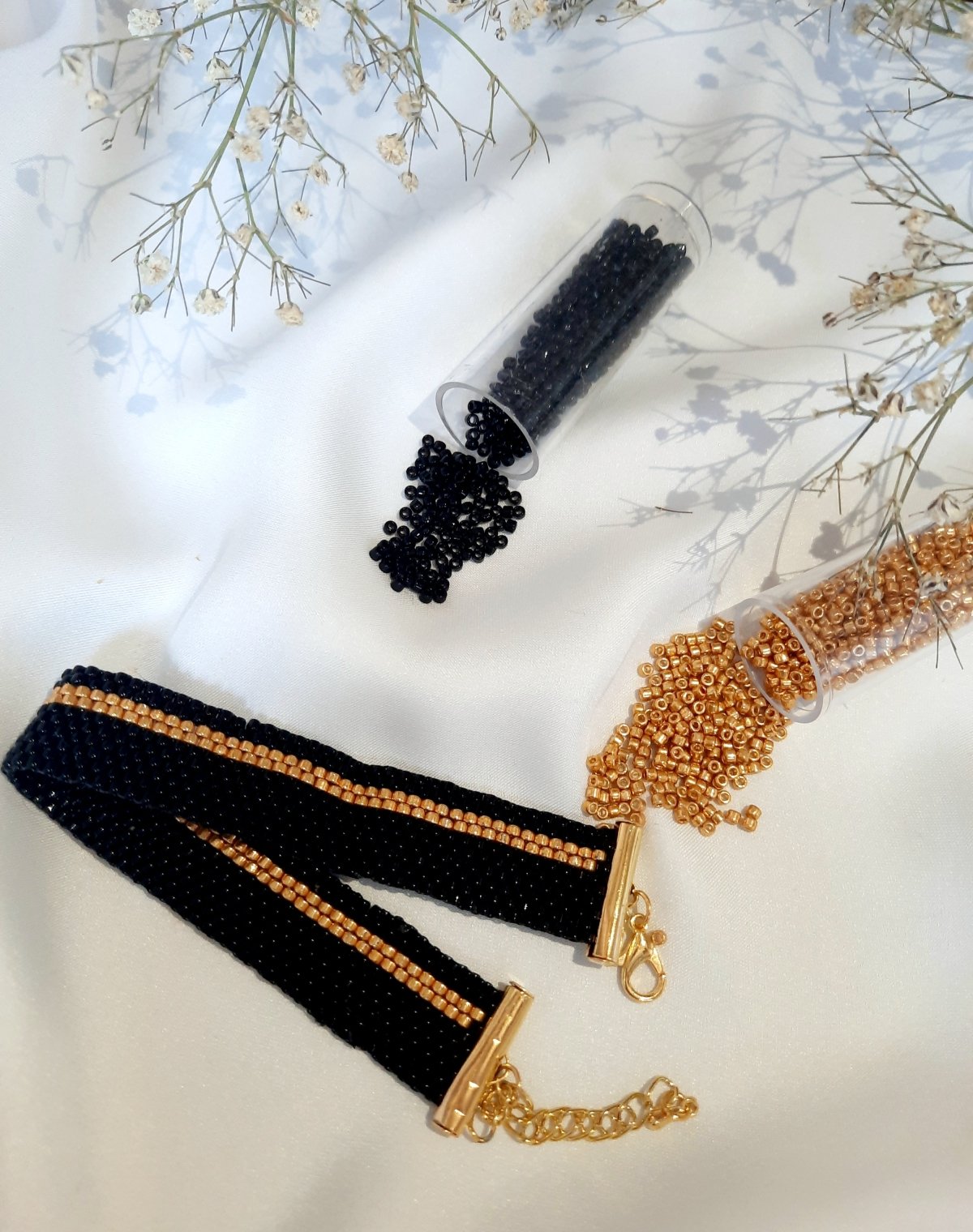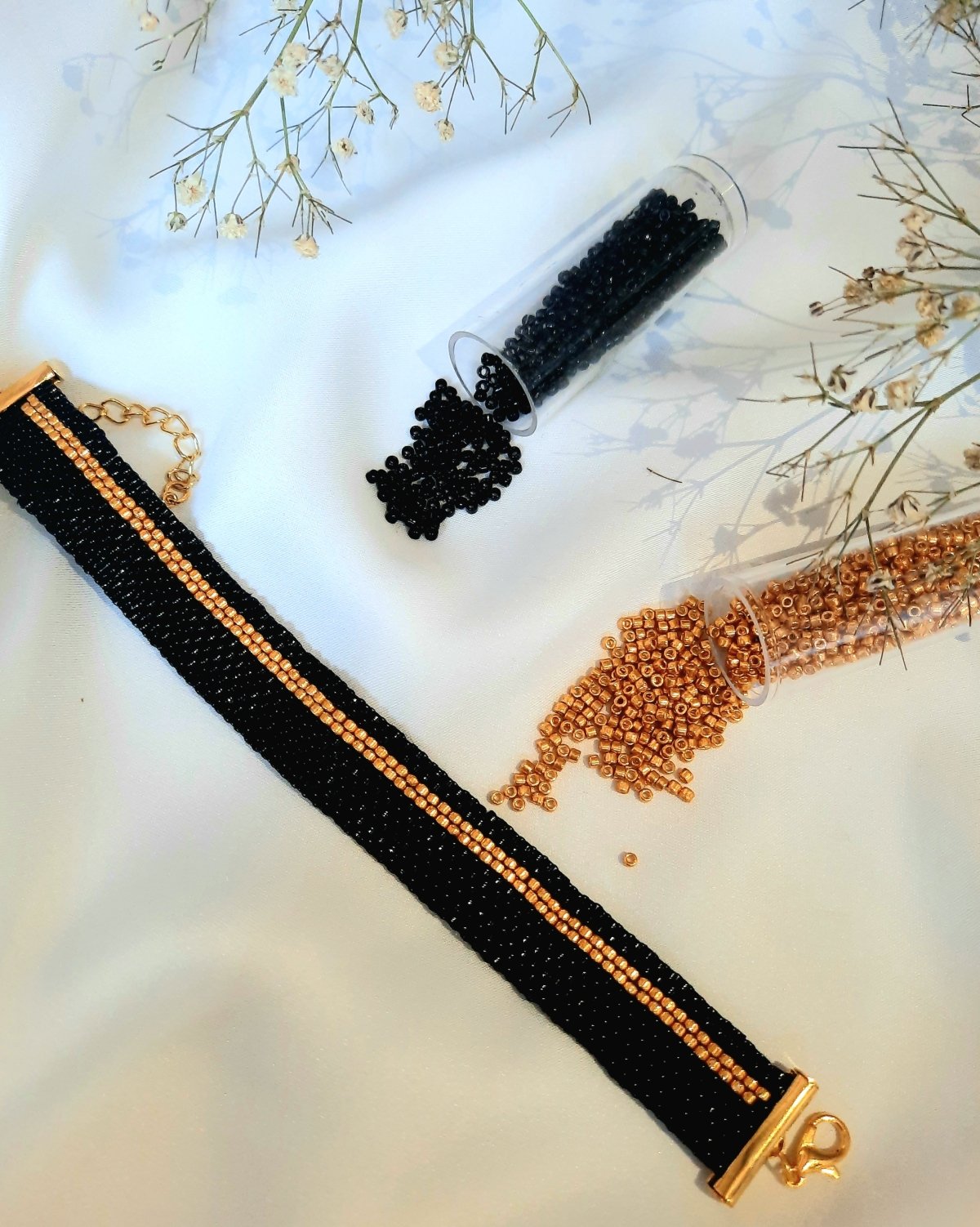 A black bracelet made entirely of Japanese Miyuki beads with a golden line mixed with a simple and modern design that suits all tastes. The clasps and metal materials do not rust or change color and do not cause allergies. Its weight is very light.