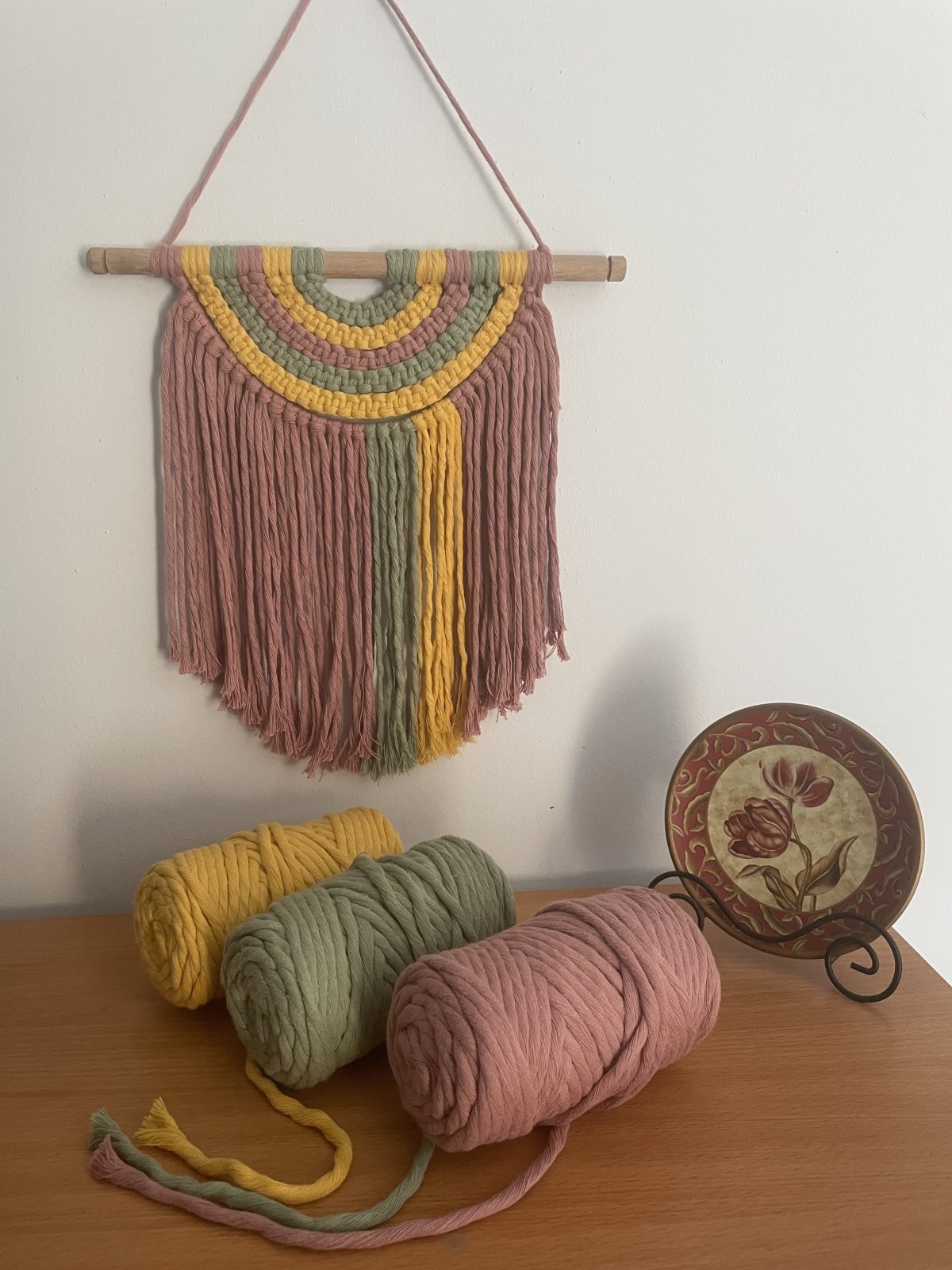 A cashmere, yellow and green macrame wall decoration on a 30 cm wooden stick