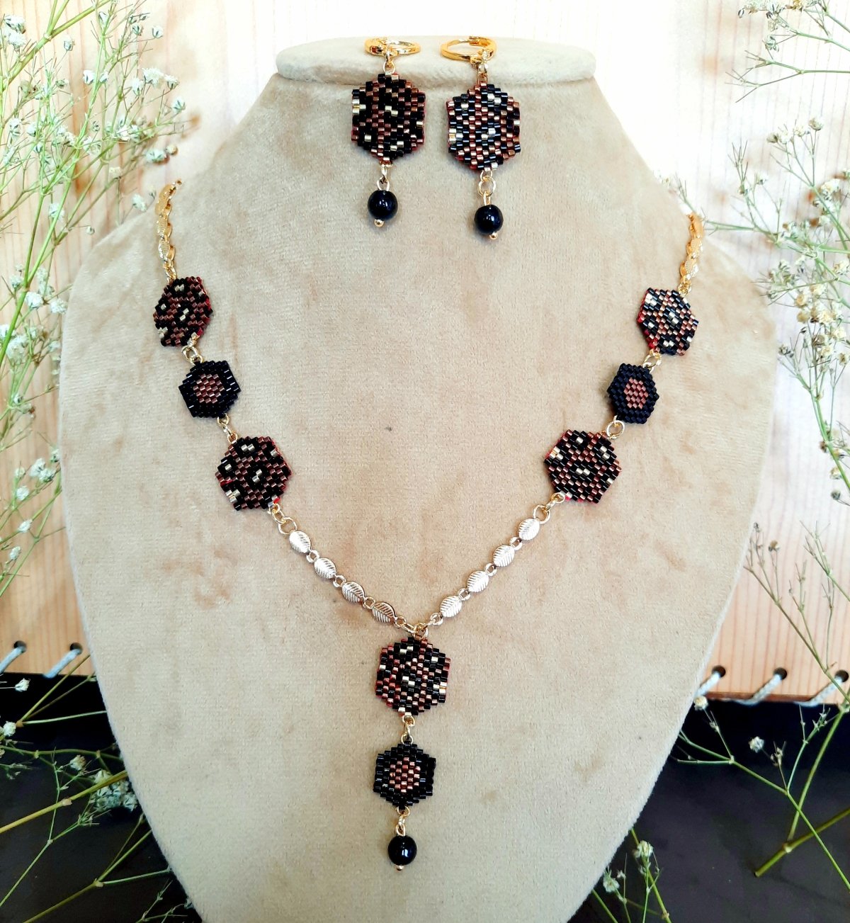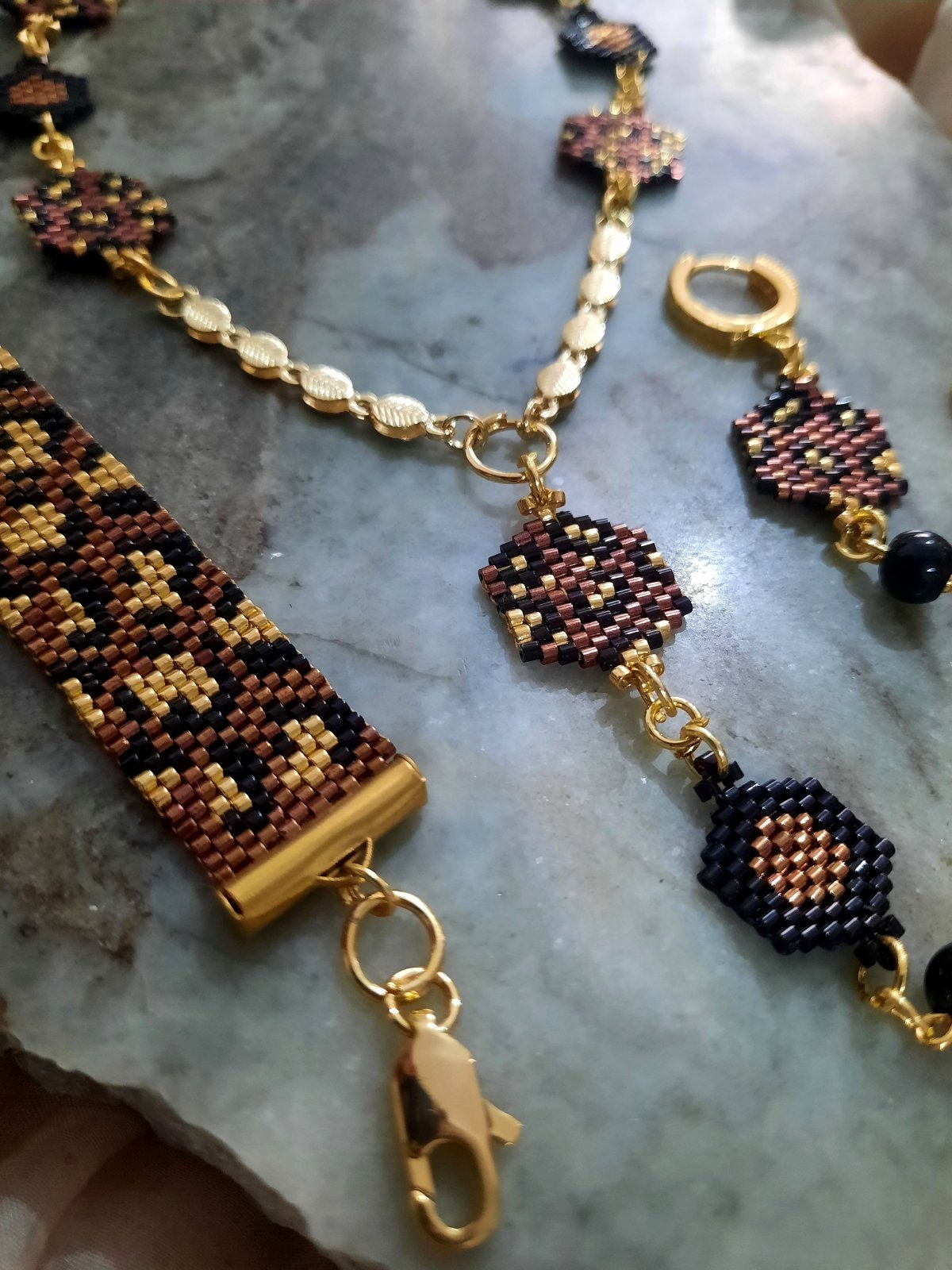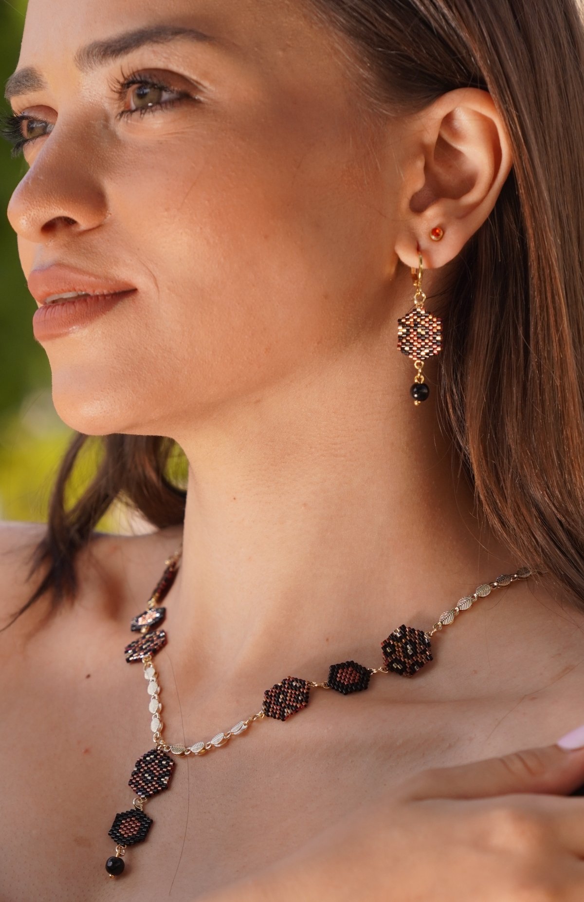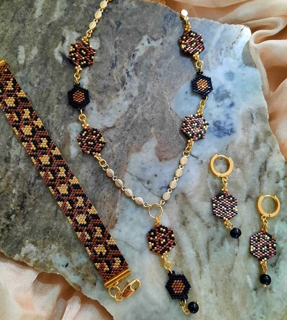 The set is a necklace 60 cm long consisting of units in dark red with black and gold in a leopard skin pattern and other units in dark red and black in a hexagonal shape that matches the rest of the units with a very modern and distinctive design and bracelet made with tiger skin .. Made entirely of Miyuki beads.. and earring of the same type. The style...and all the metal materials used do not rust or change color and do not cause allergies..its weight is very light..