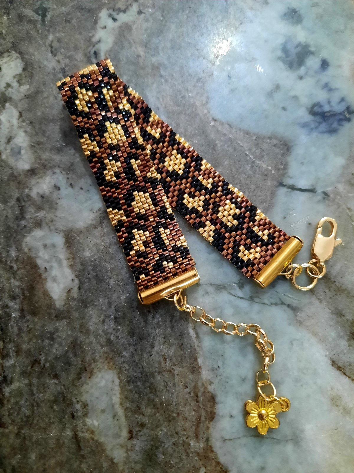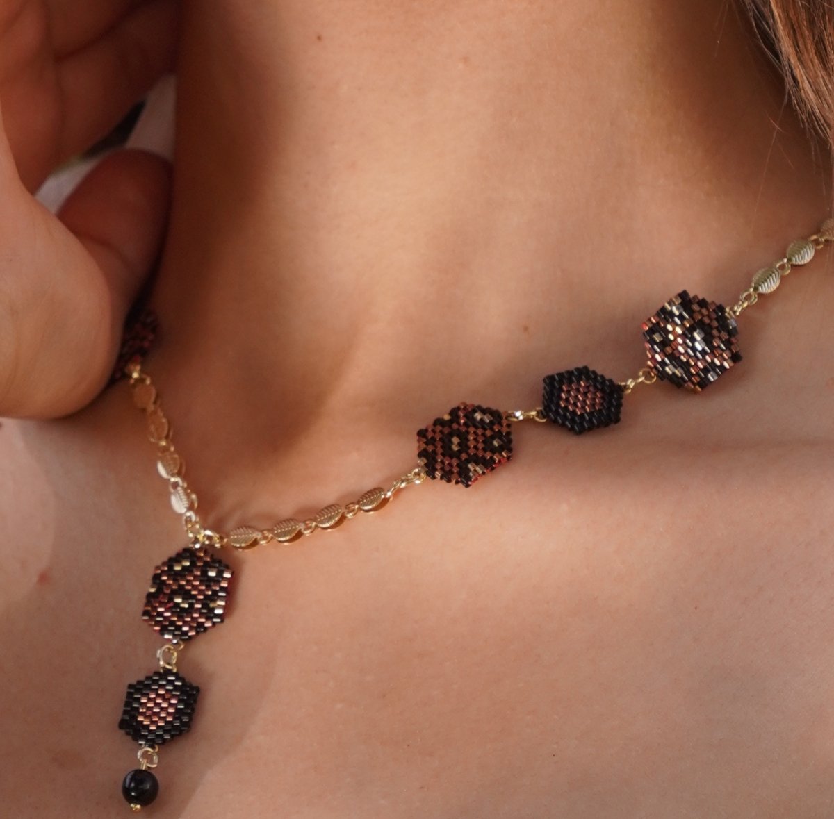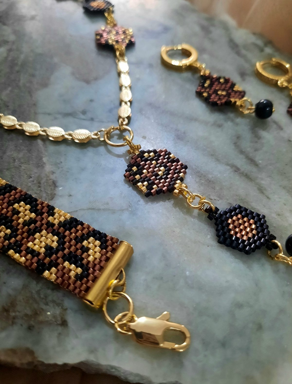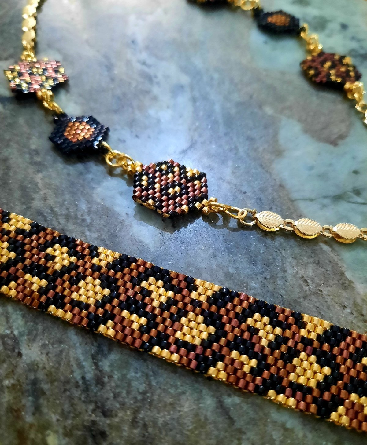 The set is a necklace 60 cm long consisting of units in dark red with black and gold in a leopard skin pattern and other units in dark red and black in a hexagonal shape that matches the rest of the units with a very modern and distinctive design and bracelet made with tiger skin .. Made entirely of Miyuki beads.. and earring of the same type. The style...and all the metal materials used do not rust or change color and do not cause allergies..its weight is very light..