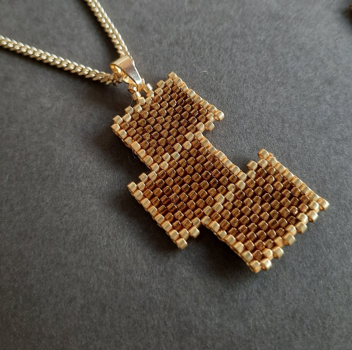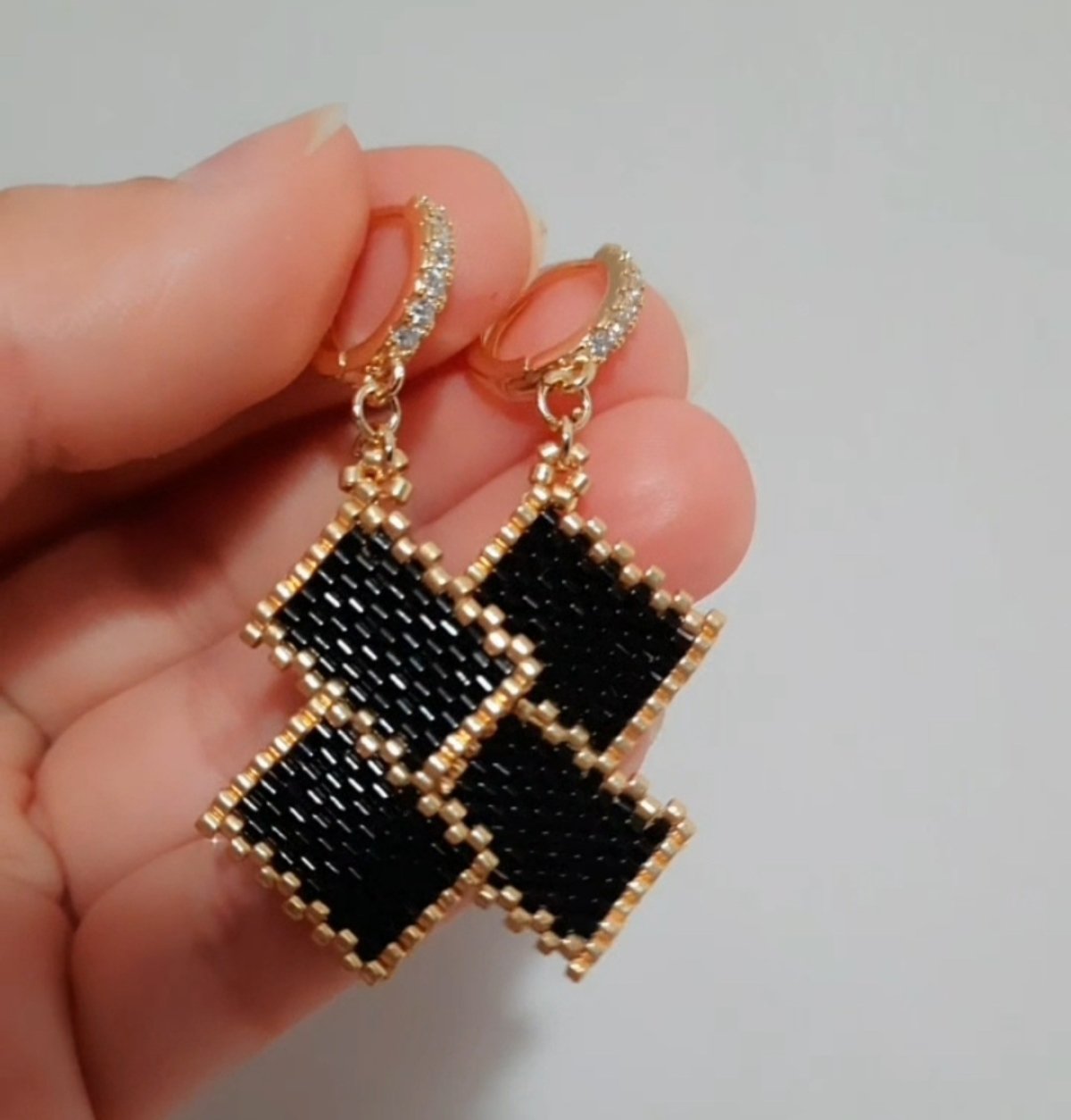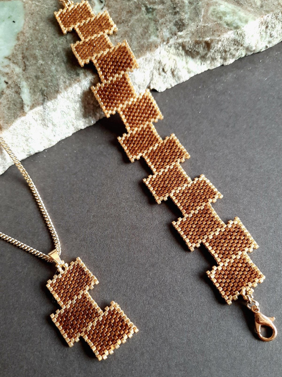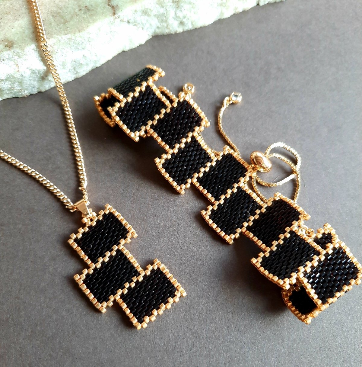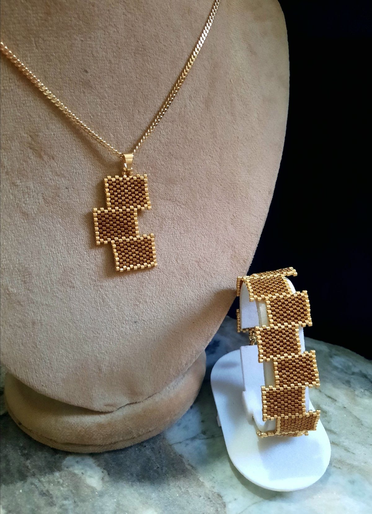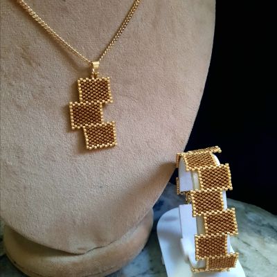The set consists of a bracelet with a pattern of interlocking rectangles and an extendable chain 55 cm long, with a pendant and earrings of the same style, made entirely of Miyuki beads with a new, modern and distinctive design. All metal materials used are not rusty or discolorable and do not cause allergies. Their weight is very light..