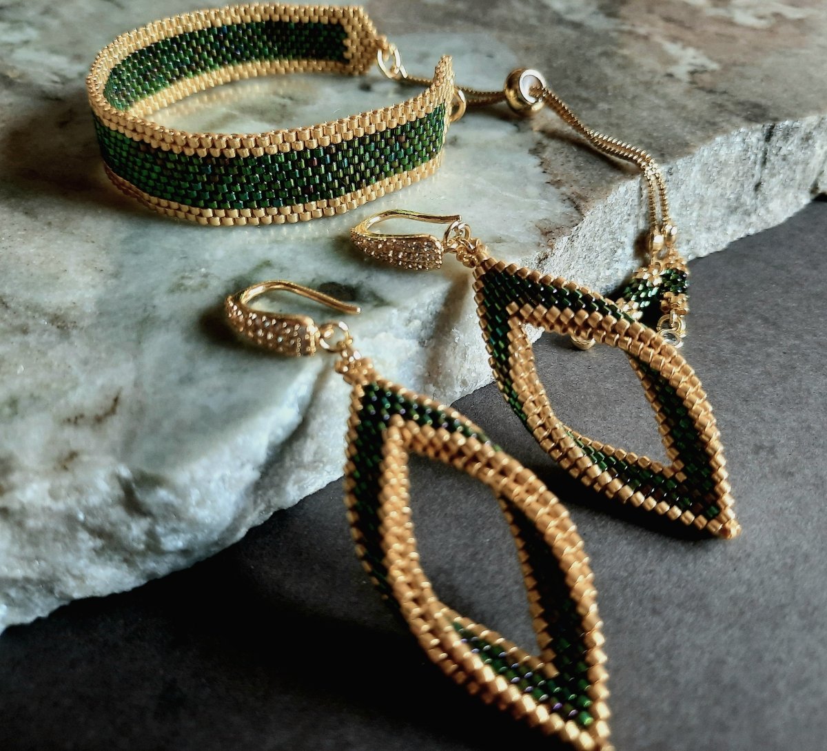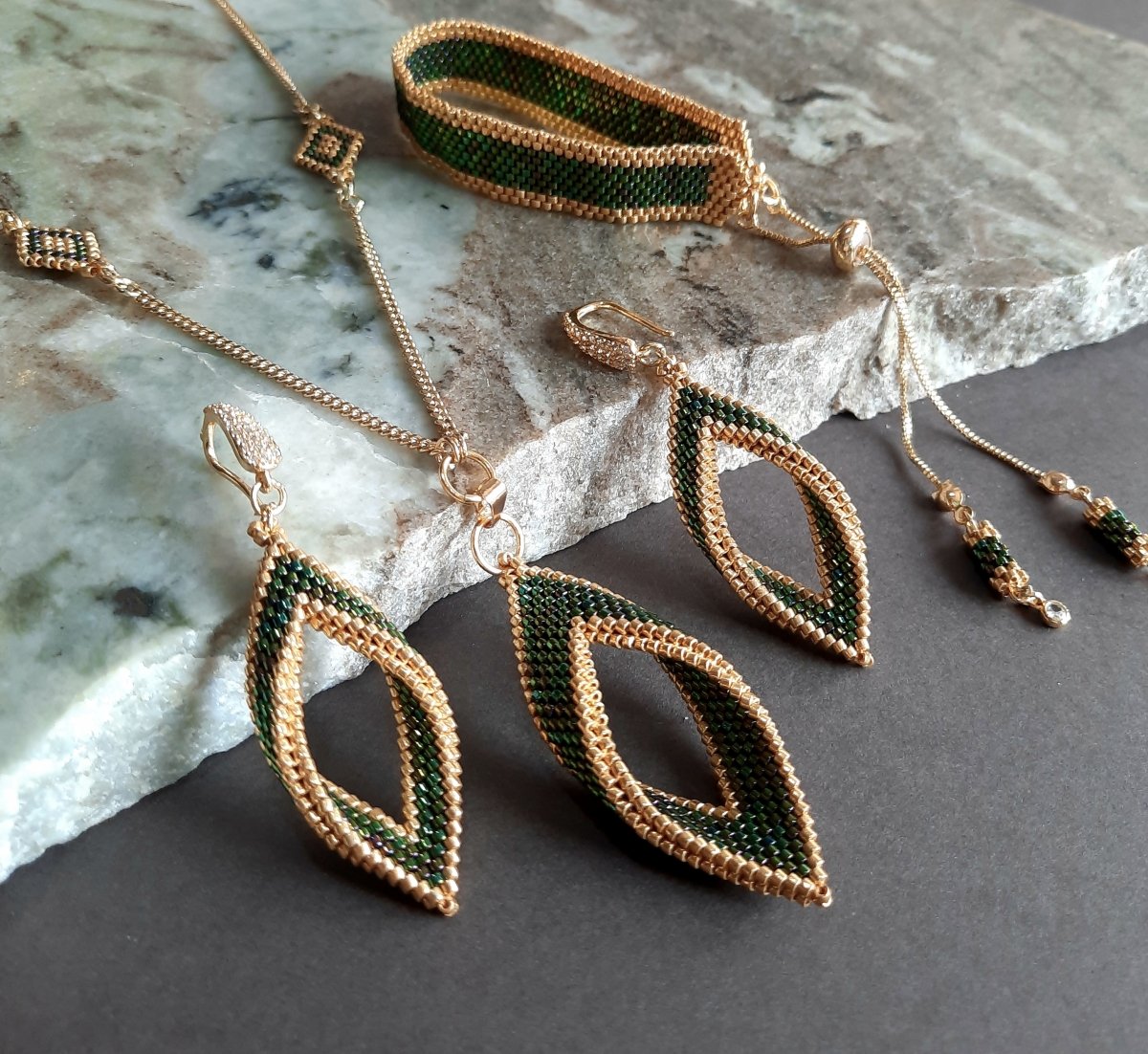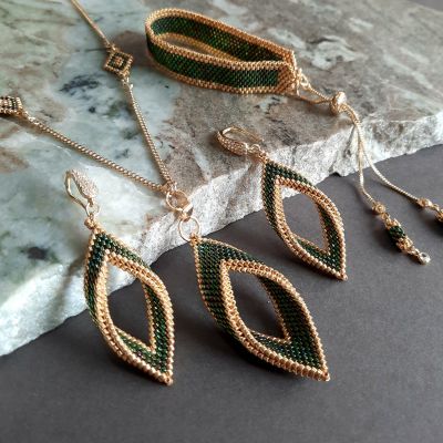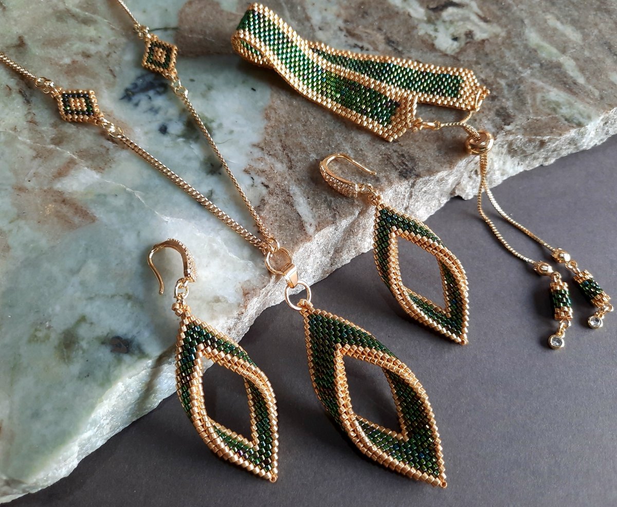 The set consists of a 60 cm long, extendable chain with a pendant inspired by tree leaves in a wavy green color with golden edges with a natural magic touch, shiny and luminous, with the addition of small-sized units that match the style and color of the necklace... and earrings with the same design... and a bracelet with a mixture of wavy green and gold. And a ring with the same design.. Made entirely of Japanese Miyuki beads.. All metal materials used are not susceptible to rust or changing color.. The weight is very light.