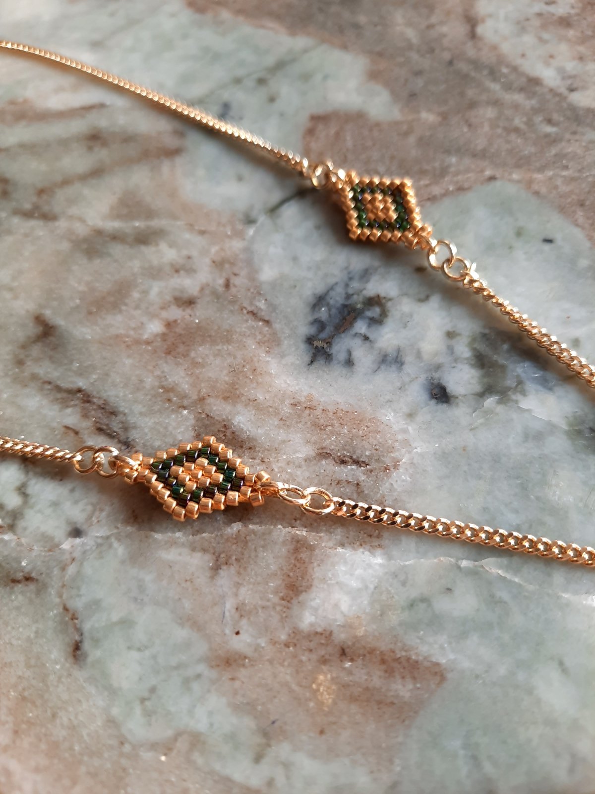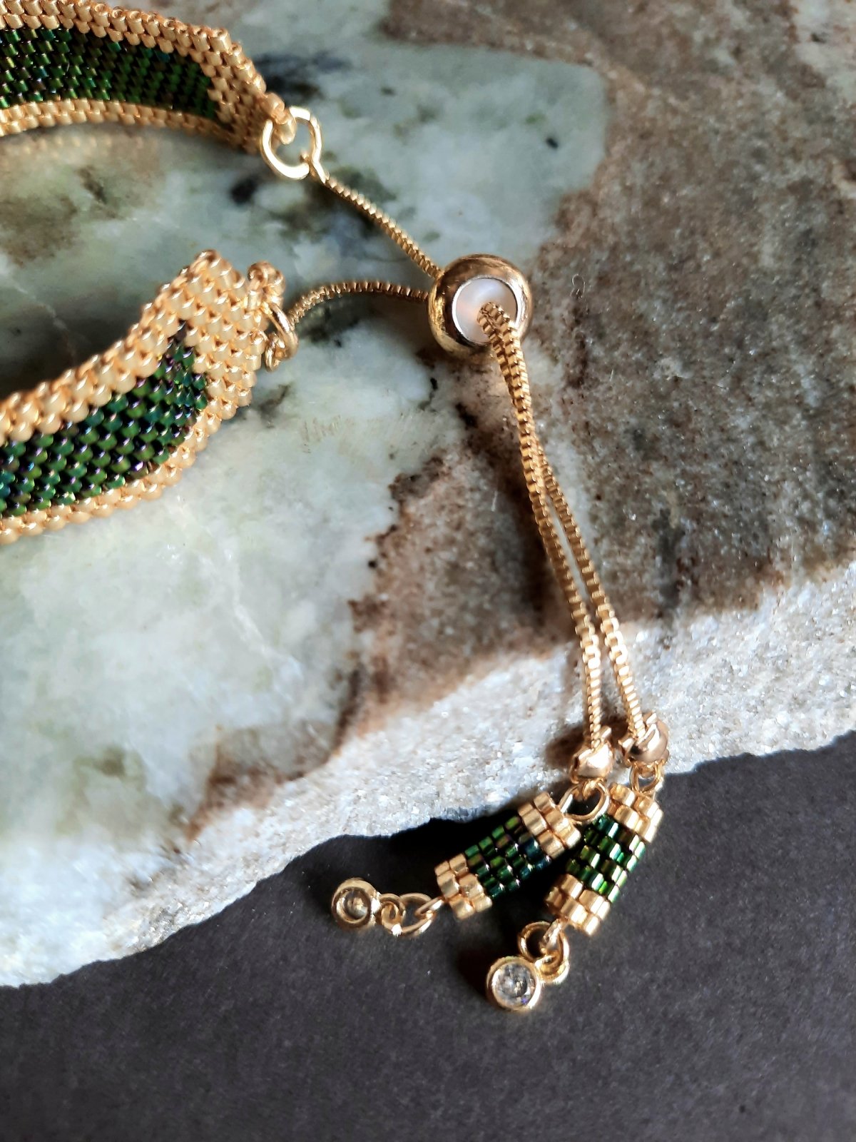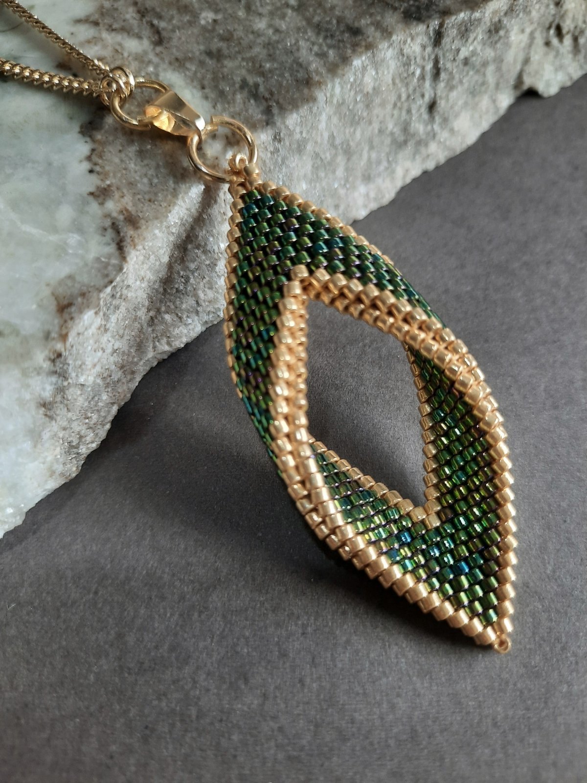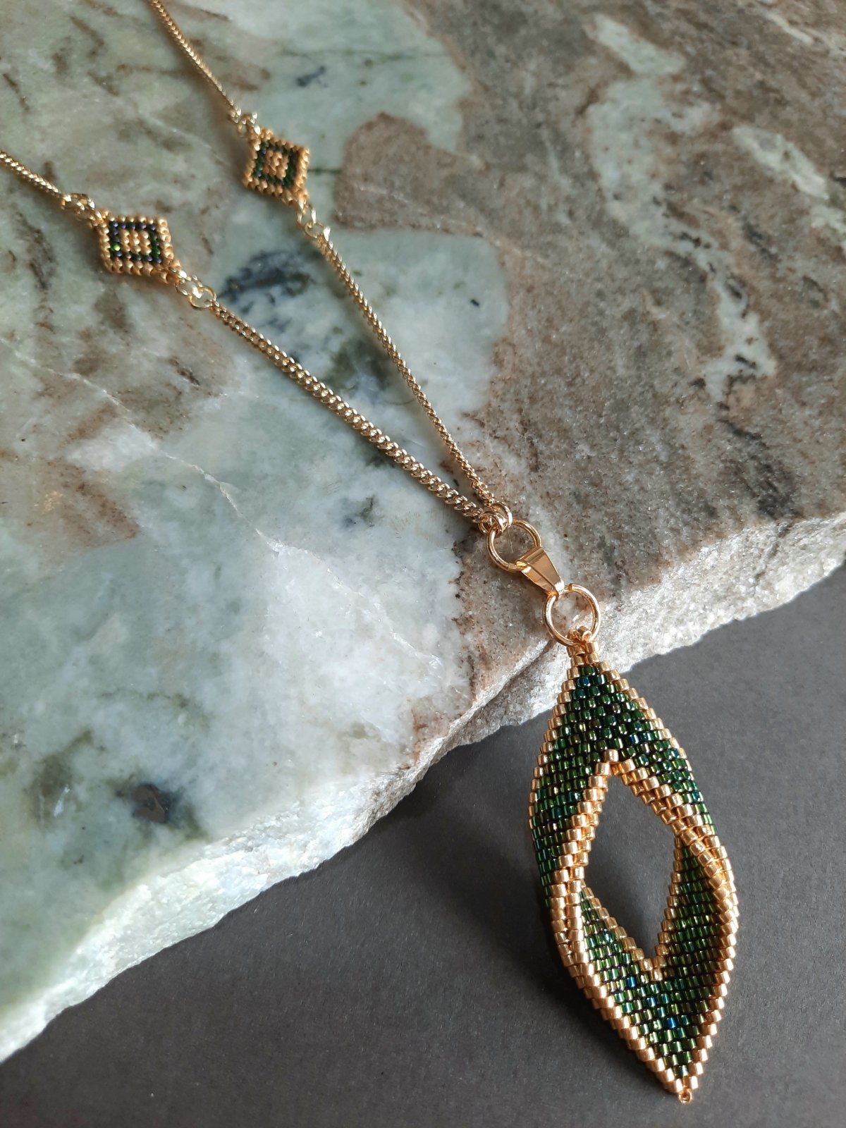 The set consists of a 60 cm long, extendable chain with a pendant inspired by tree leaves in a wavy green color with golden edges with a natural magic touch, shiny and luminous, with the addition of small-sized units that match the style and color of the necklace... and earrings with the same design... and a bracelet with a mixture of wavy green and gold. And a ring with the same design.. Made entirely of Japanese Miyuki beads.. All metal materials used are not susceptible to rust or changing color.. The weight is very light.