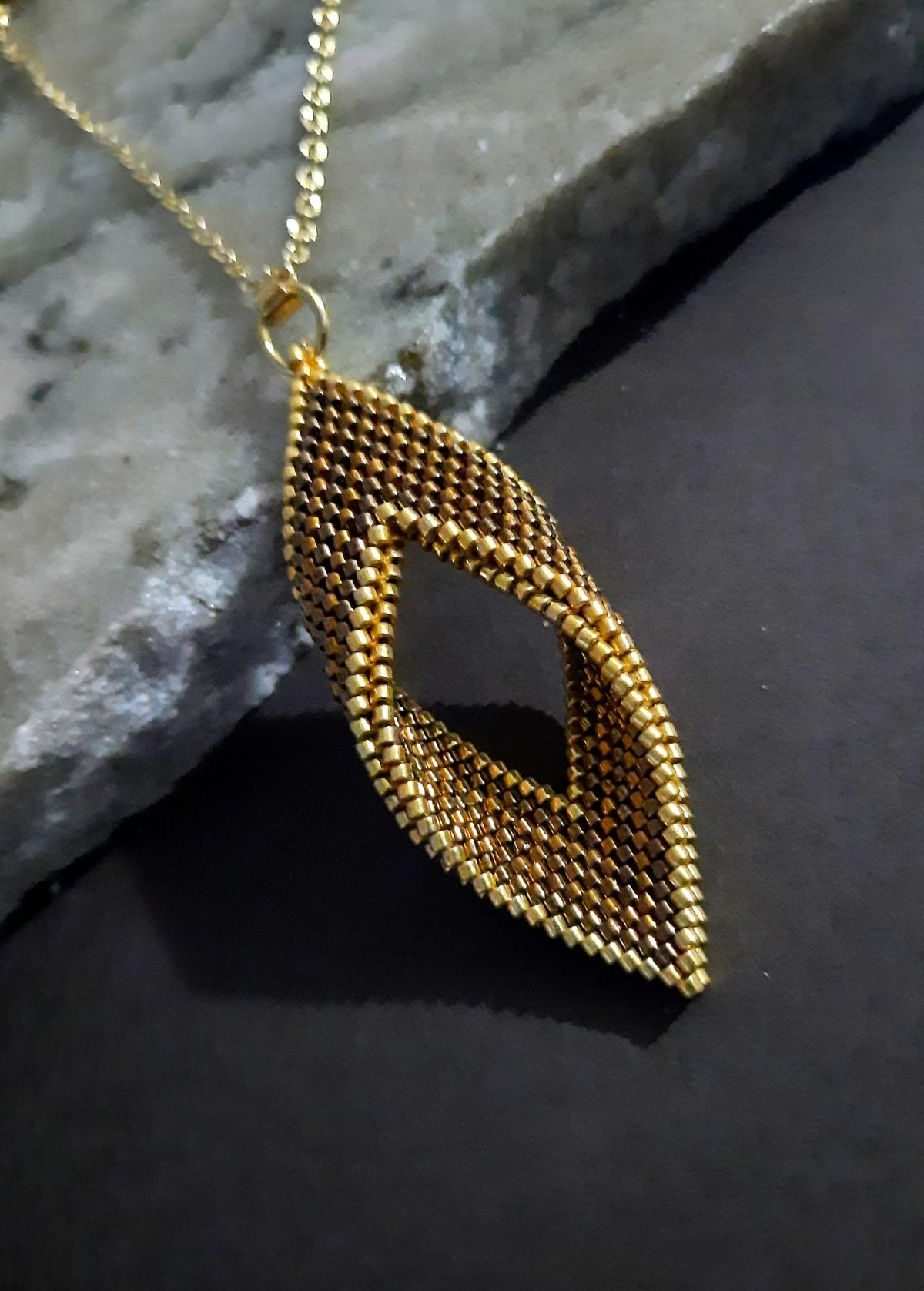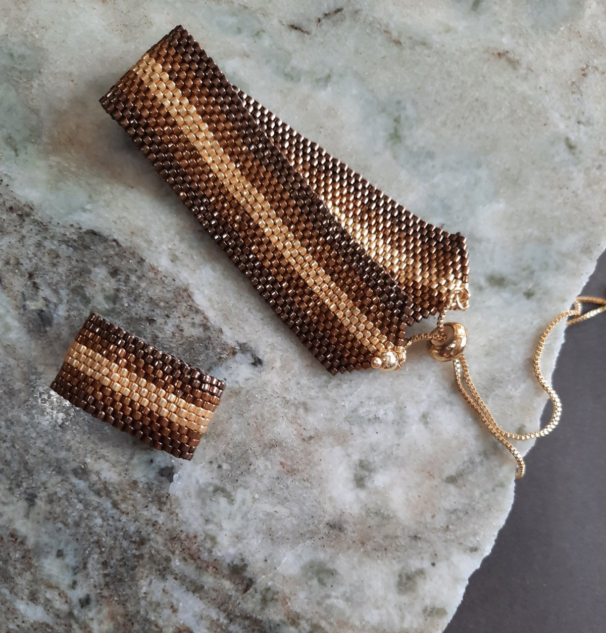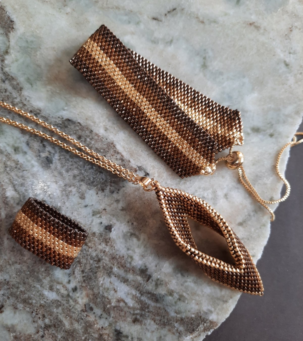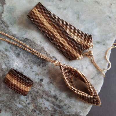 A set consisting of a bracelet with a gradation of brown, honey, and gold and a ring of the same style.. In addition to a 60 cm extendable chain with a pendant inspired by tree leaves in a gradation of the same colors with golden edges for a distinctive and magical touch.. Made entirely of Japanese Miyuki beads.. All The metal materials used do not rust and change color. The weight is very light..