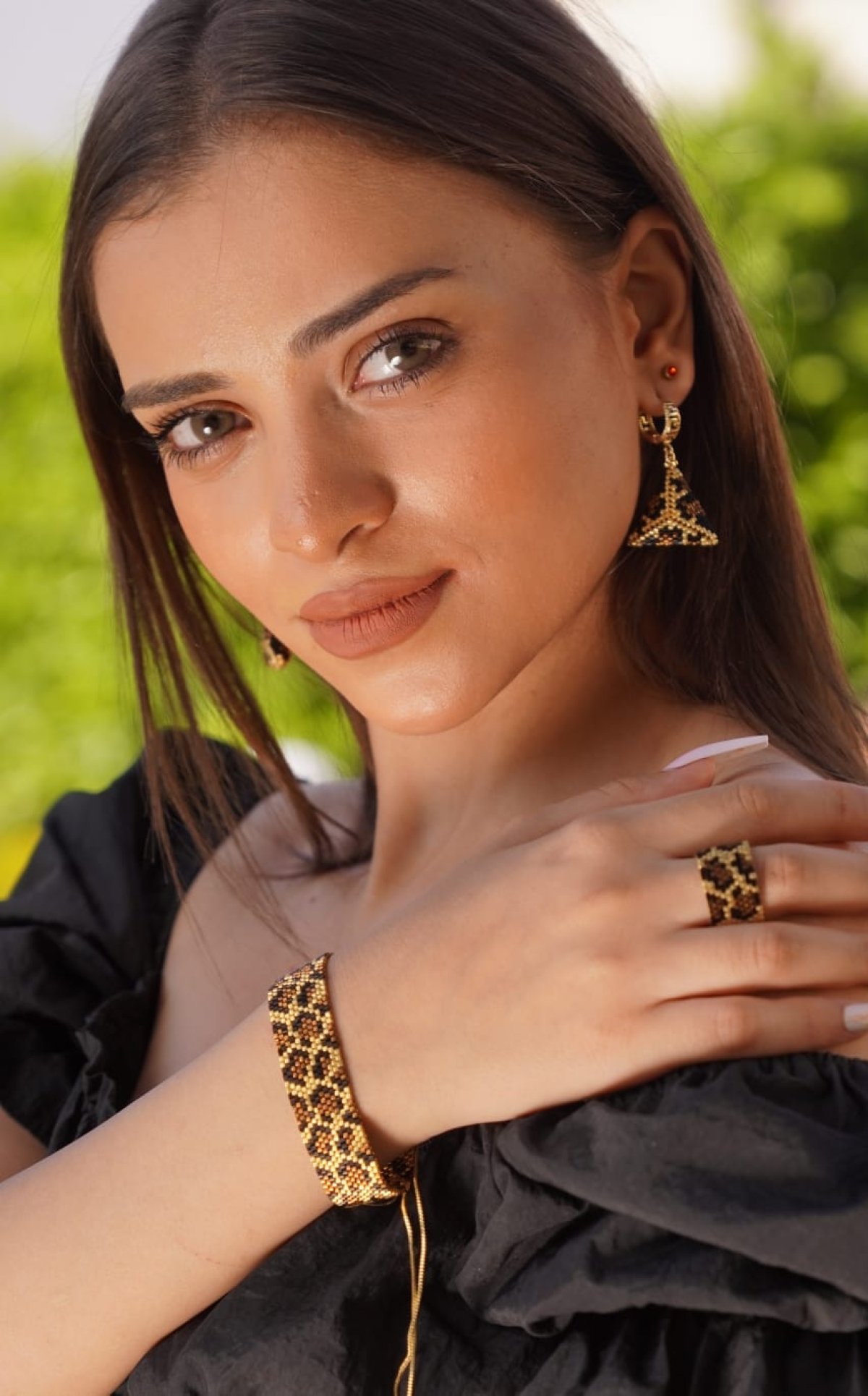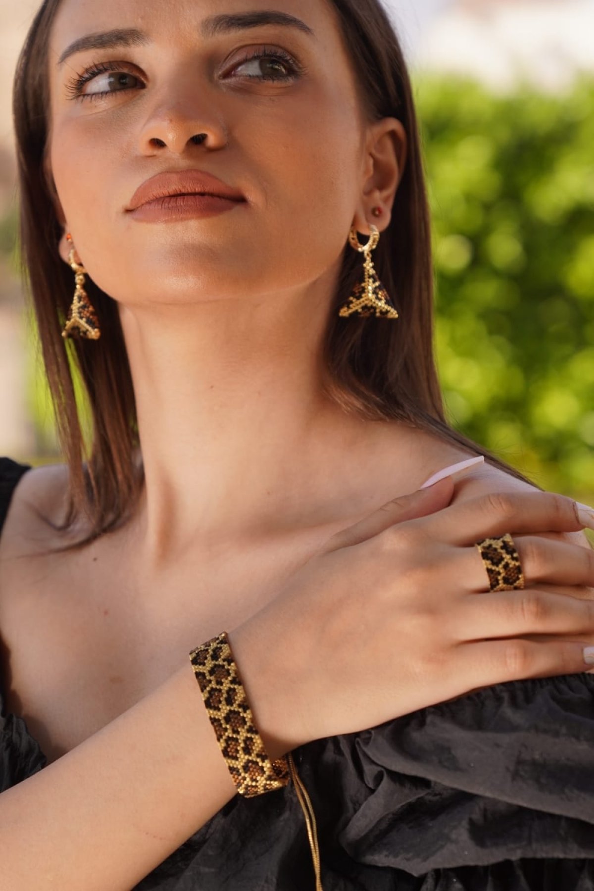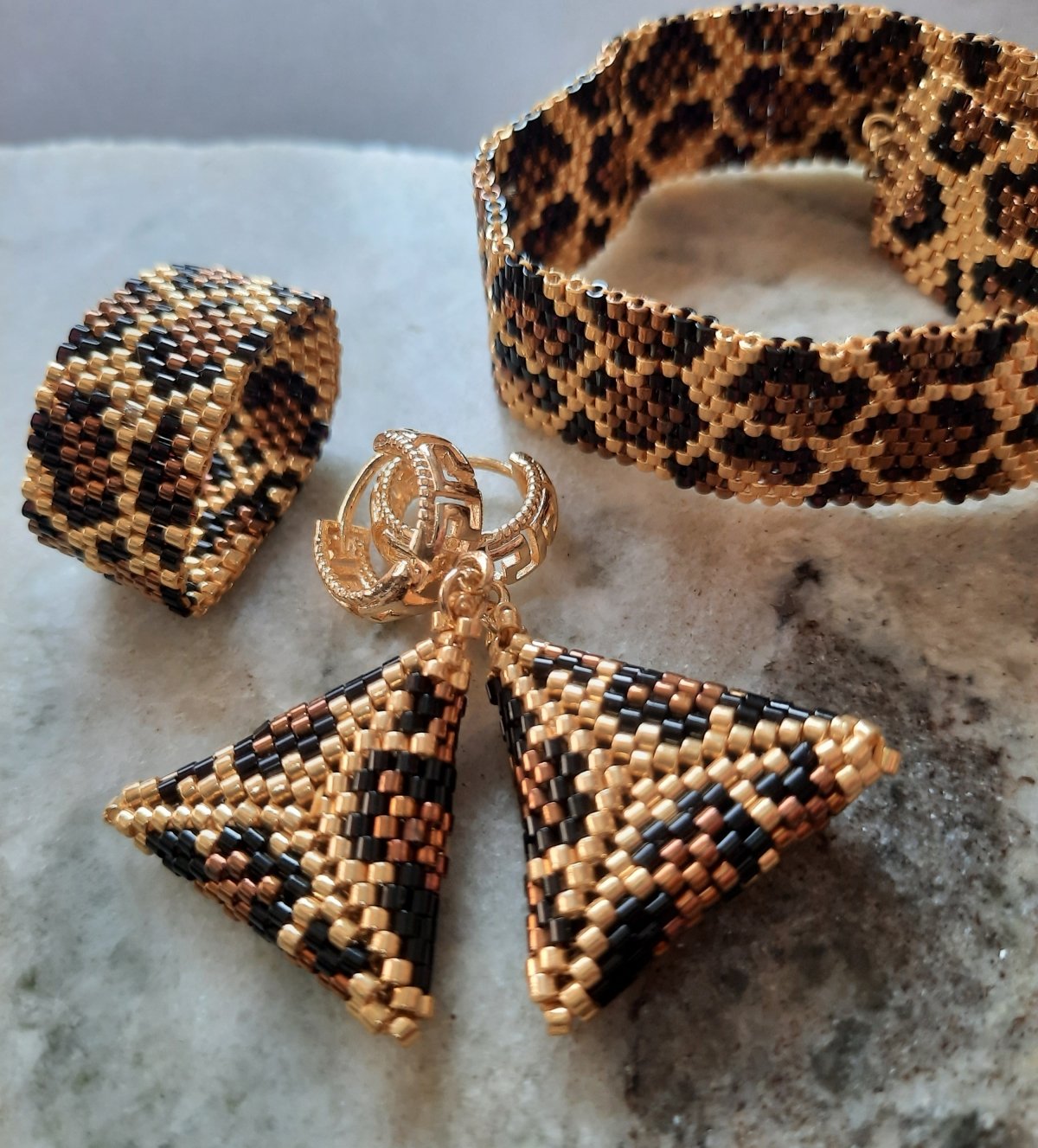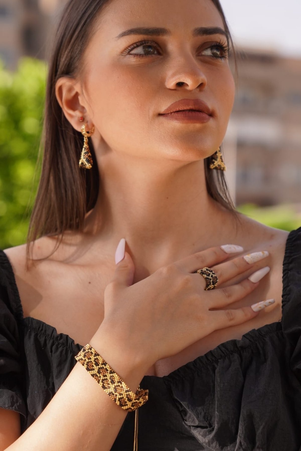 The set consists of a bracelet designed in leopard skin colors, based on gold and honey, outlined in black in a shiny and elegant way.. and a ring of the same style.. and earrings with a triangular design in the same leopard skin pattern in a new and different way.. All metal materials used are not rusty or discolorable. It causes allergies.. The weight is very light..