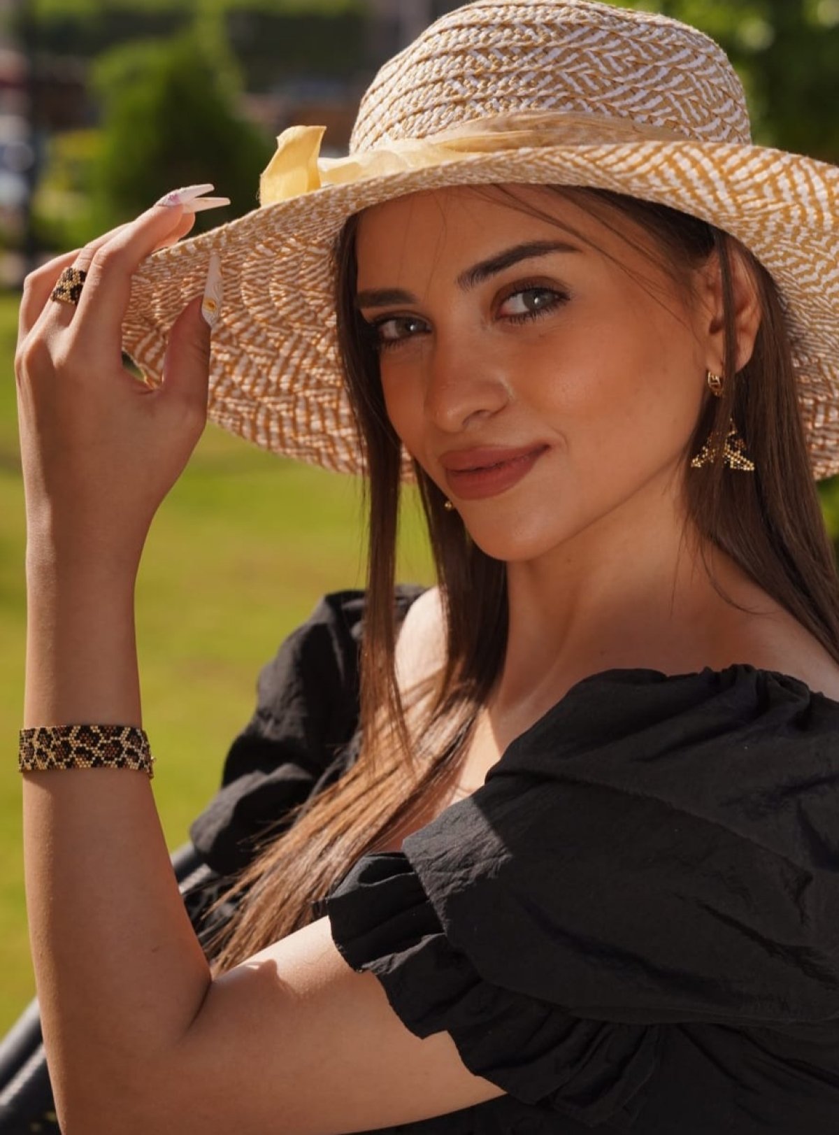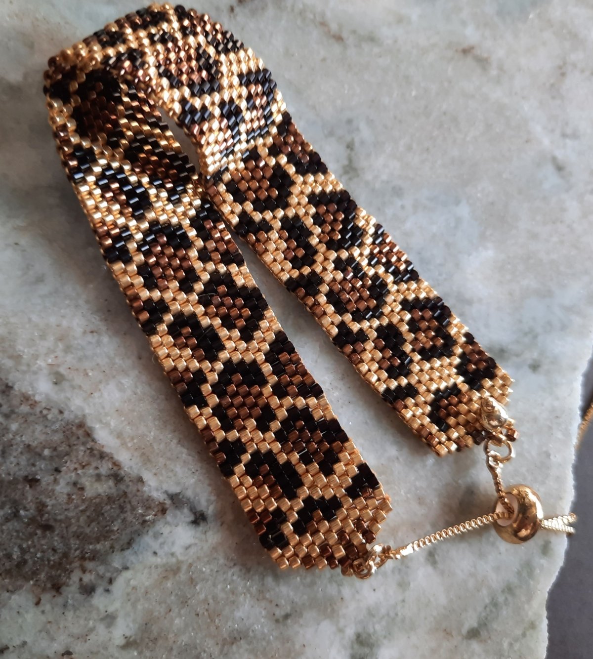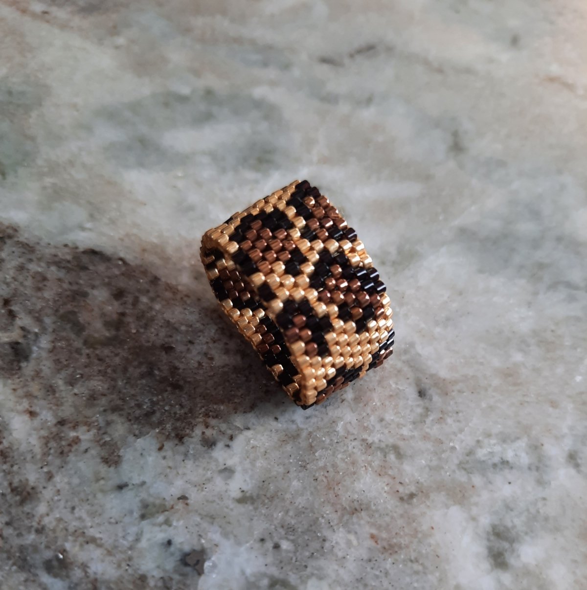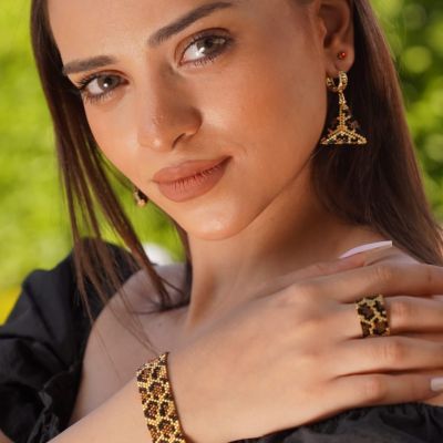 The set consists of a bracelet designed in leopard skin colors, based on gold and honey, outlined in black in a shiny and elegant way.. and a ring of the same style.. and earrings with a triangular design in the same leopard skin pattern in a new and different way.. All metal materials used are not rusty or discolorable. It causes allergies.. The weight is very light..