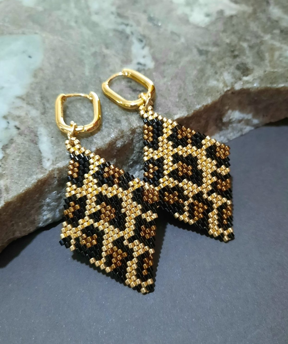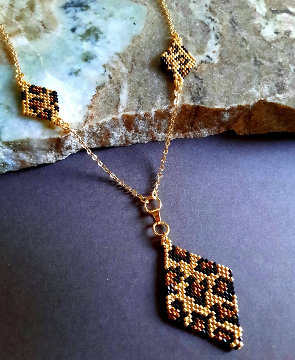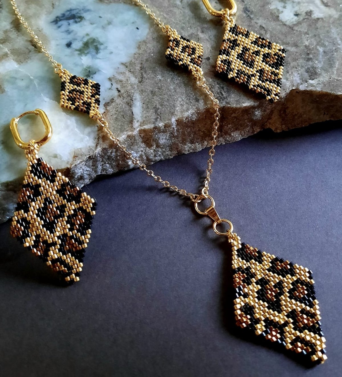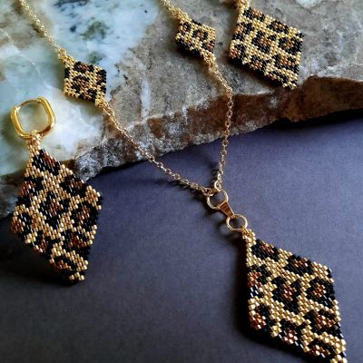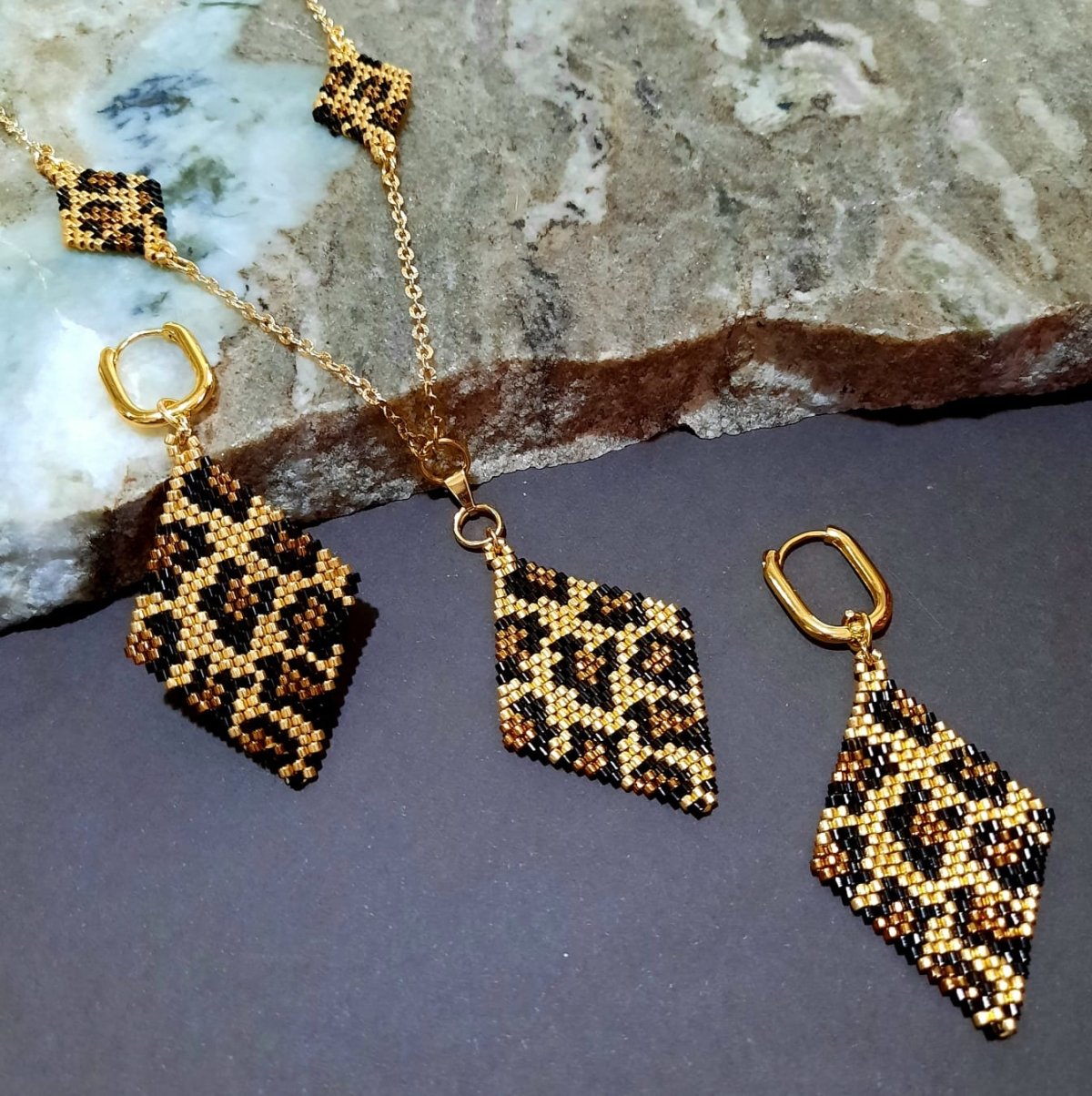 The set consists of a 60 cm long, extendable chain in the shape of a geometric rhombus, designed in Tiger skin colors based on gold and honey, outlined in black in a shiny and elegant way. And earrings of the same style in a new and different shape. All metal materials used are not rusty or discolored and do not cause... Sensitivity...the weight is very light...