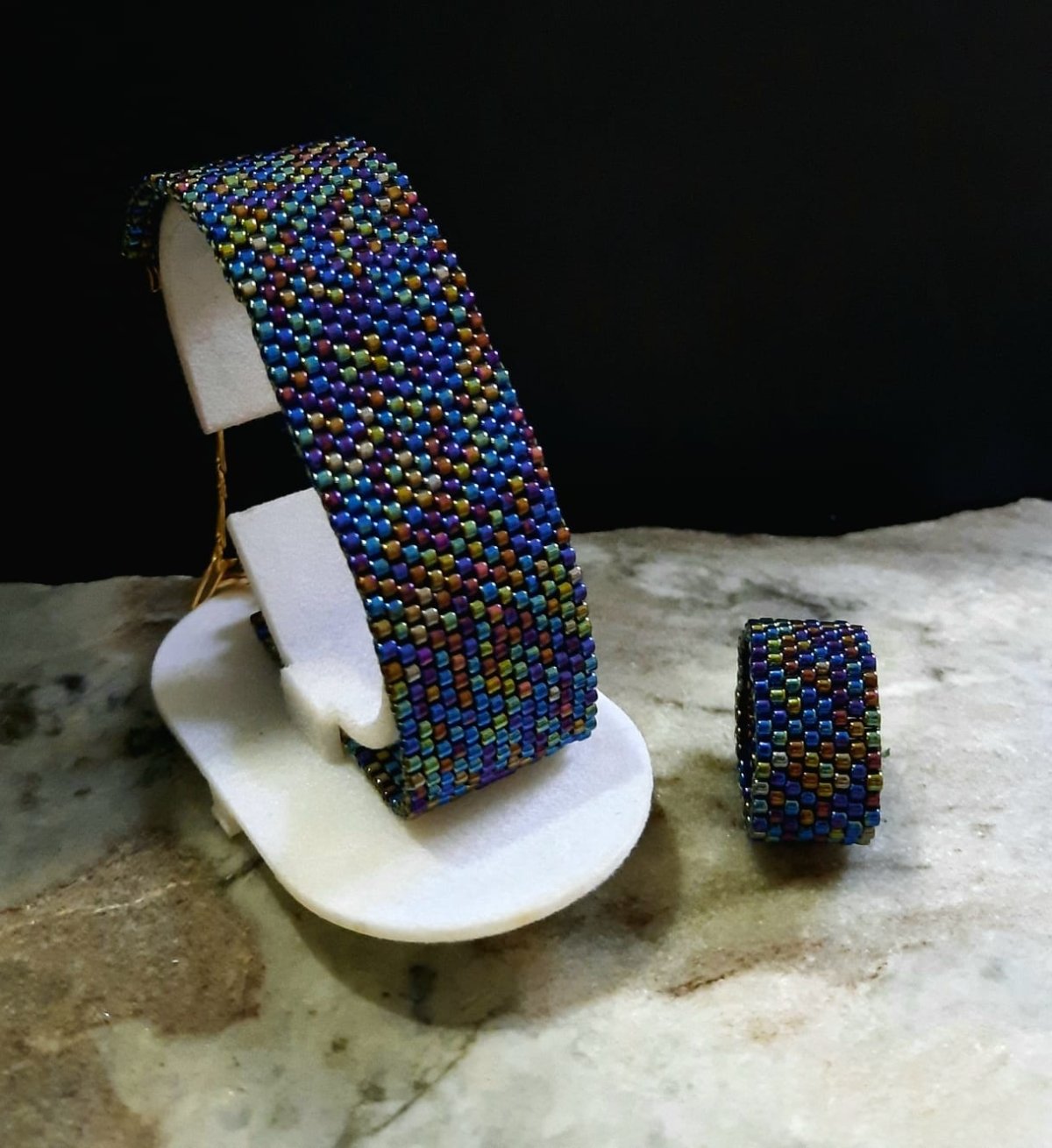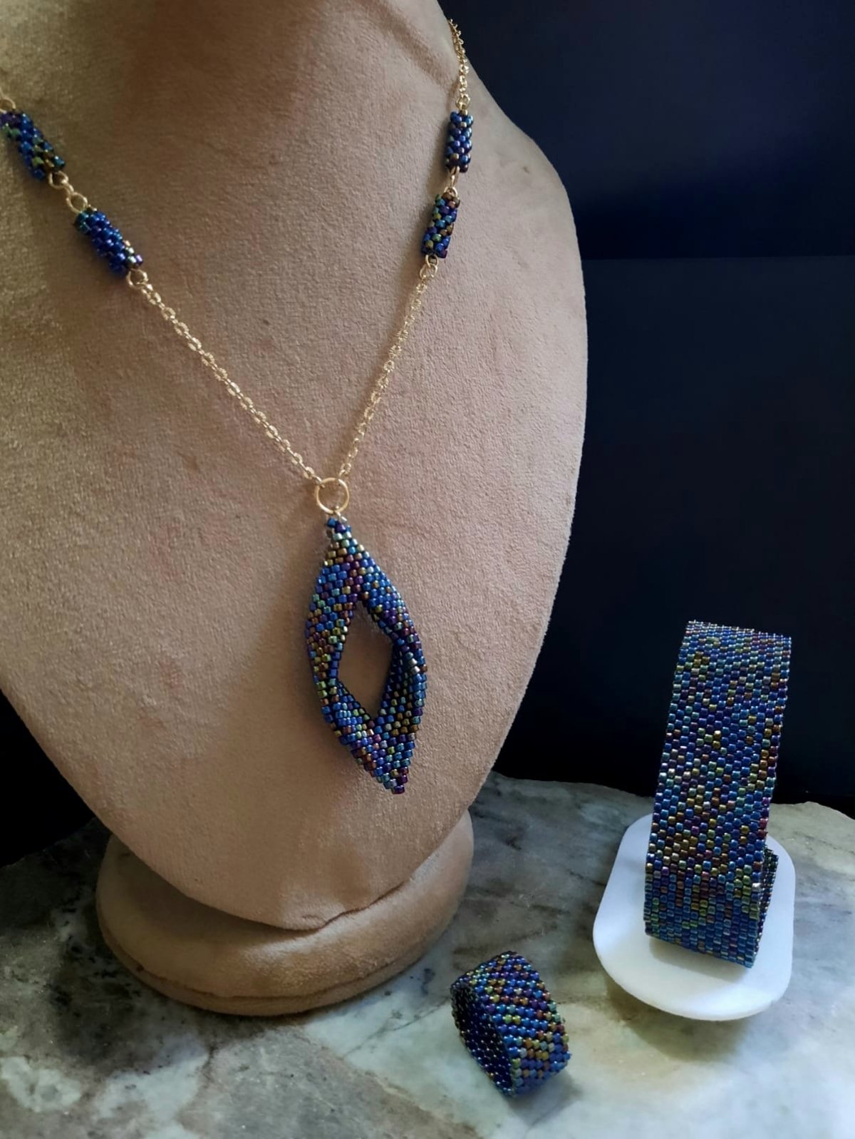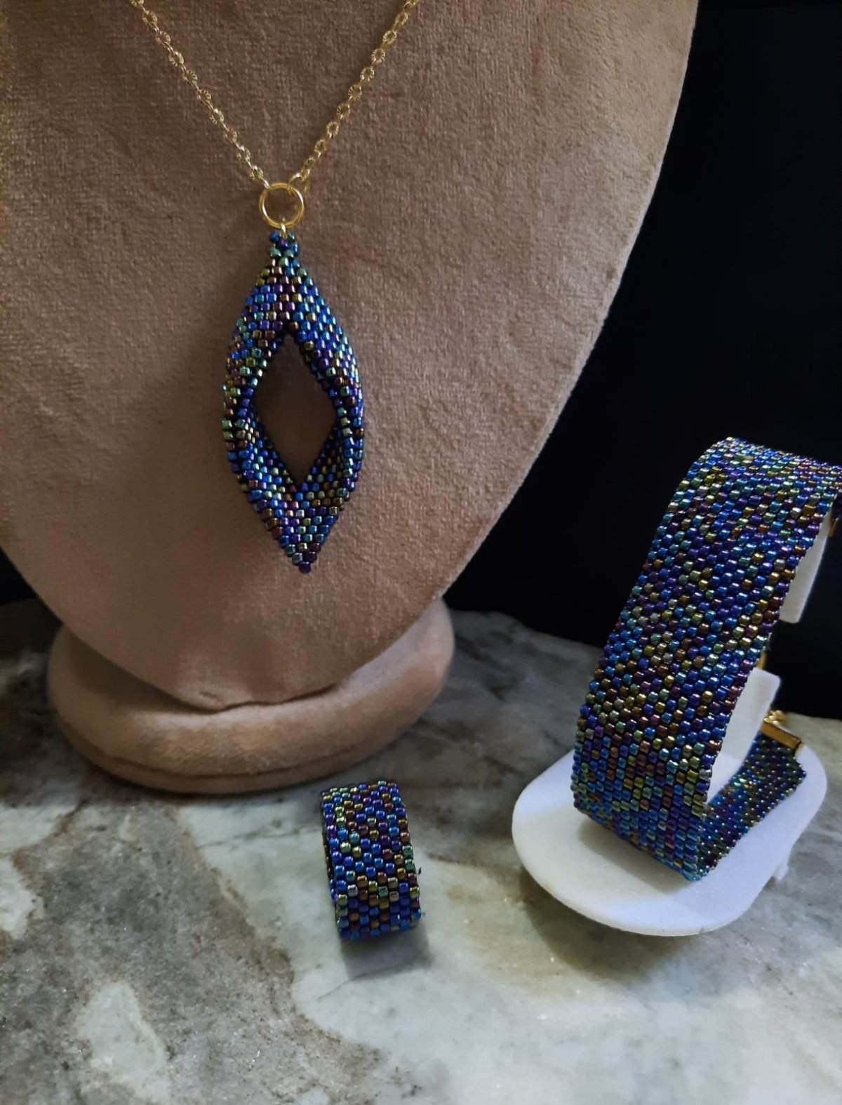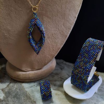 The set consists of a 60 cm long, extendable chain designed in the form of a leaf in the shiny, wavy blue color in a modern and elegant way, in addition to cylindrical units of the same color consistent with the necklace.. and a bracelet and ring in the same color.. Made entirely of Japanese Miyuki beads.. All metal materials used It does not rust or change color.. and does not cause allergies.. the weight is very light.