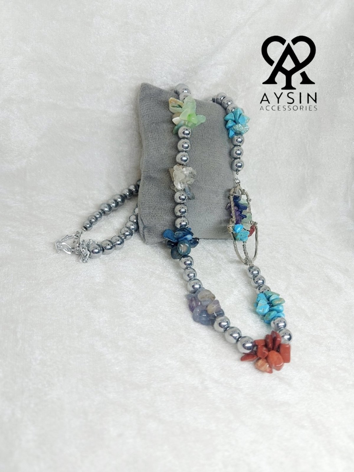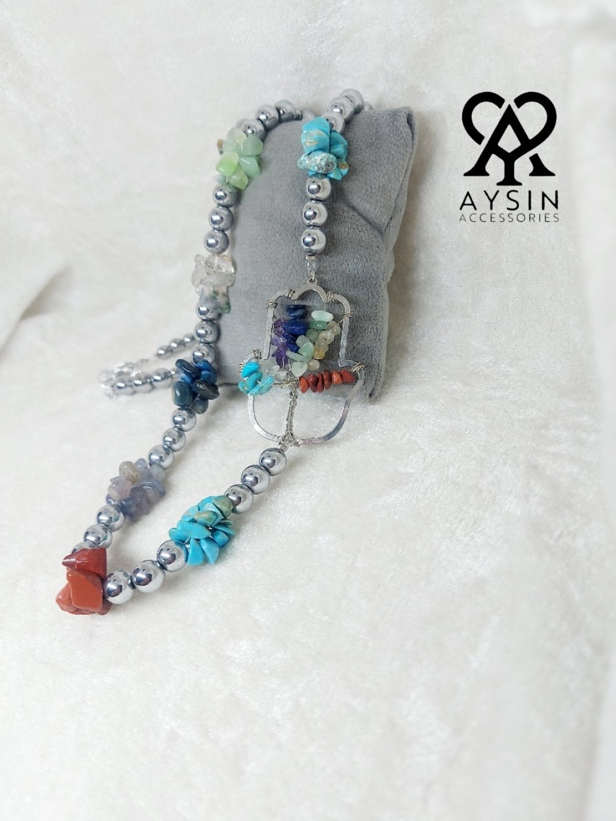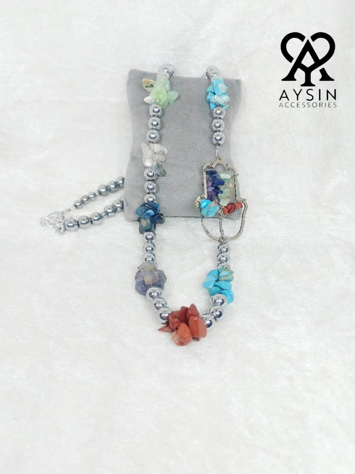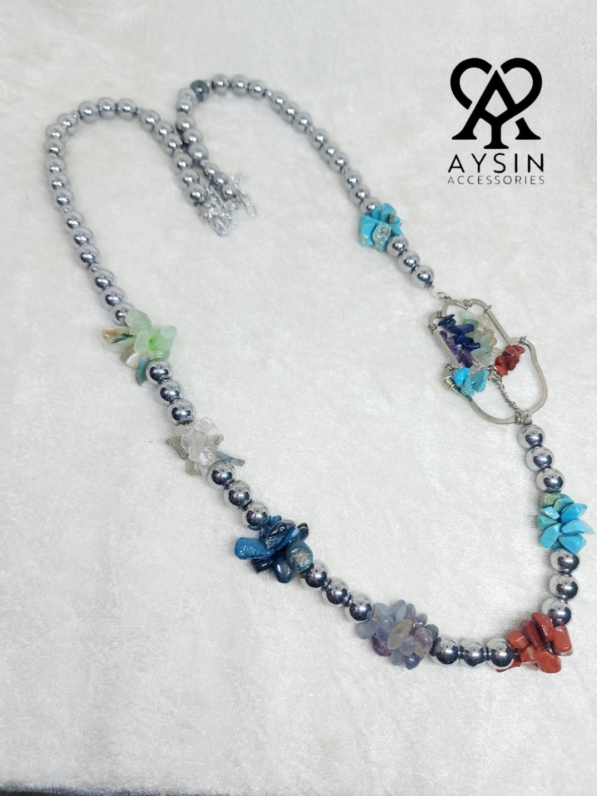 Necklace made of hematite stones and the seven chakra stones: turquoise, howlite, agate, tiger's eye, amethyst, and jasper. It comes with a silver-plated pendant and an adjustable chain for length control.
