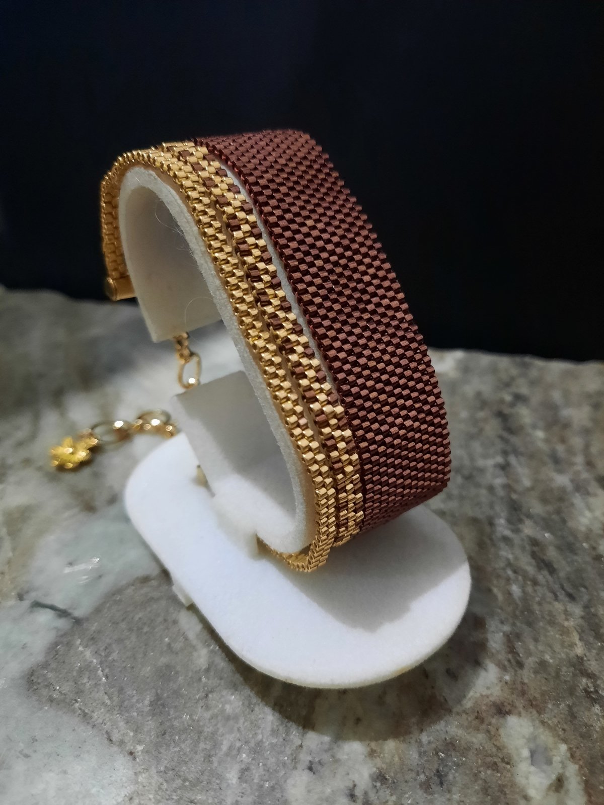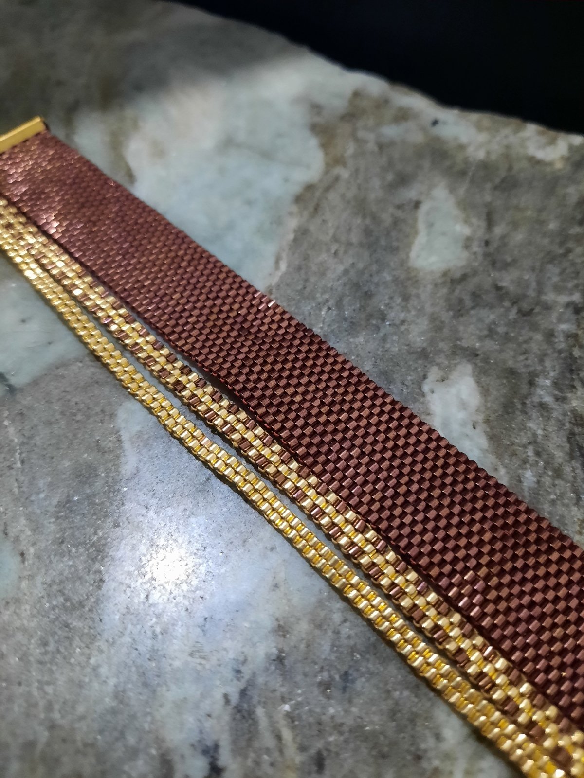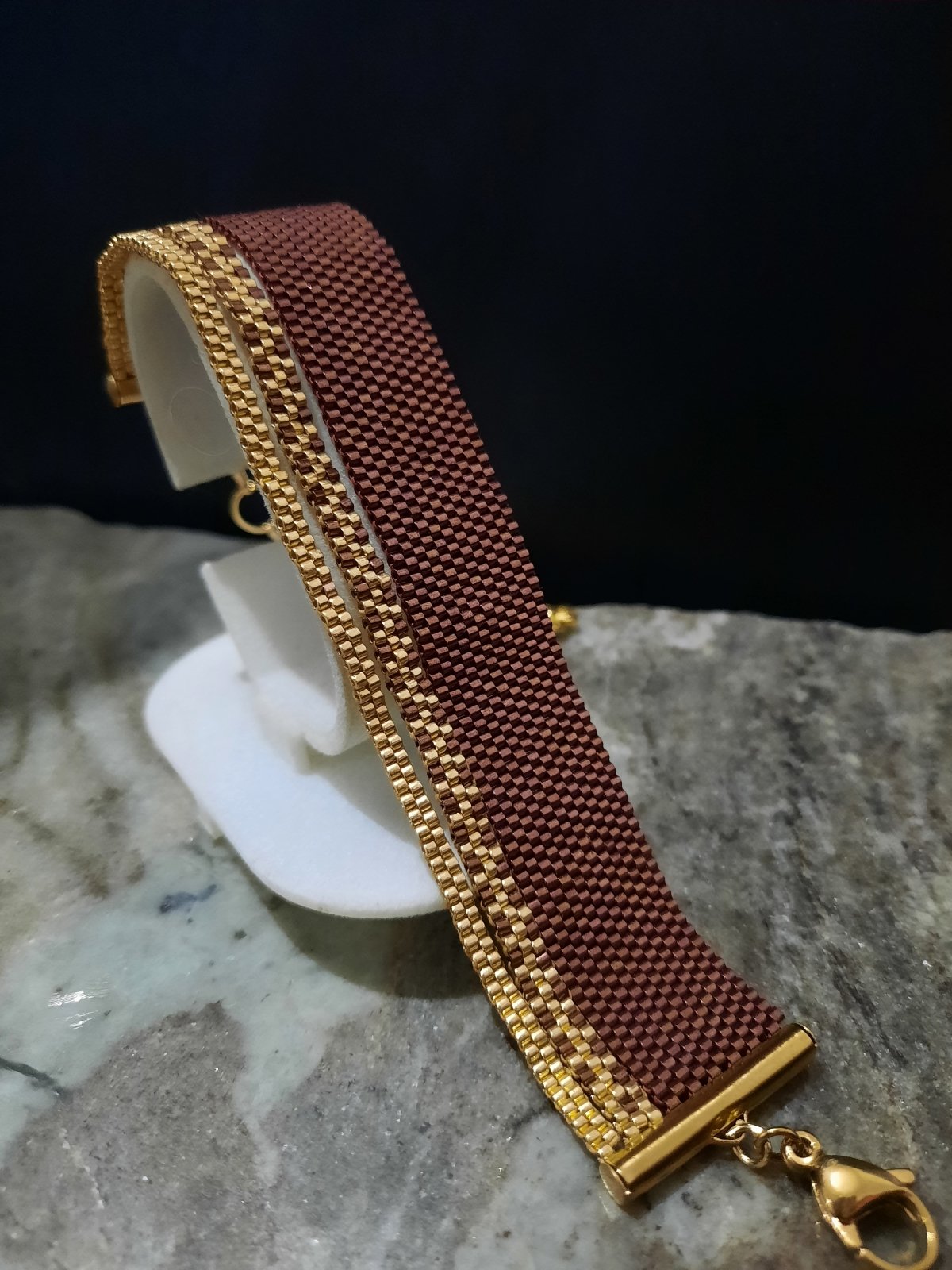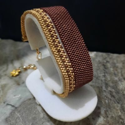 The bracelet consists of three separate homogeneous units of dark red and gold. The first is dark red only, the second is gold only, and the third is a mixture of dark red and gold with an elegant and attractive design. It is made entirely of Japanese Miyuki beads. All metal materials used are stainless and non-corrosive. It changes color and does not cause allergies. Its weight is very light ..