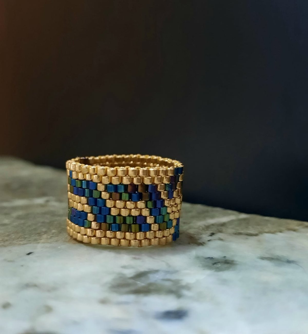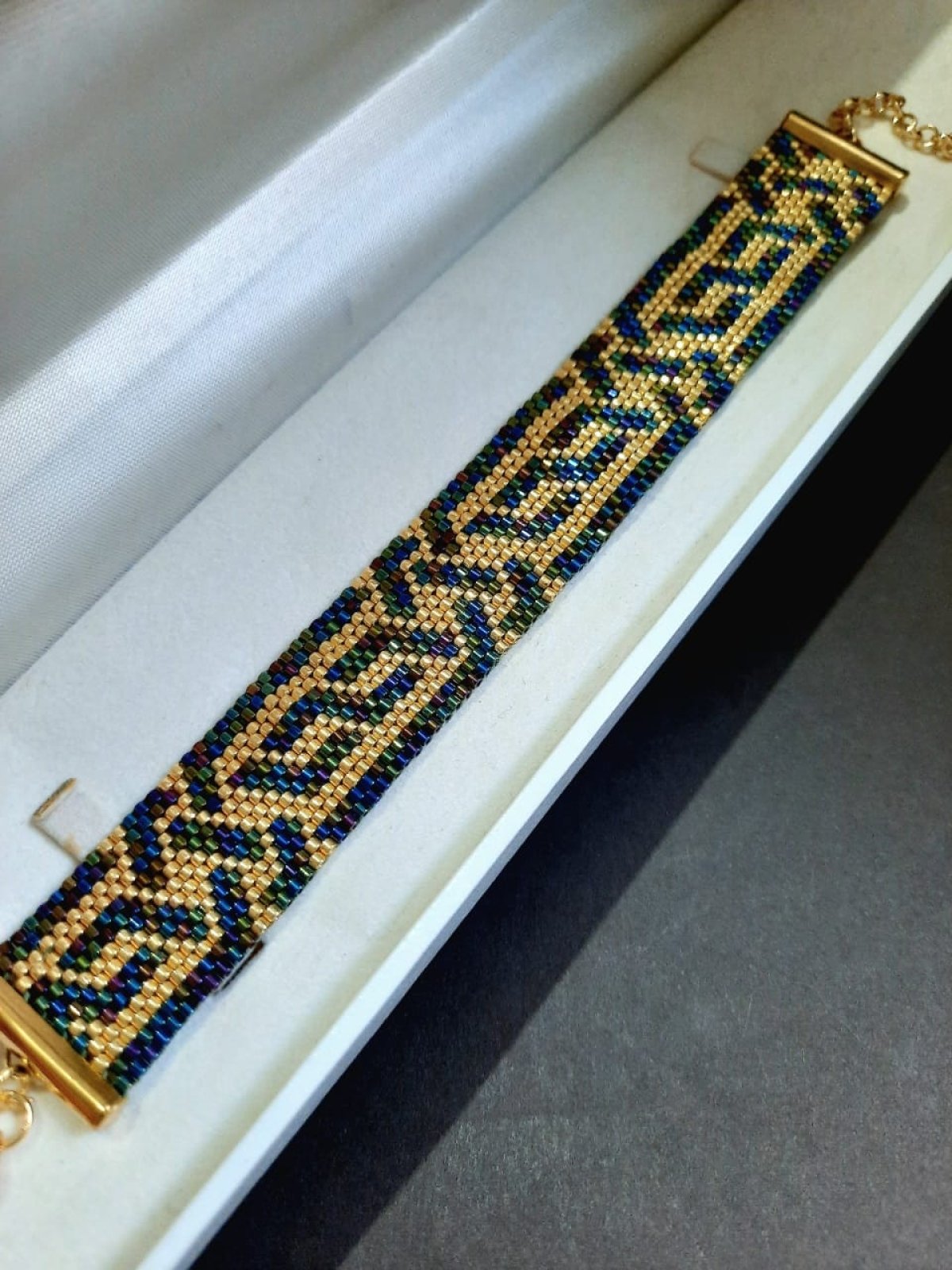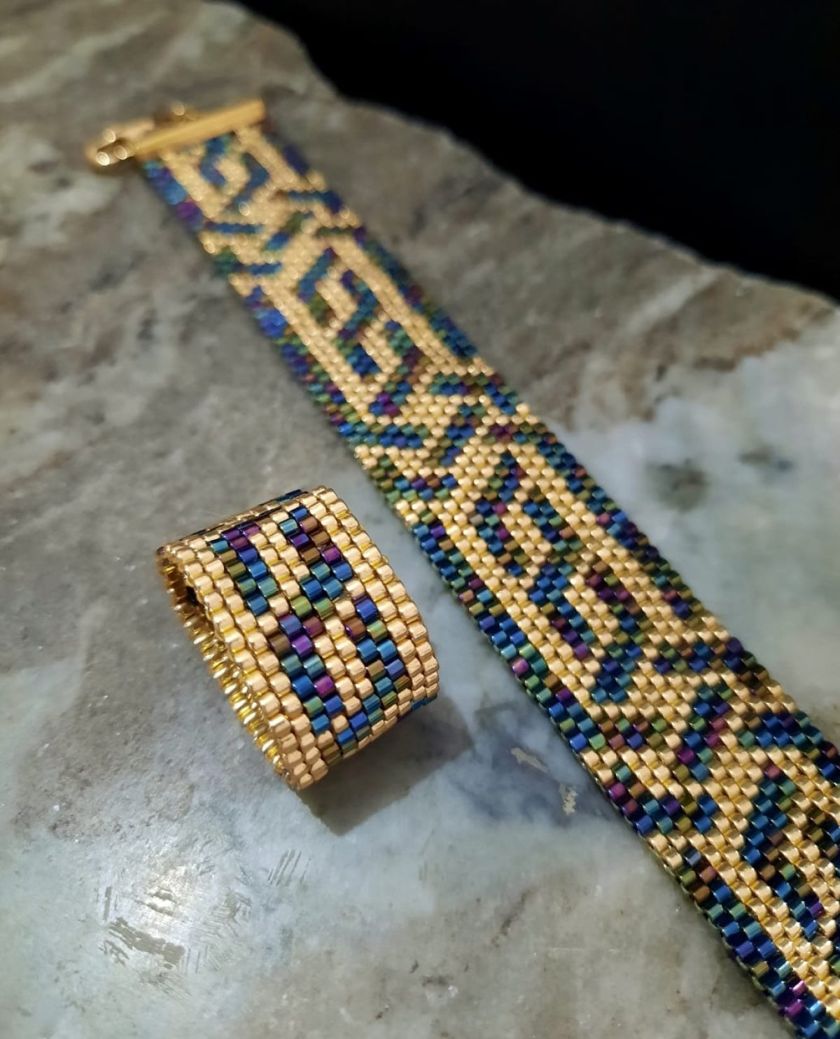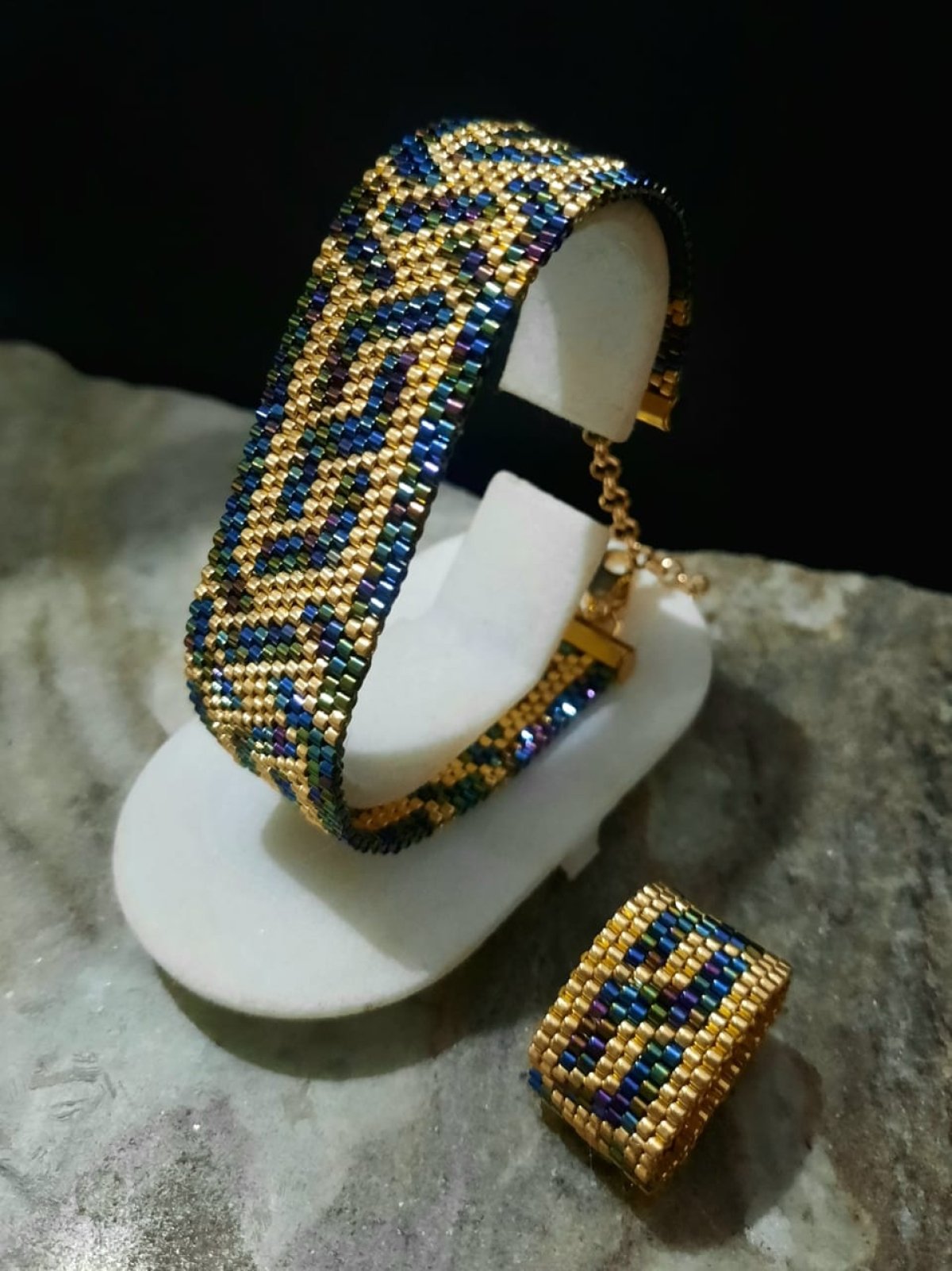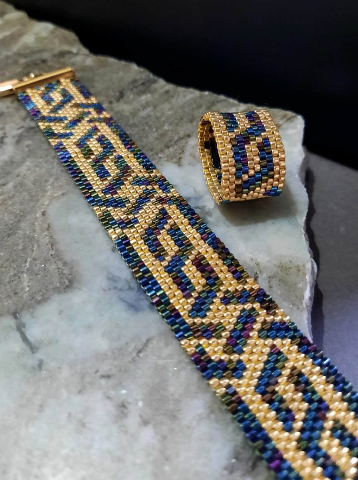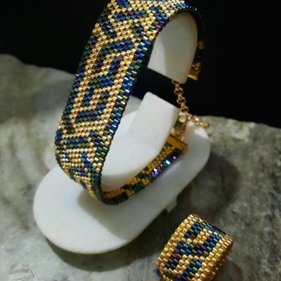 The bracelet is designed with a combination of wavy blue and gold, inspired by the Arabic style, with an attractive, elegant and shiny design.. In addition to a ring of the same design.. Made entirely of Japanese Miyuki beads.. All metal materials used are not rust-proof or change color and do not cause allergies. Its weight is very light ...