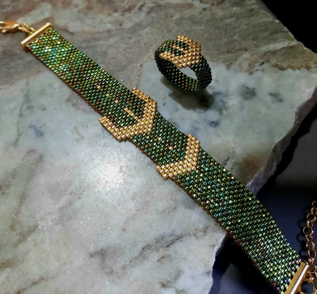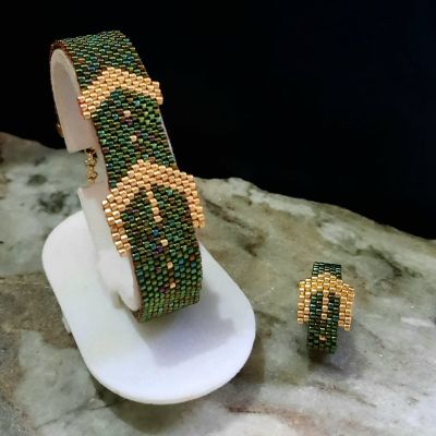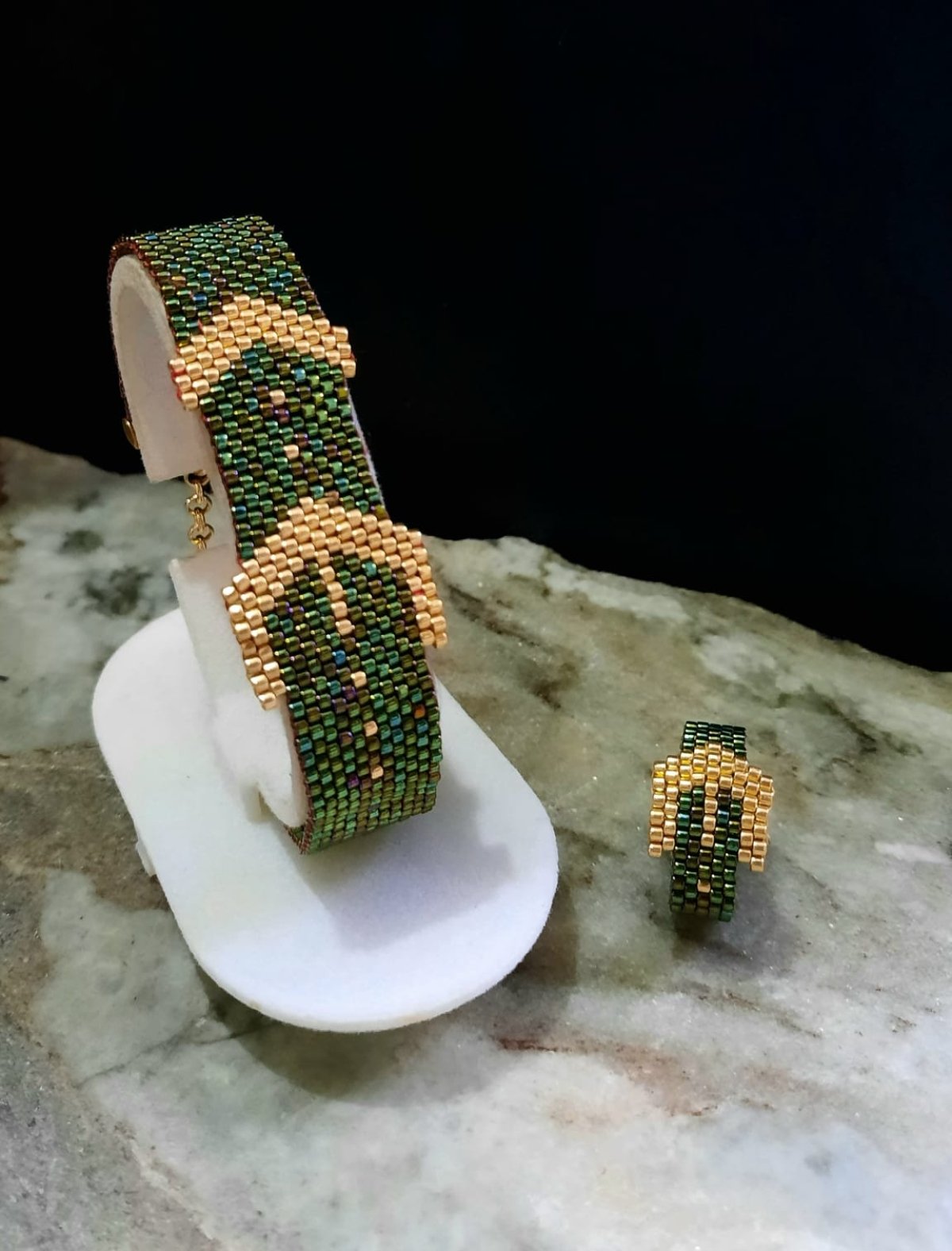 The set is a bracelet with a simple design for the belt, with two colors overlapping, the first is a basic color and the gold color is for the ornament.. And also a ring with the same design with a modern and elegant touch.. All metal materials used are not rusty or discolored and do not cause allergies... Its weight is very light.