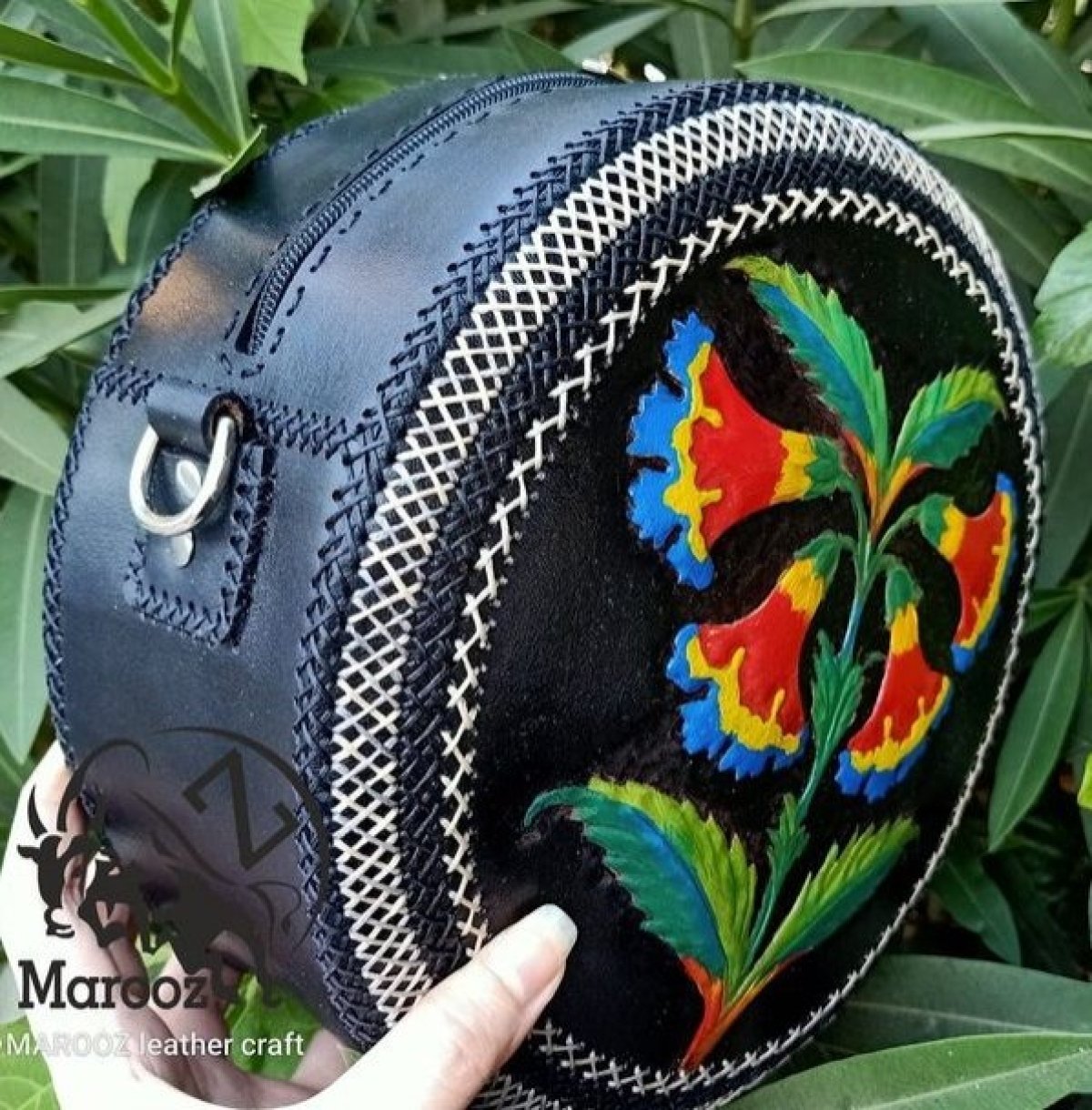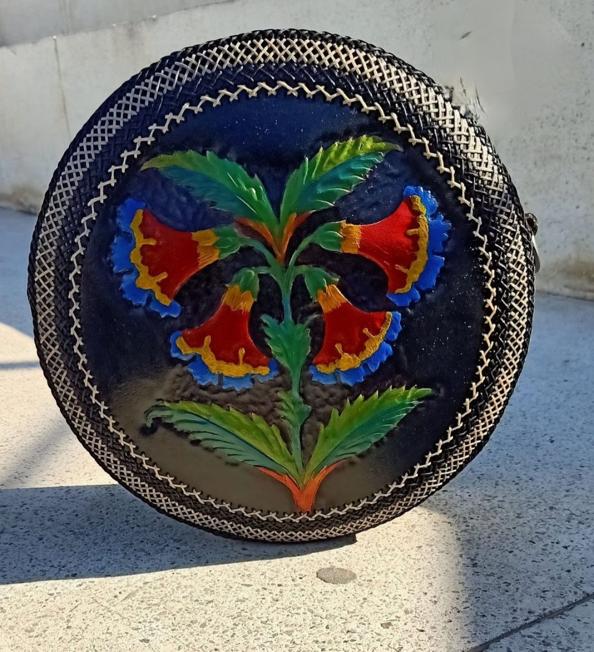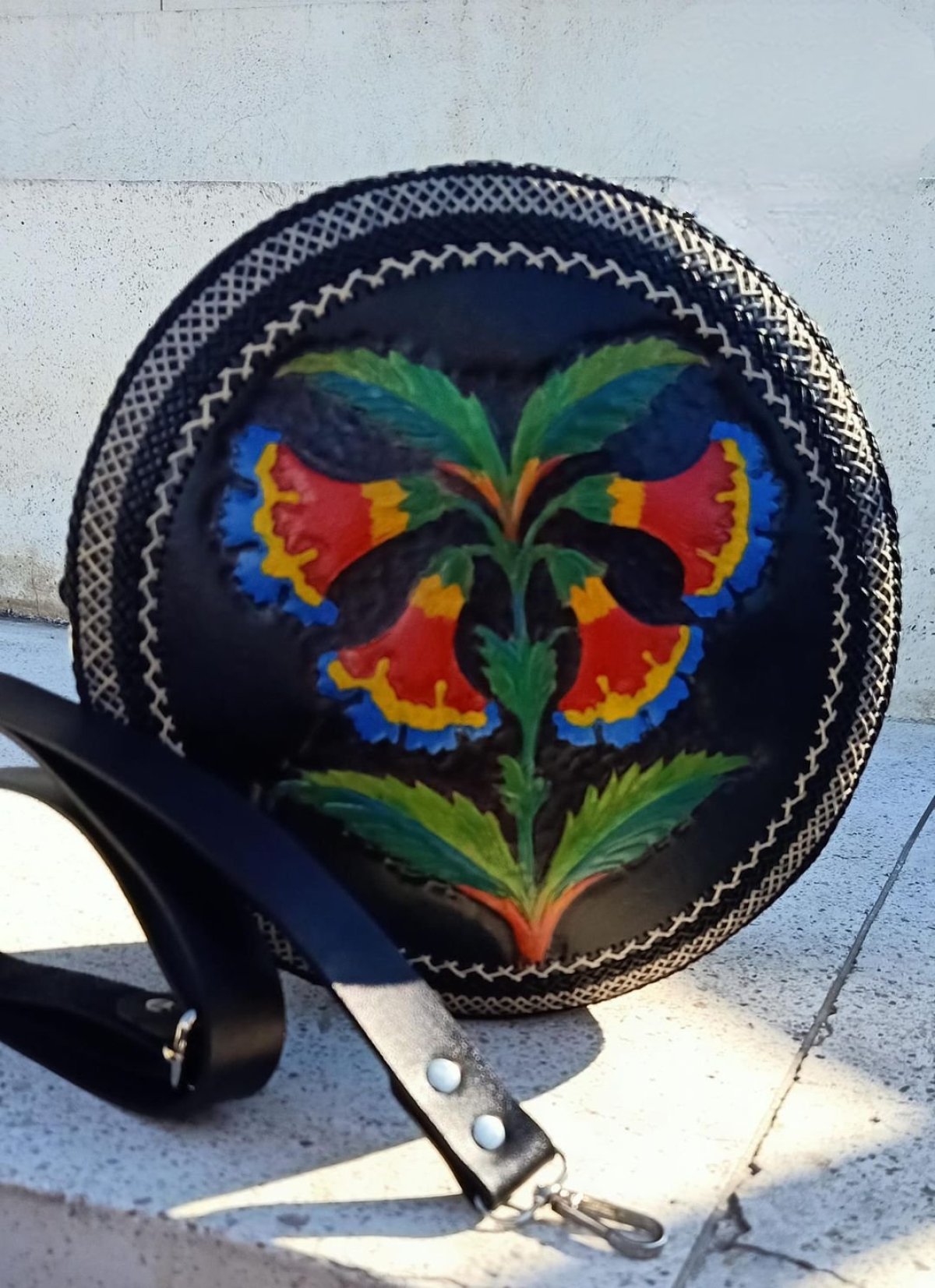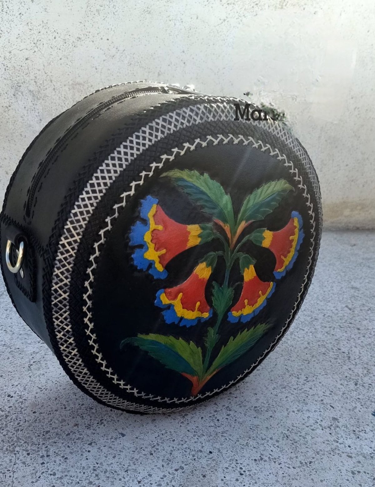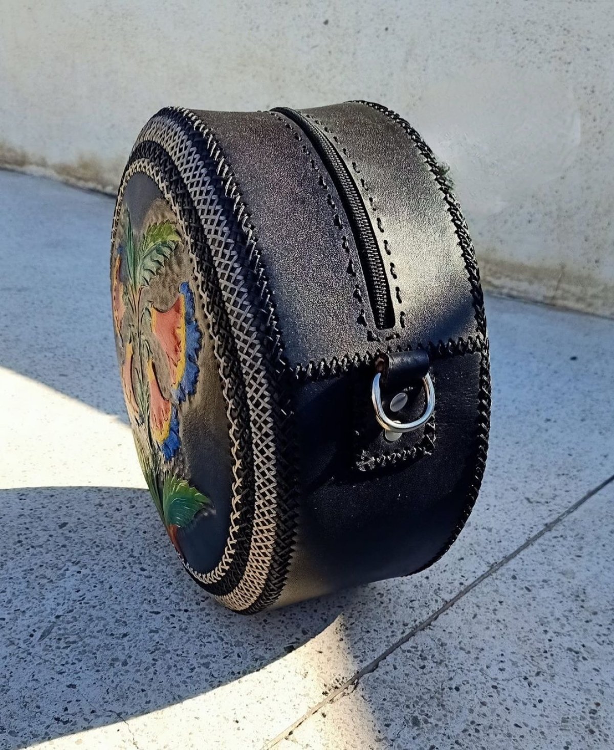 Round women's crossbody bag, cowhide on the outside, goatskin lining, diameter 26cm, depth 7cm, technique of hammering, engraving and taping on the leather, hand-coloured