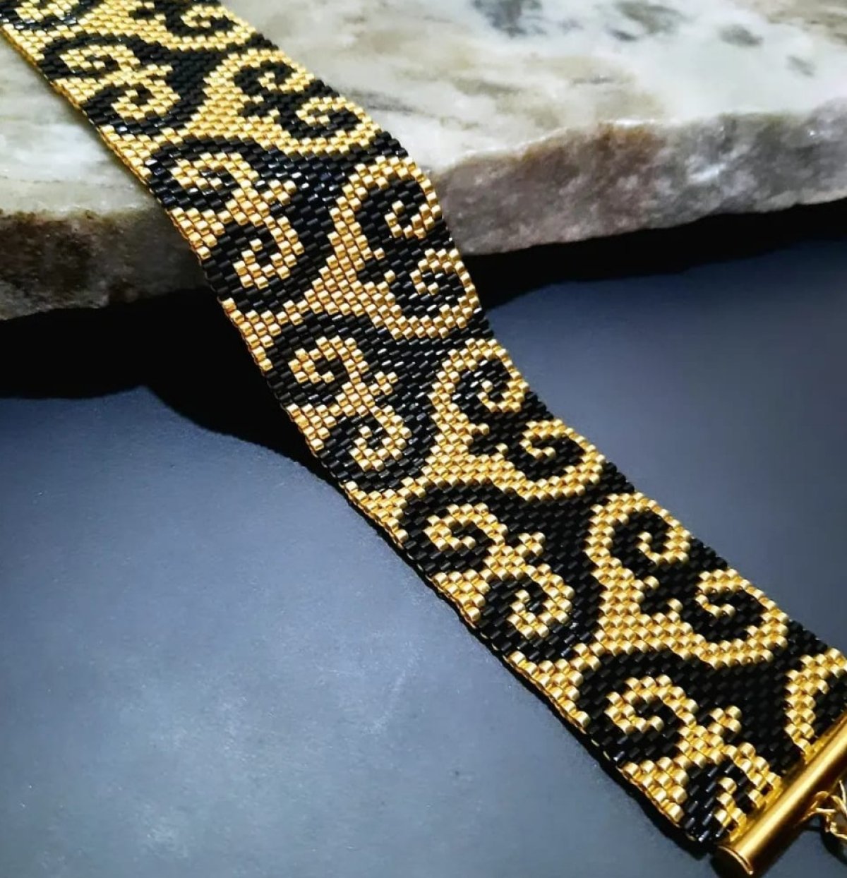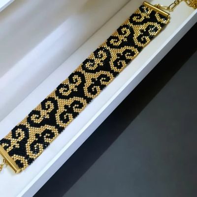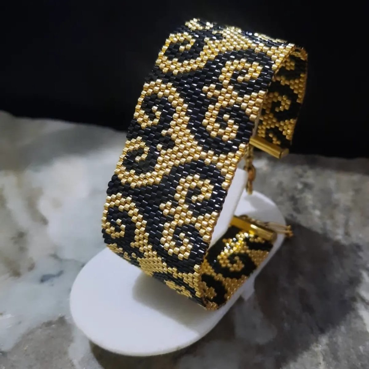 A bracelet inspired by the Arabic style, with a coordinated pattern of gold and black colors, with a luxurious and magical shiny touch.. Made entirely of Japanese Miyuki beads.. All metal materials used are not rusted or discolored and do not cause allergies.. Its weight is very light..