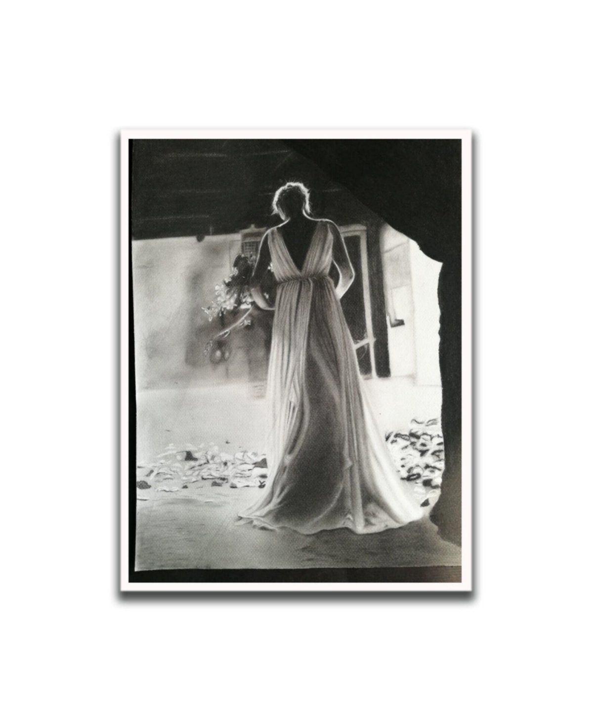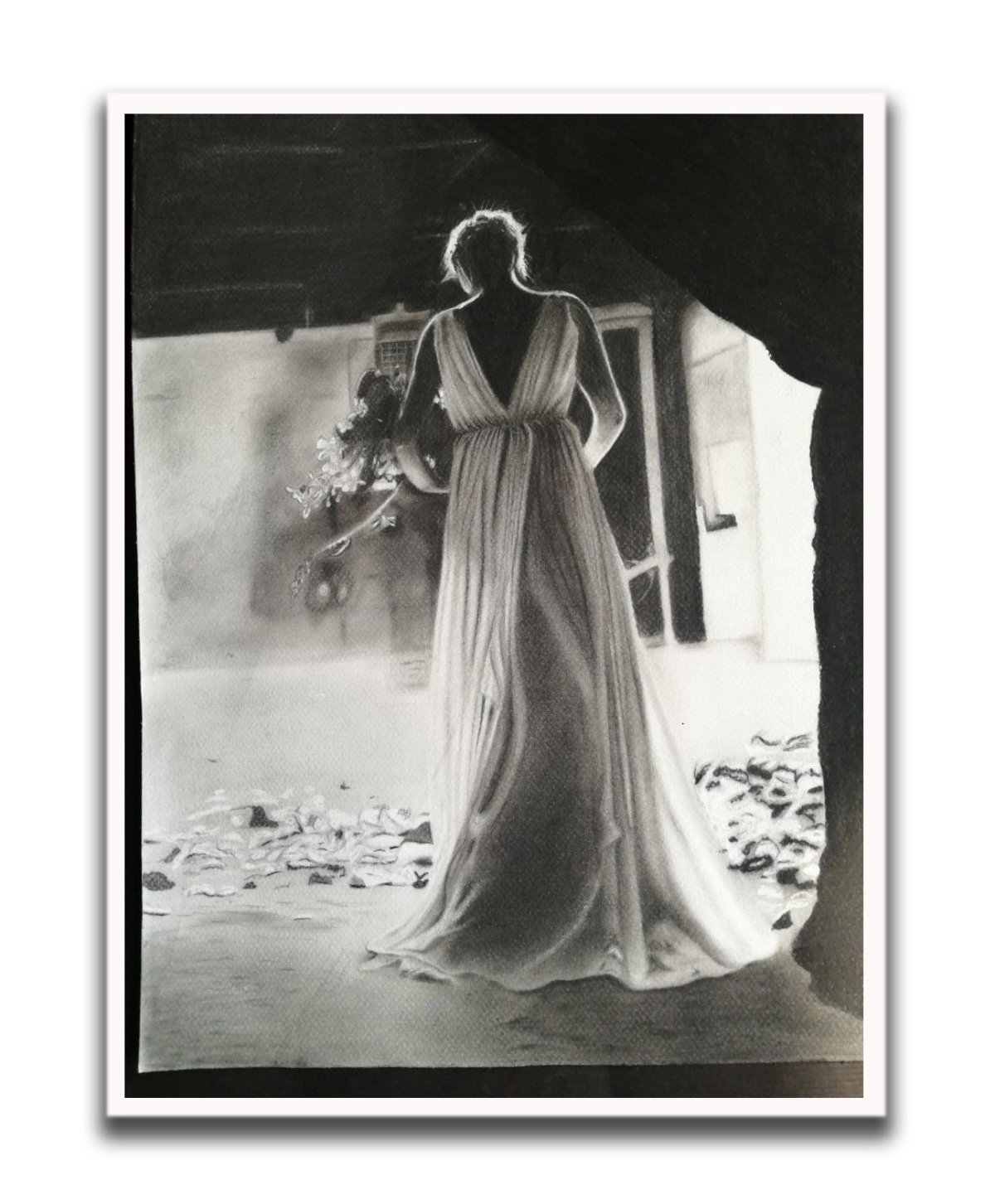 Drawing a girl with black and white charcoal on white Canson paper