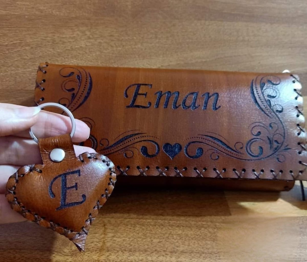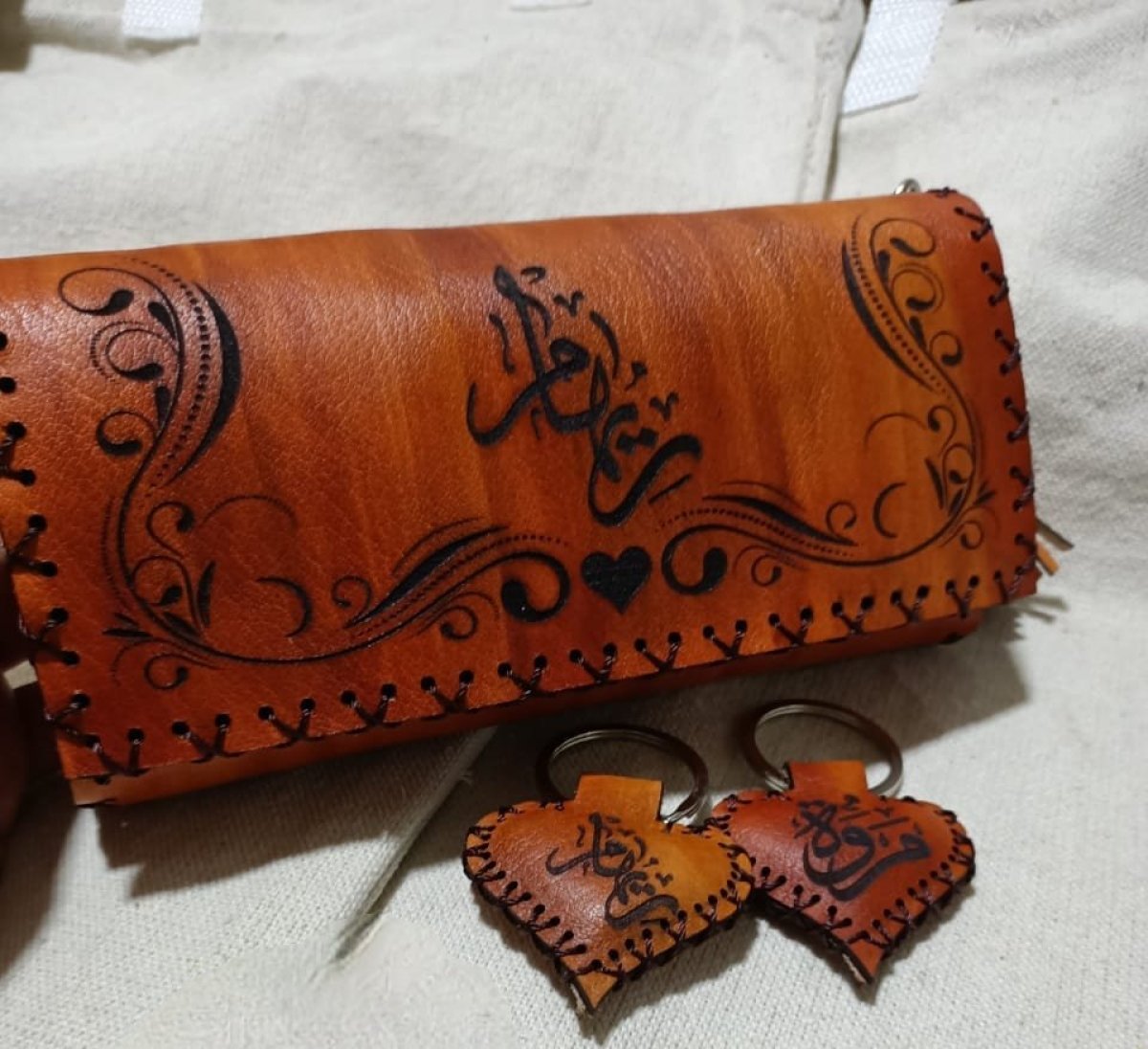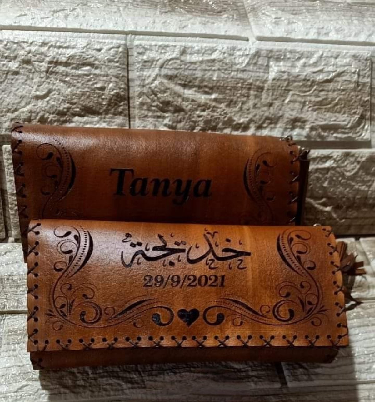 Women's wallet, cowhide leather on the outside and on the inside, cowhide and goat leather. The design is laser engraved. The price is 450 pounds, with the medal without the medal. 400. It is available to write the name of the customer’s choice. Dimensions 20*11