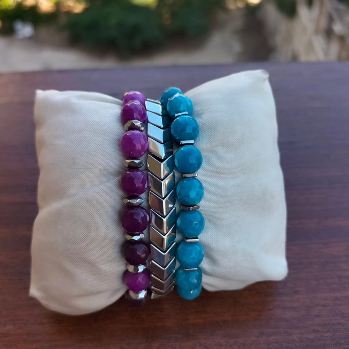 Bracelets, anklets, neck chains and eyeglass chains handmade made of stones and metal-free threads They do not rust or tarnish and their lifespan, God willing, is longer than regular accessories Don't worry if water falls on them🌧️💧 They narrow and widen according to the size of the hand