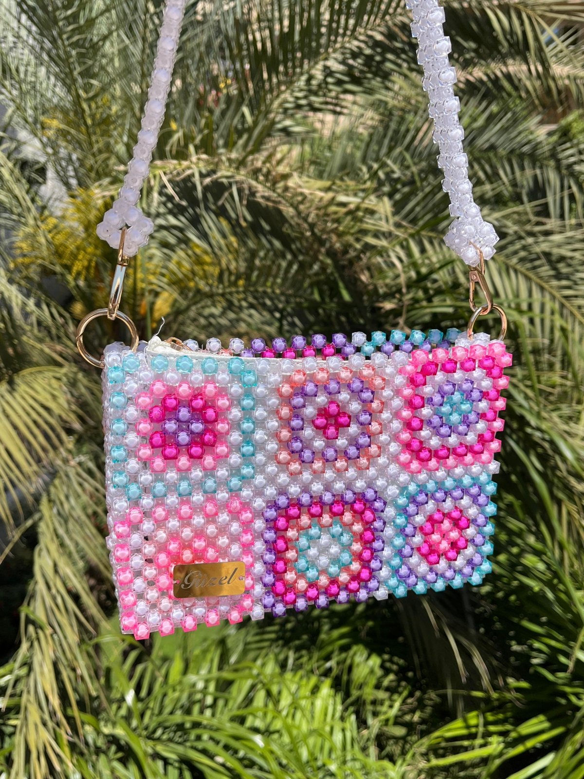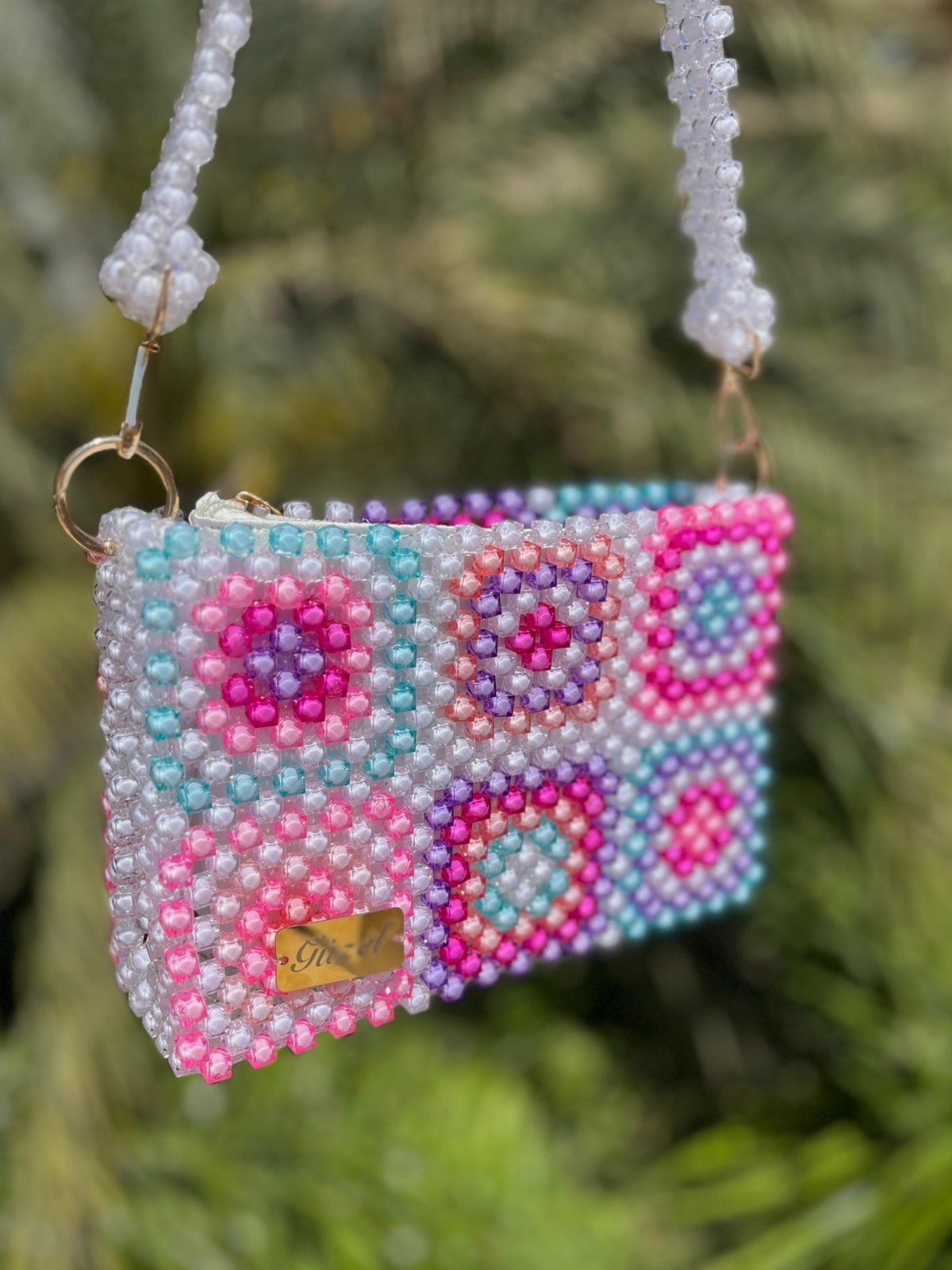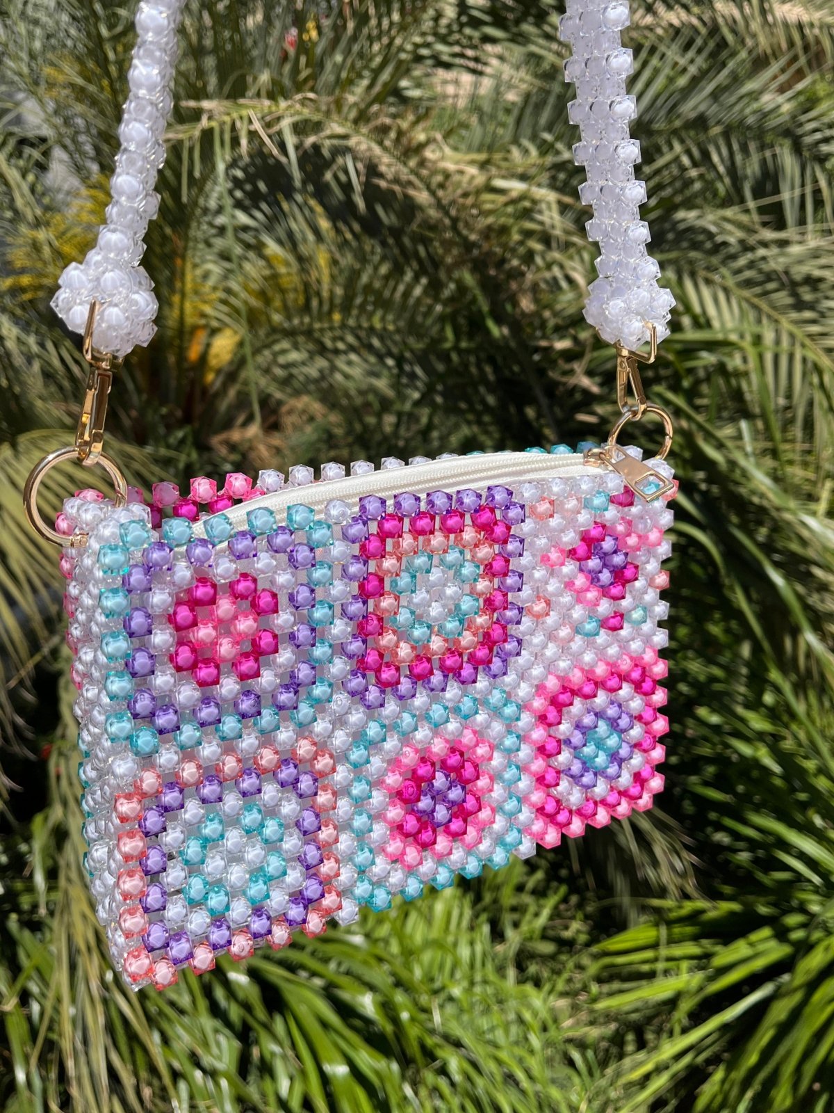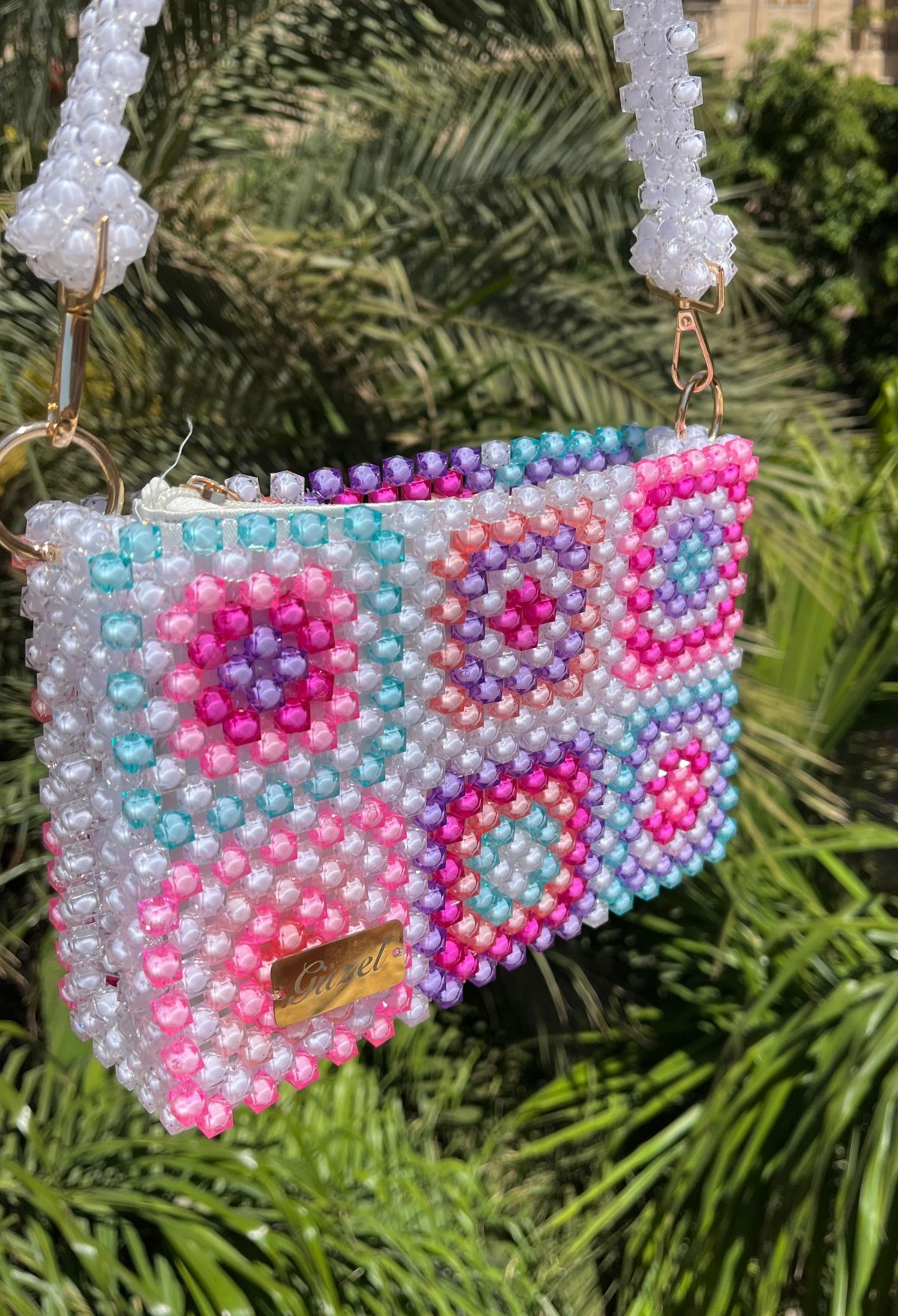 A square crystal bag in pink and purple colors. The size of the bag is 20 cm by 14 cm. It has a satin lining and a zipper inside.