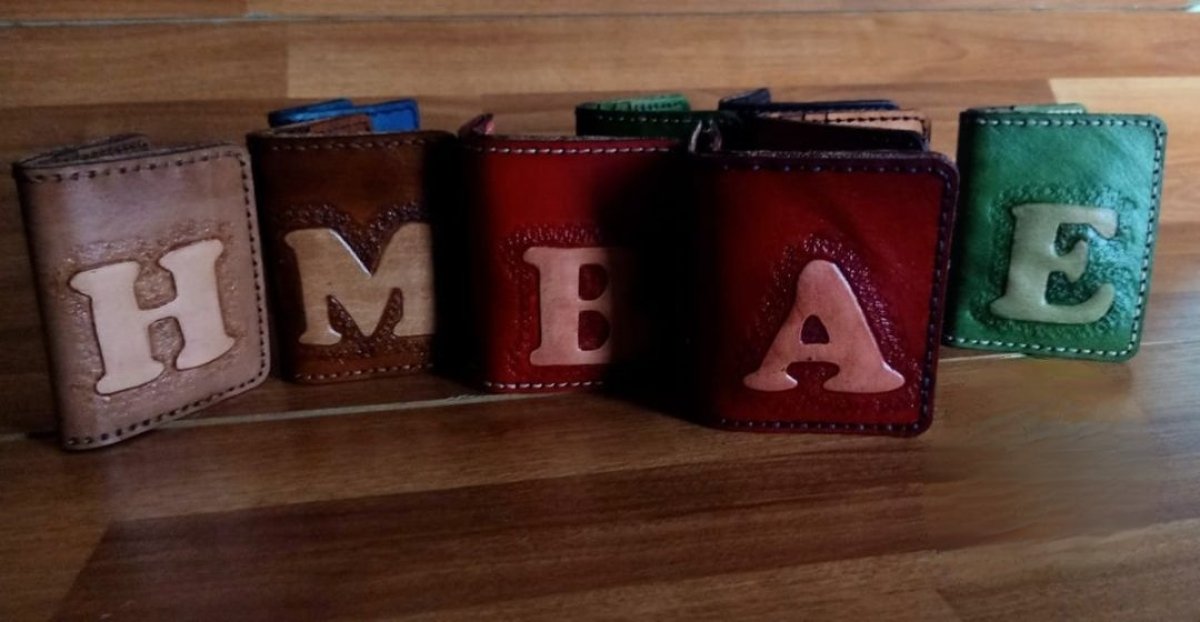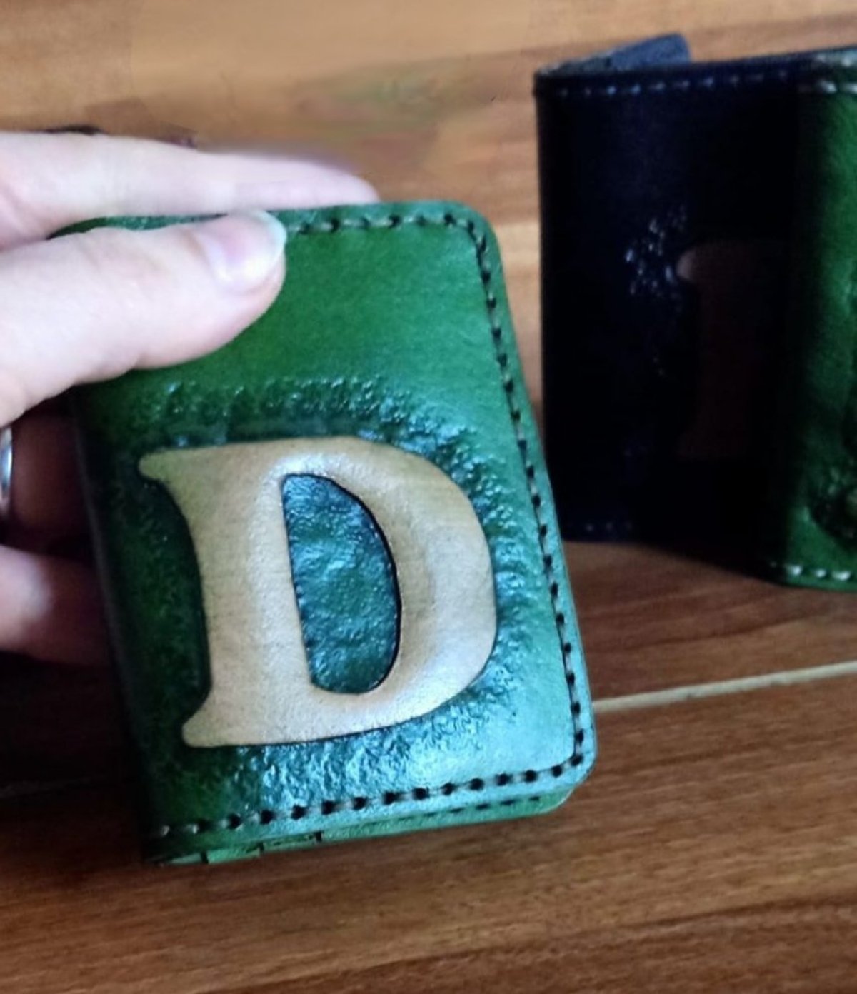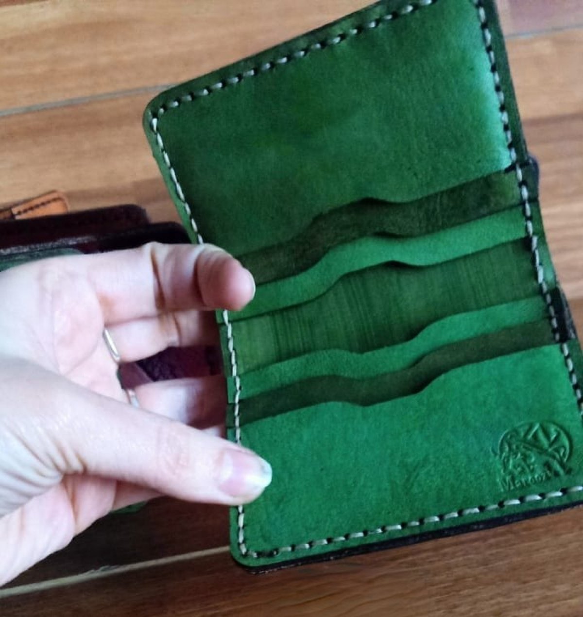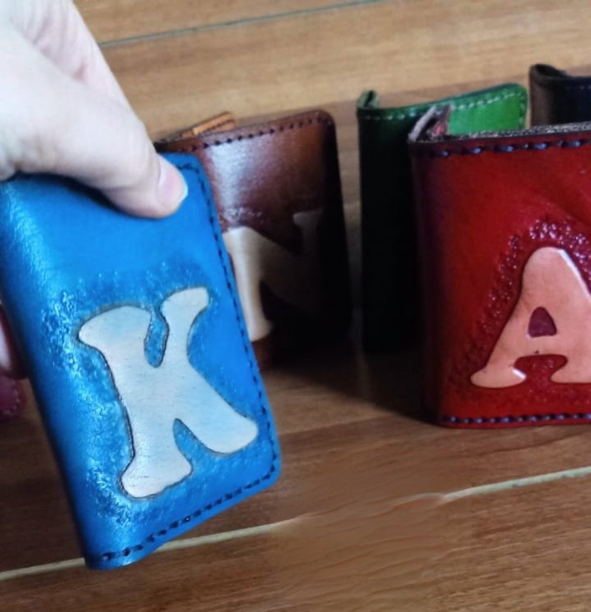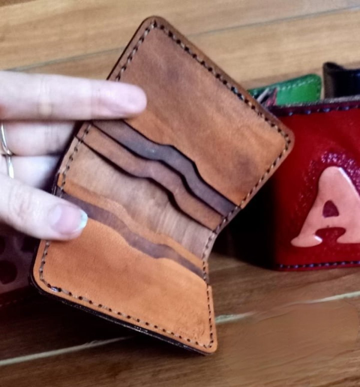 Small wallet, fully cowhide, It has a pocket for banknotes, other than places for cards hand-cut and colored. Custom-made crafts available. Dimensions 7*10.