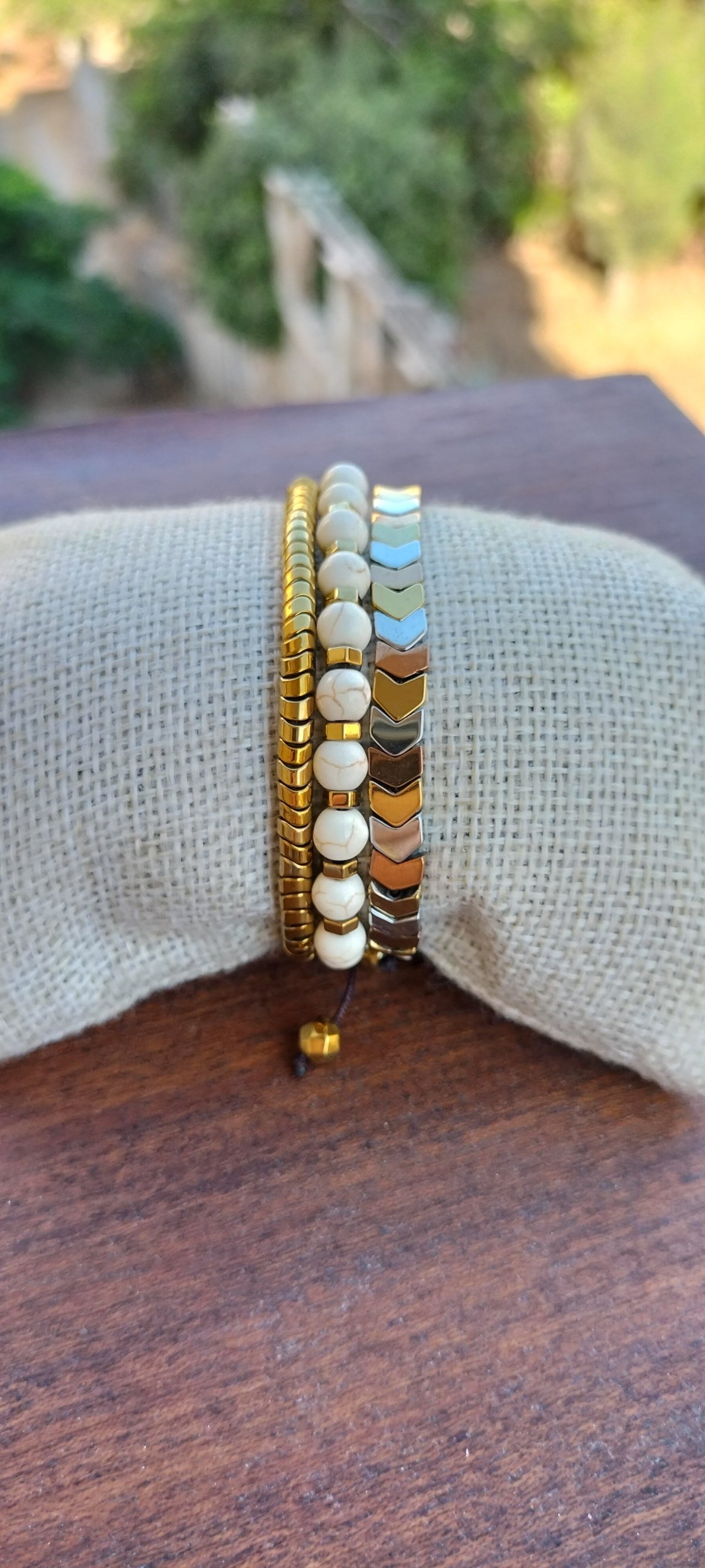 Bracelets, anklets, neck chains and eyeglass chains handmade made of stones and metal-free threads They do not rust or tarnish and their lifespan, God willing, is longer than regular accessories Don't worry if water falls on them🌧️💧 They narrow and widen according to the size of the hand