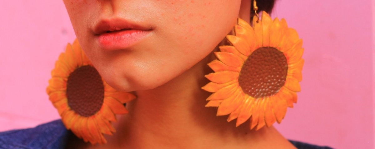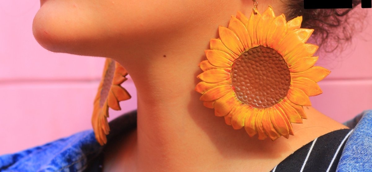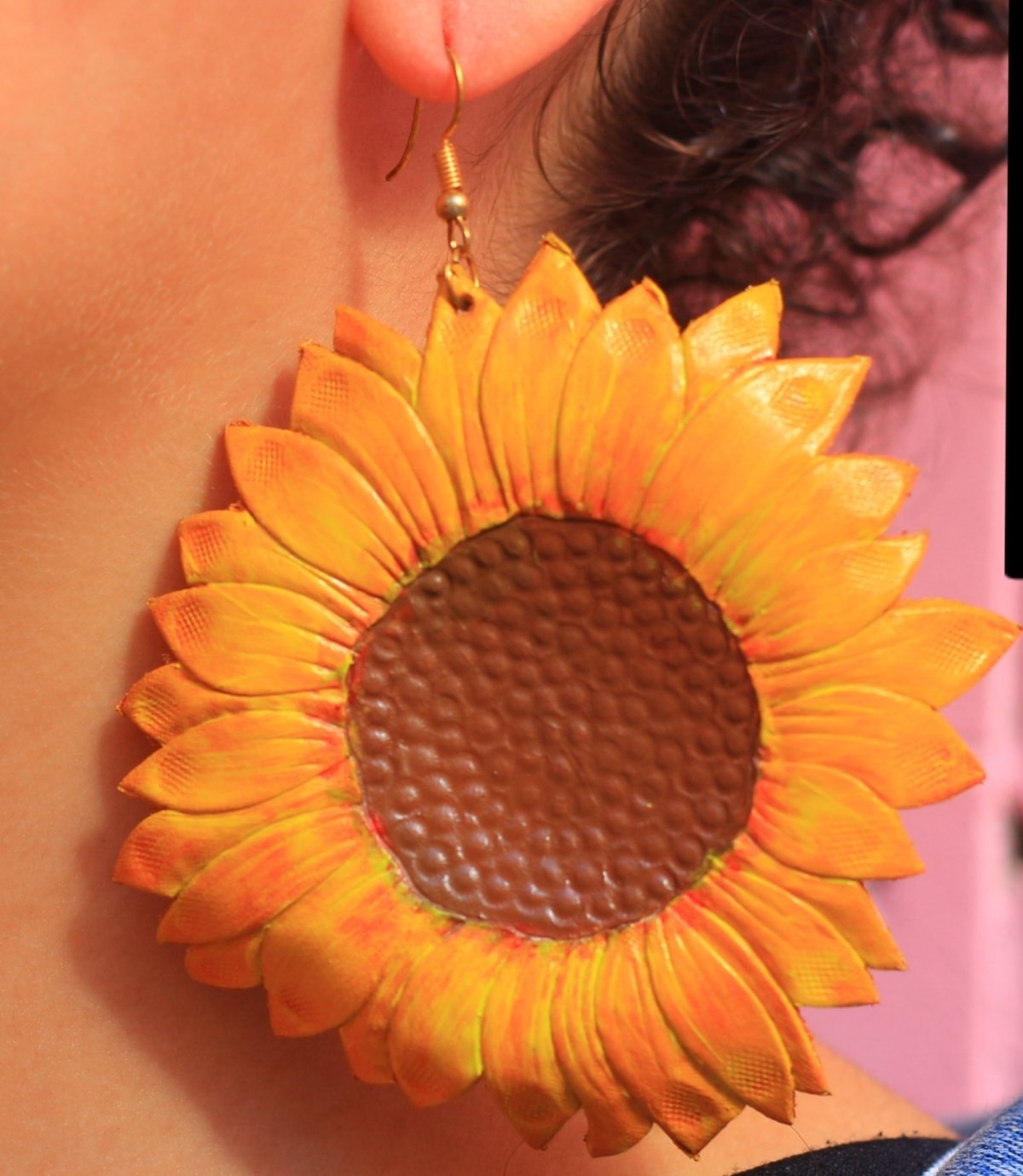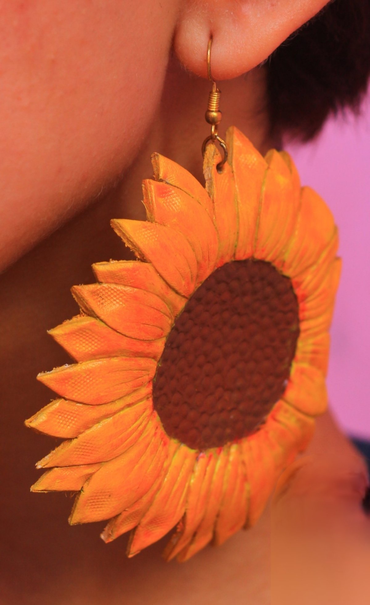 Sunflower earring, completely natural leather. Drawing, cutting, coloring and carving on the leather, completely manual, diameter 6cm