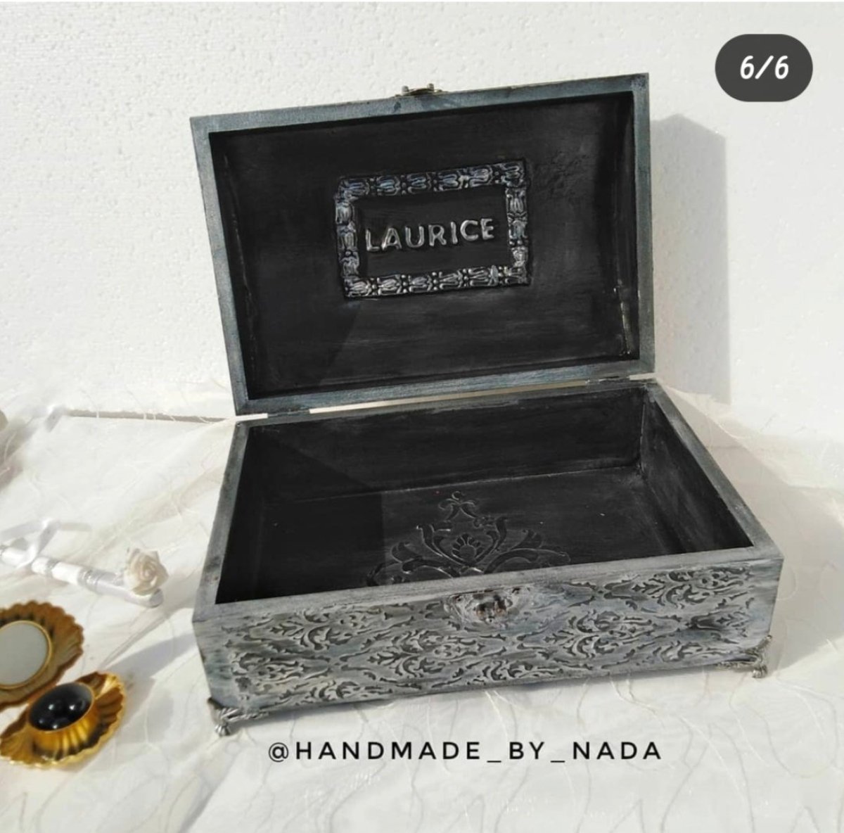 Customized black and white box with your photo and name outside