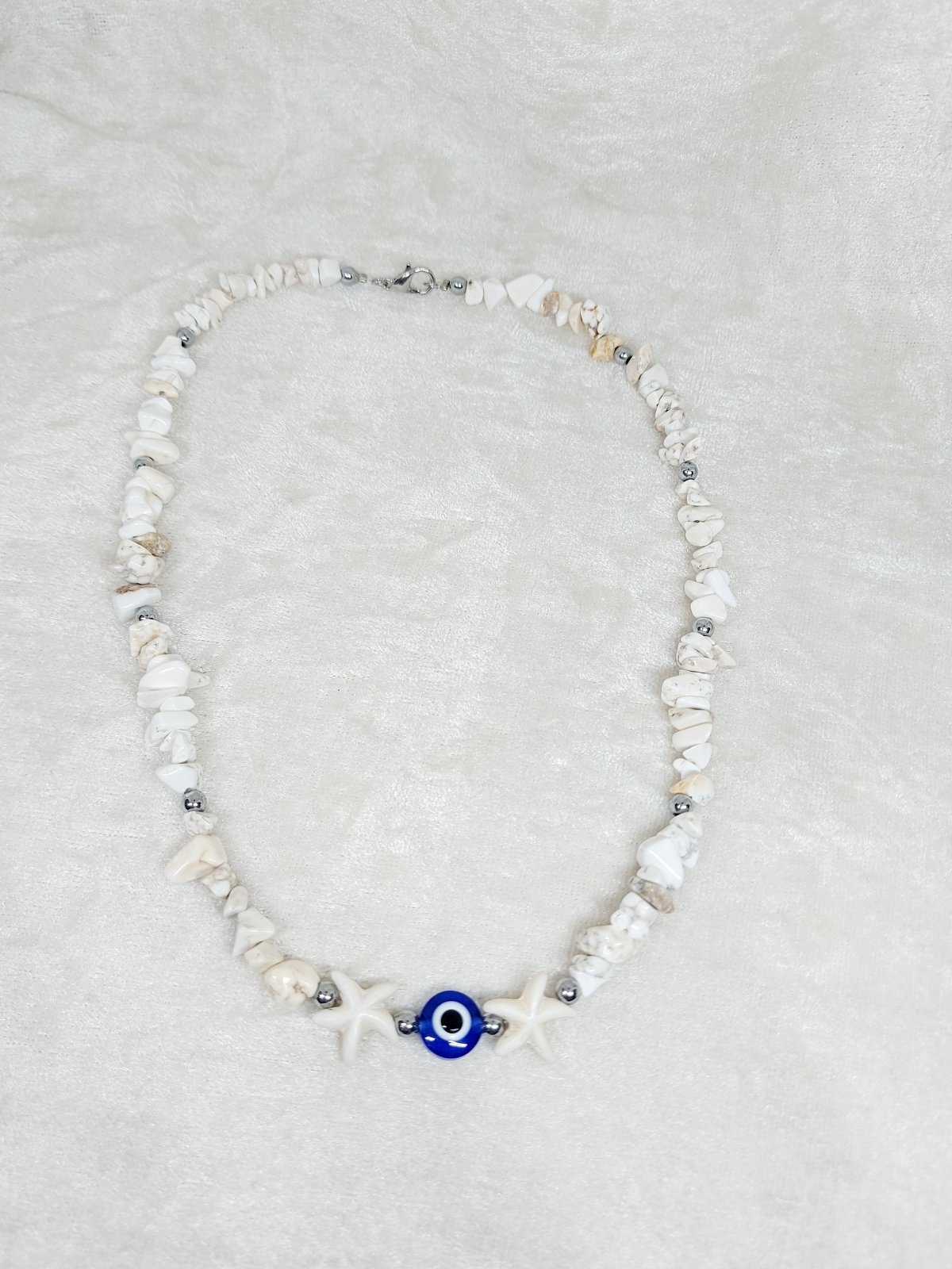 "A choker made of turquoise stones adorned with hematite spacers and turquoise stone stars, featuring an adjustable chain for length."