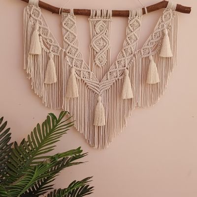 Macrame wall hanging with bohemian style made from high quality of white cotton cords & natural isolated tree branch