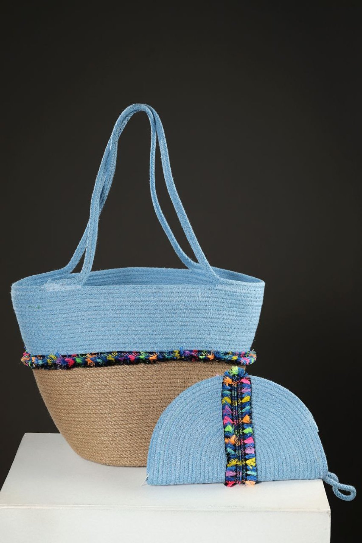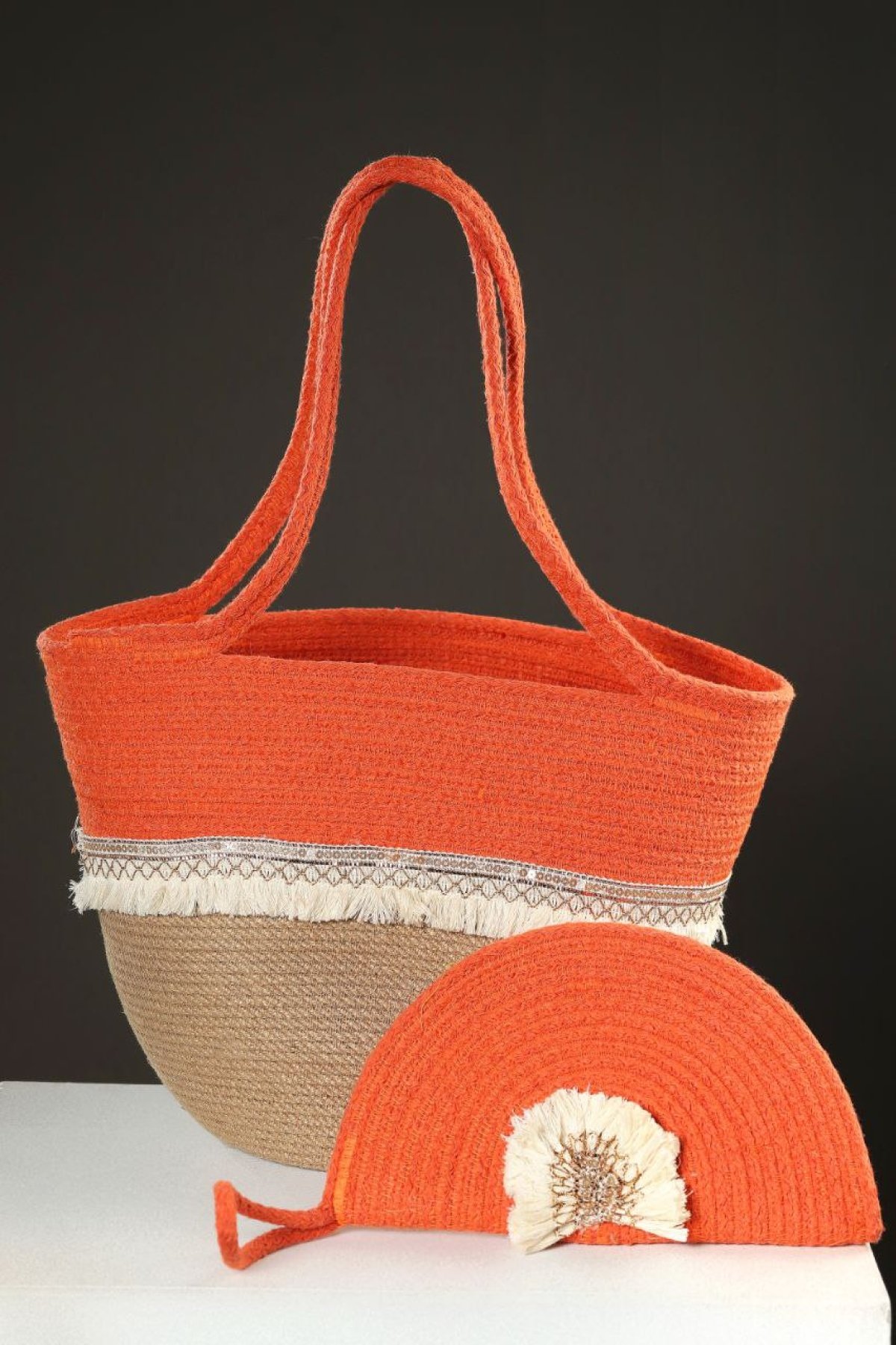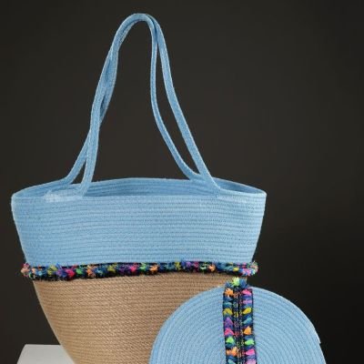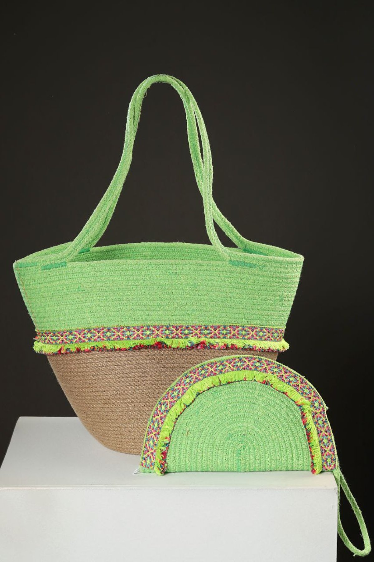 A beach set consisting of a bag and a clutch in fluorescent colors. Made from jute and cotton ropes, it is large in size and lightweight.