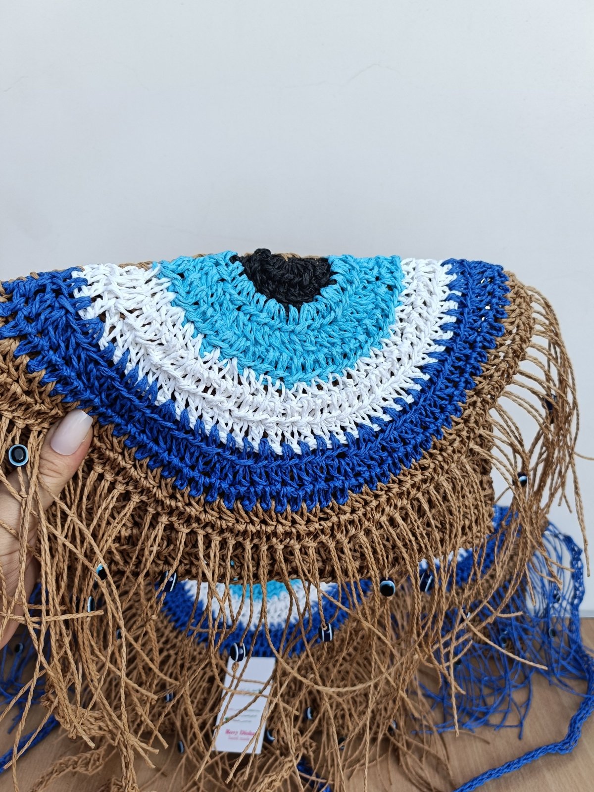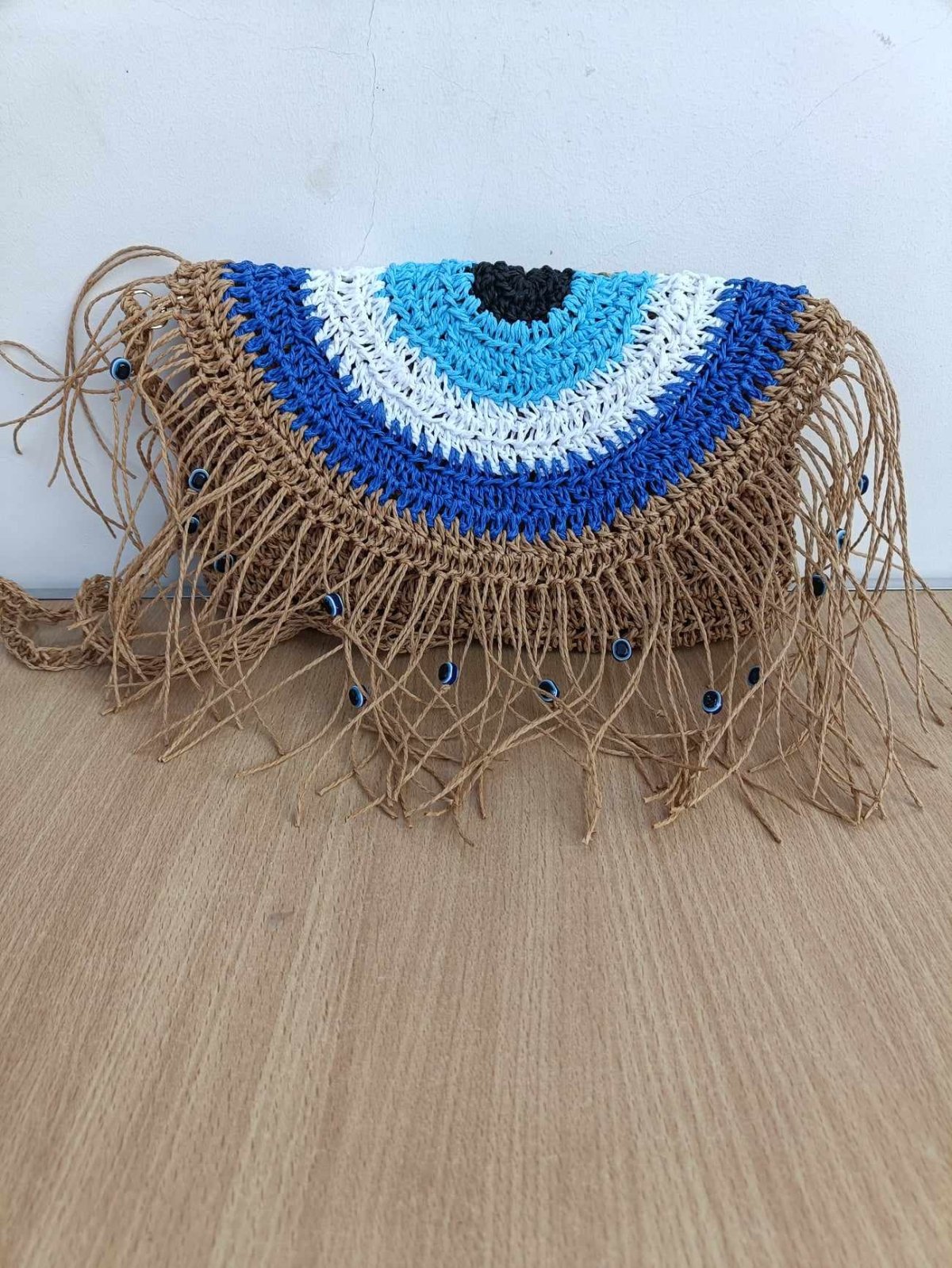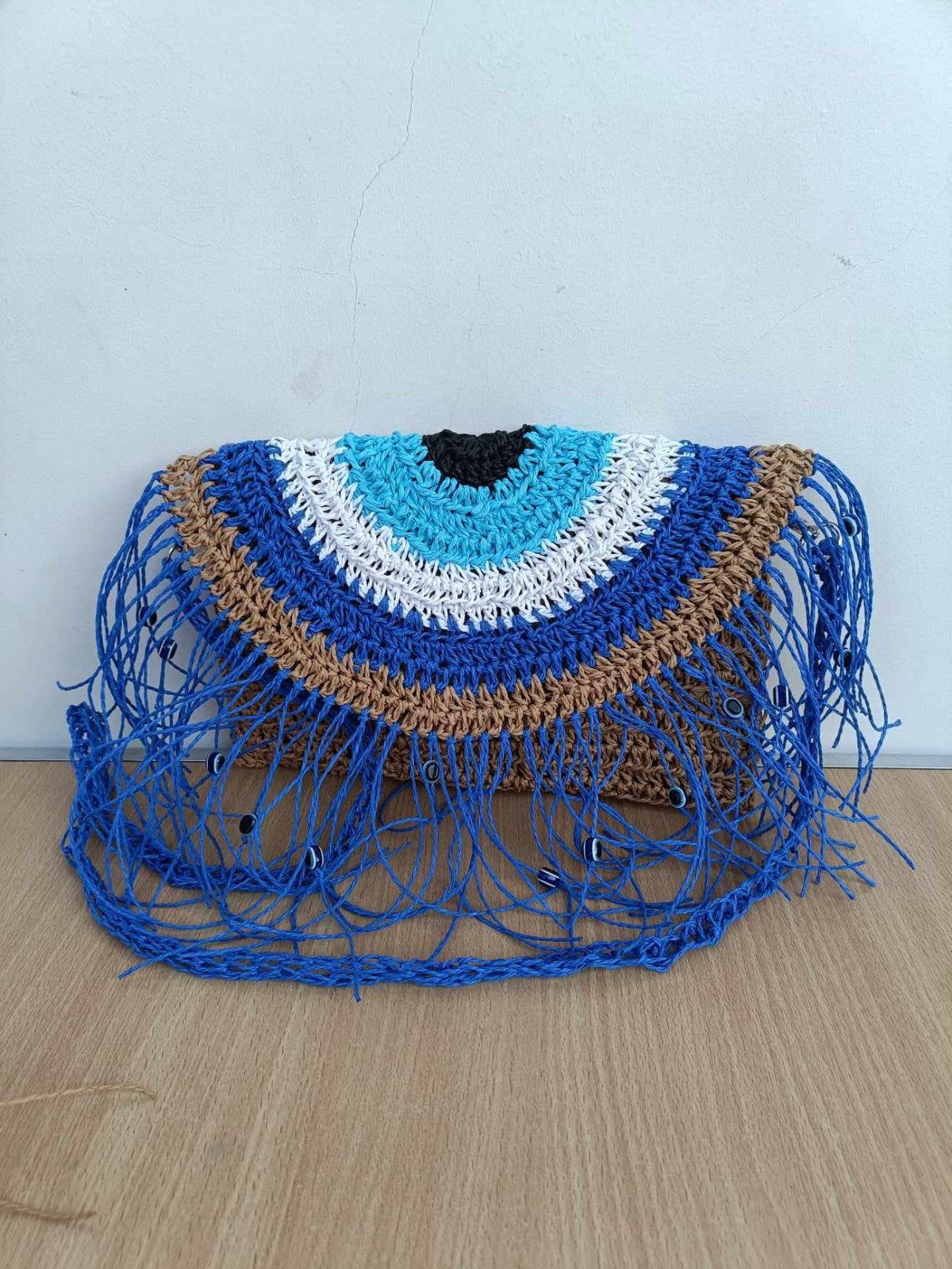 The trendy bag with imported raffia thread has a crossbody handle made of the same material and high-quality accessories and has an inner lining with a zipper made of the finest materials.