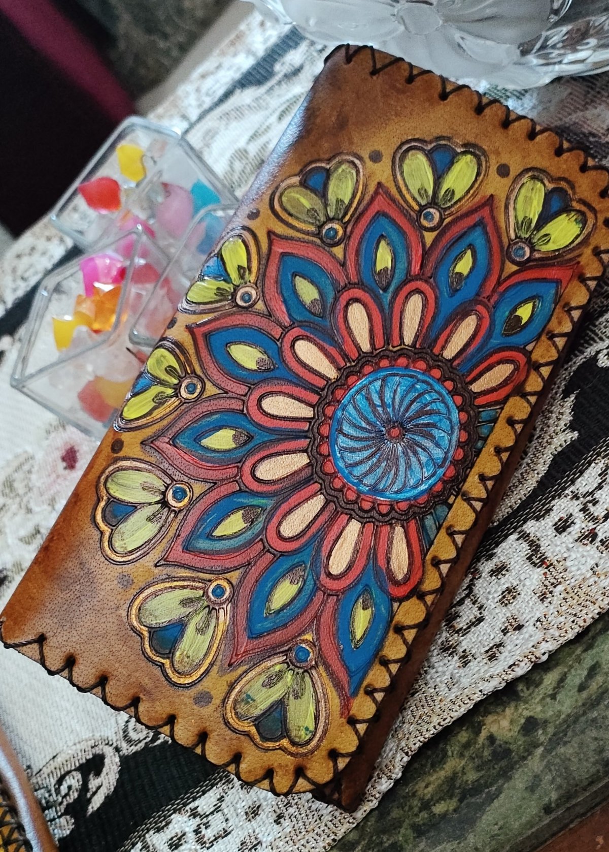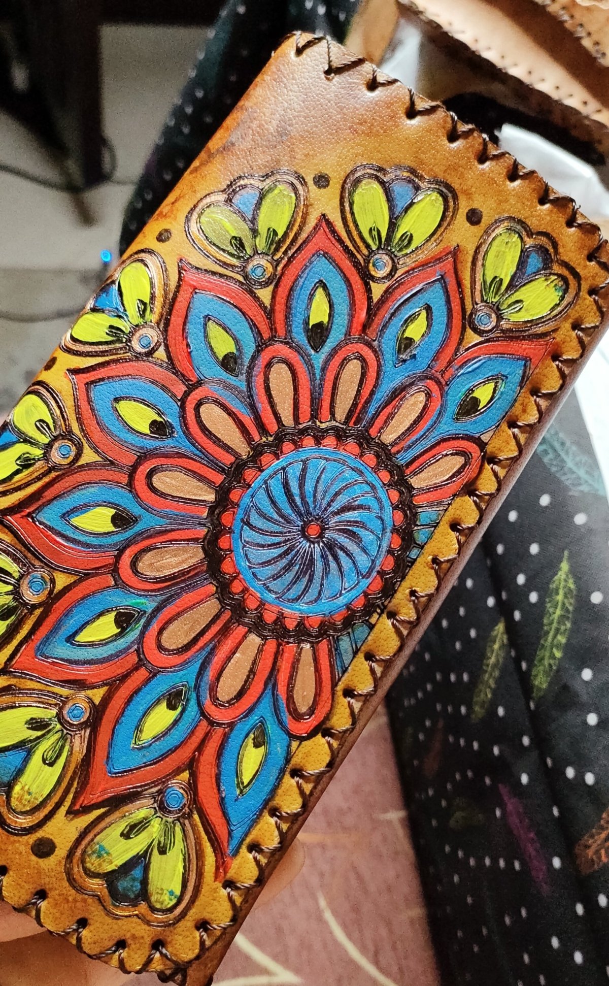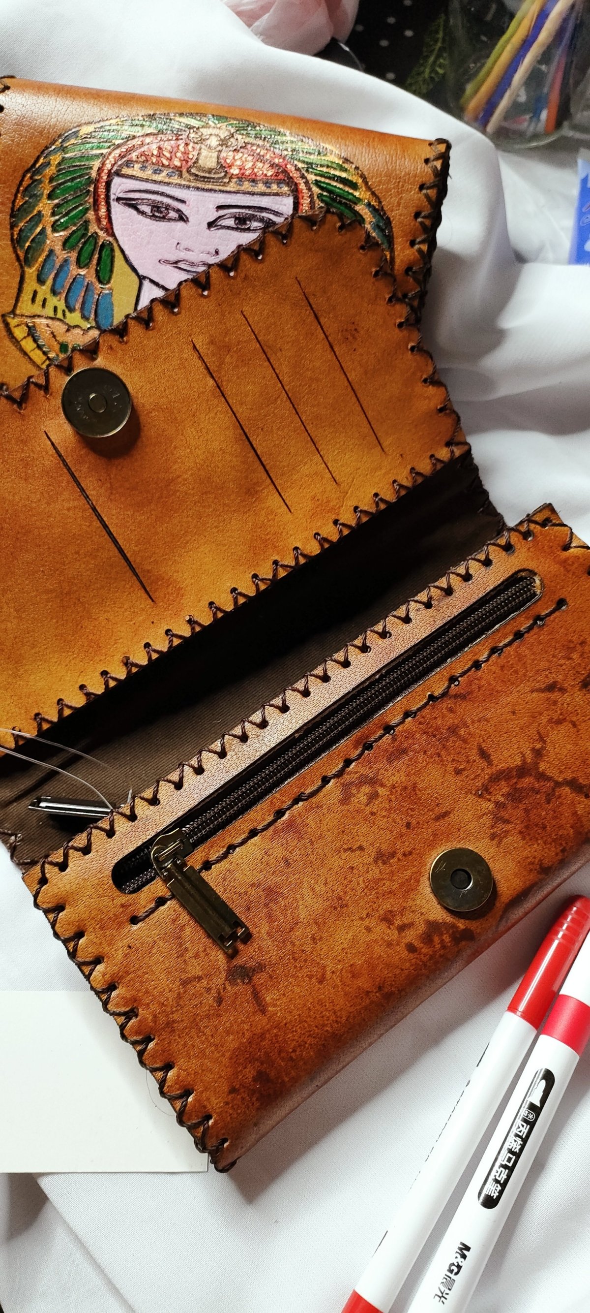 Large women's wallet, hand-painted, genuine leather, hand-stitched