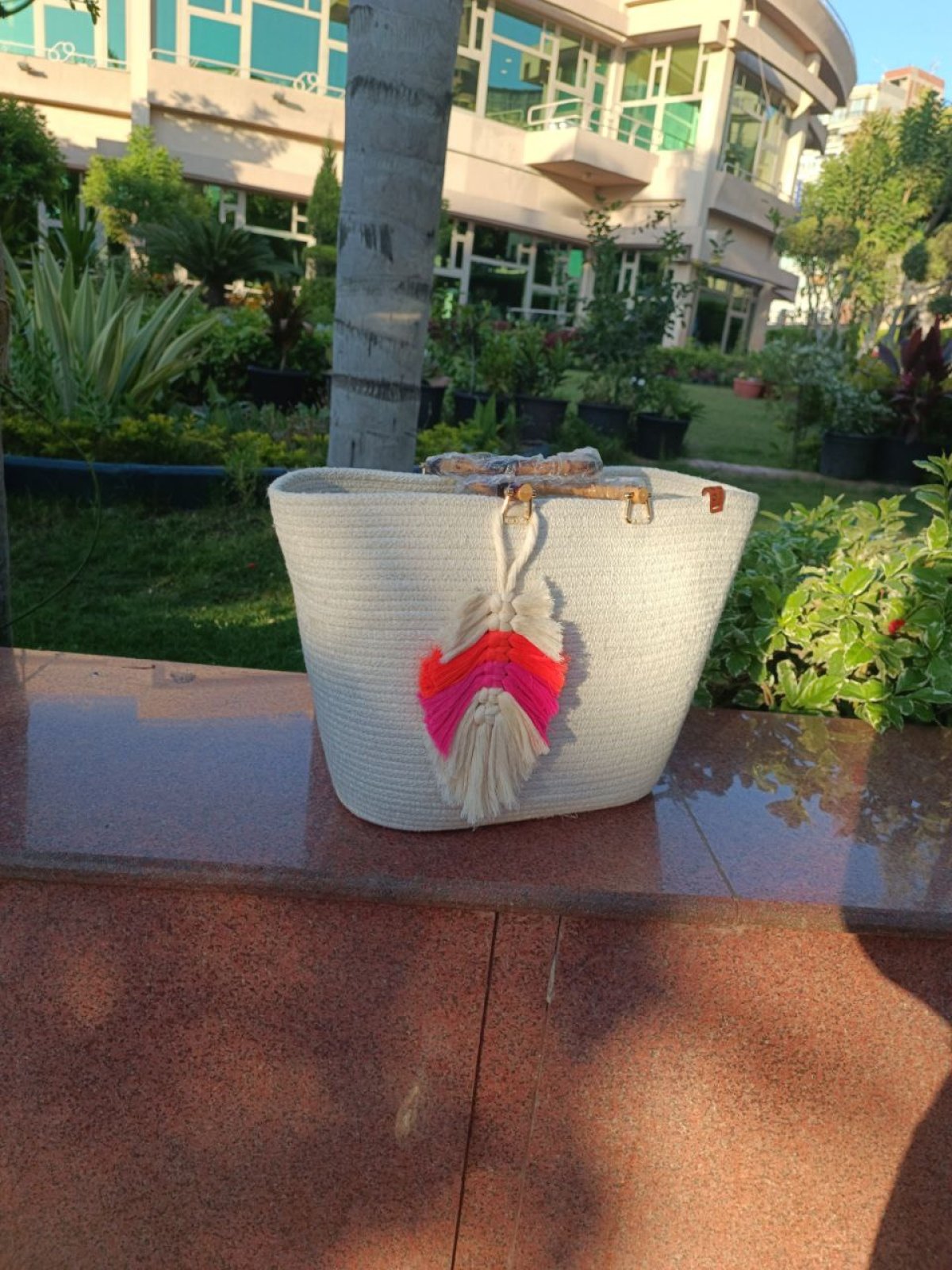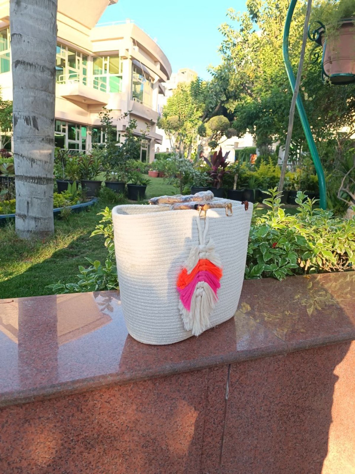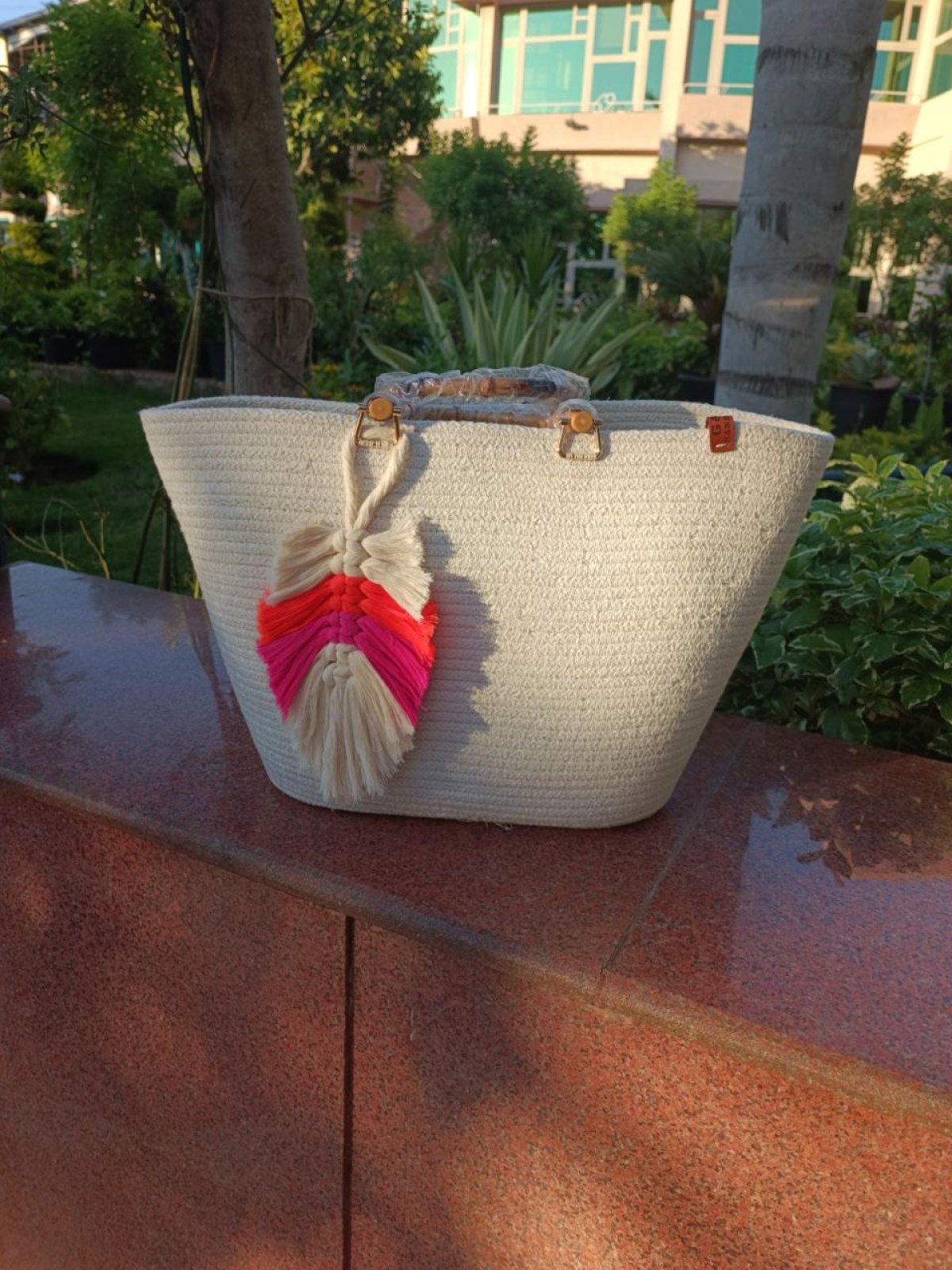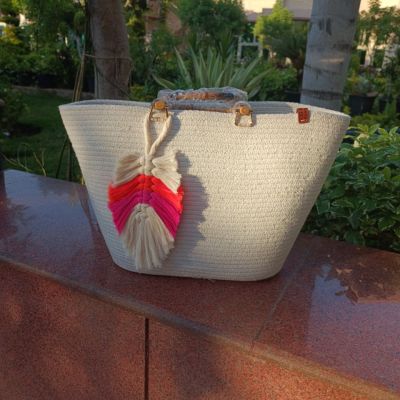 Made from soft, pure cotton ropes, it is large and lightweight, accommodating all our belongings. The handle is made from very durable ivory, adding beauty and elegance to the bag. The feather color can be customized according to your preference.