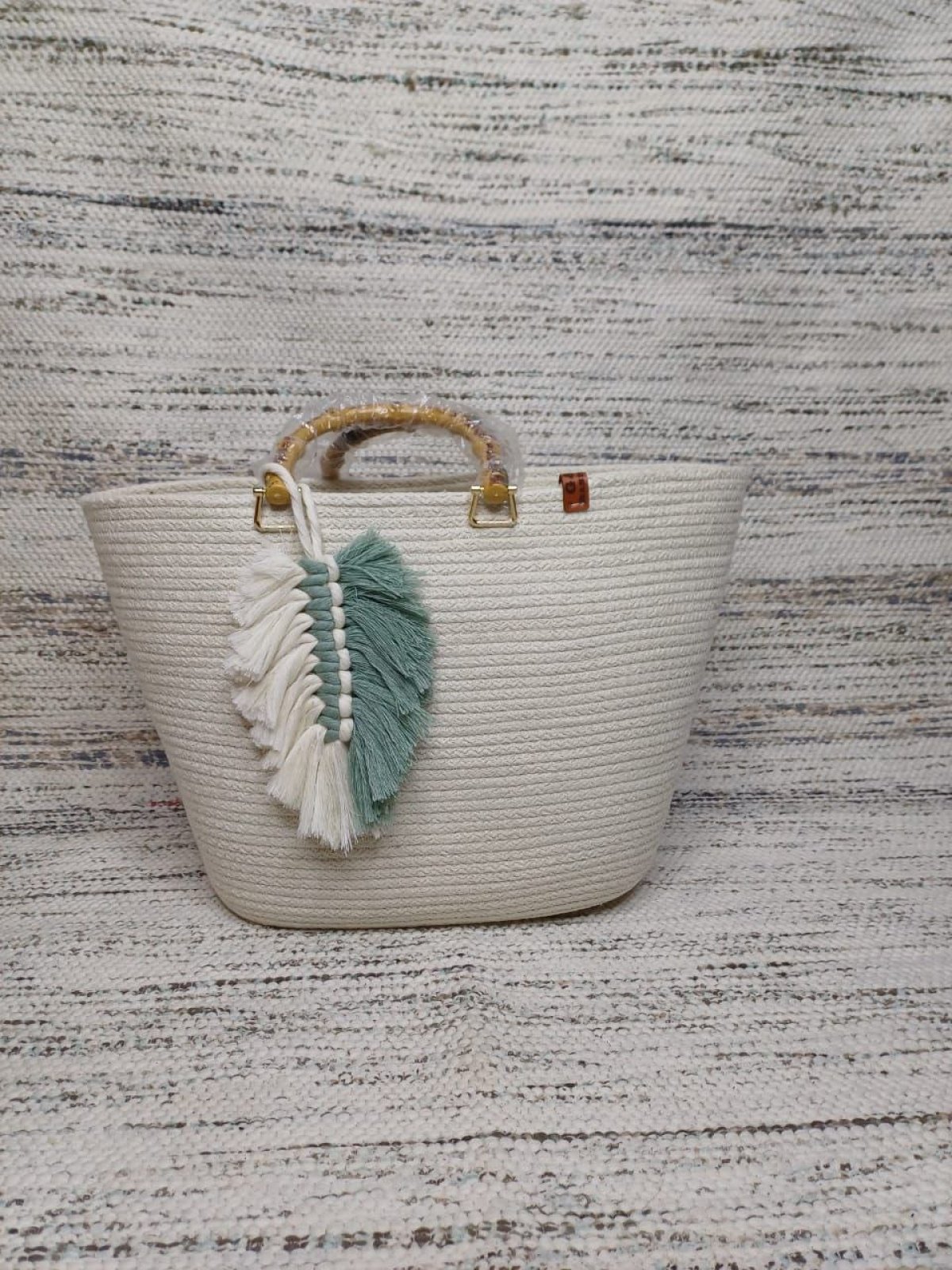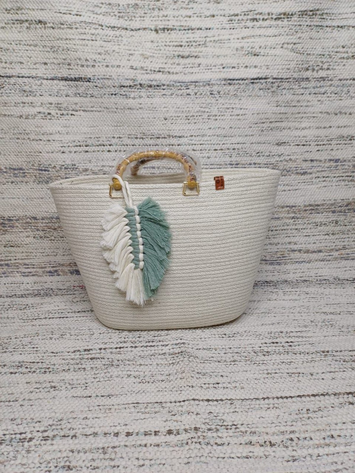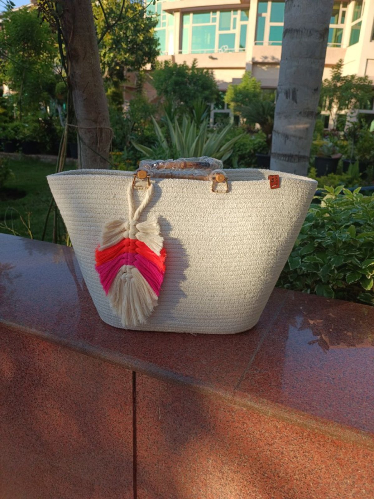 Made from soft, pure cotton ropes, it is large and lightweight, accommodating all our belongings. The handle is made from very durable ivory, adding beauty and elegance to the bag. The feather color can be customized according to your preference.