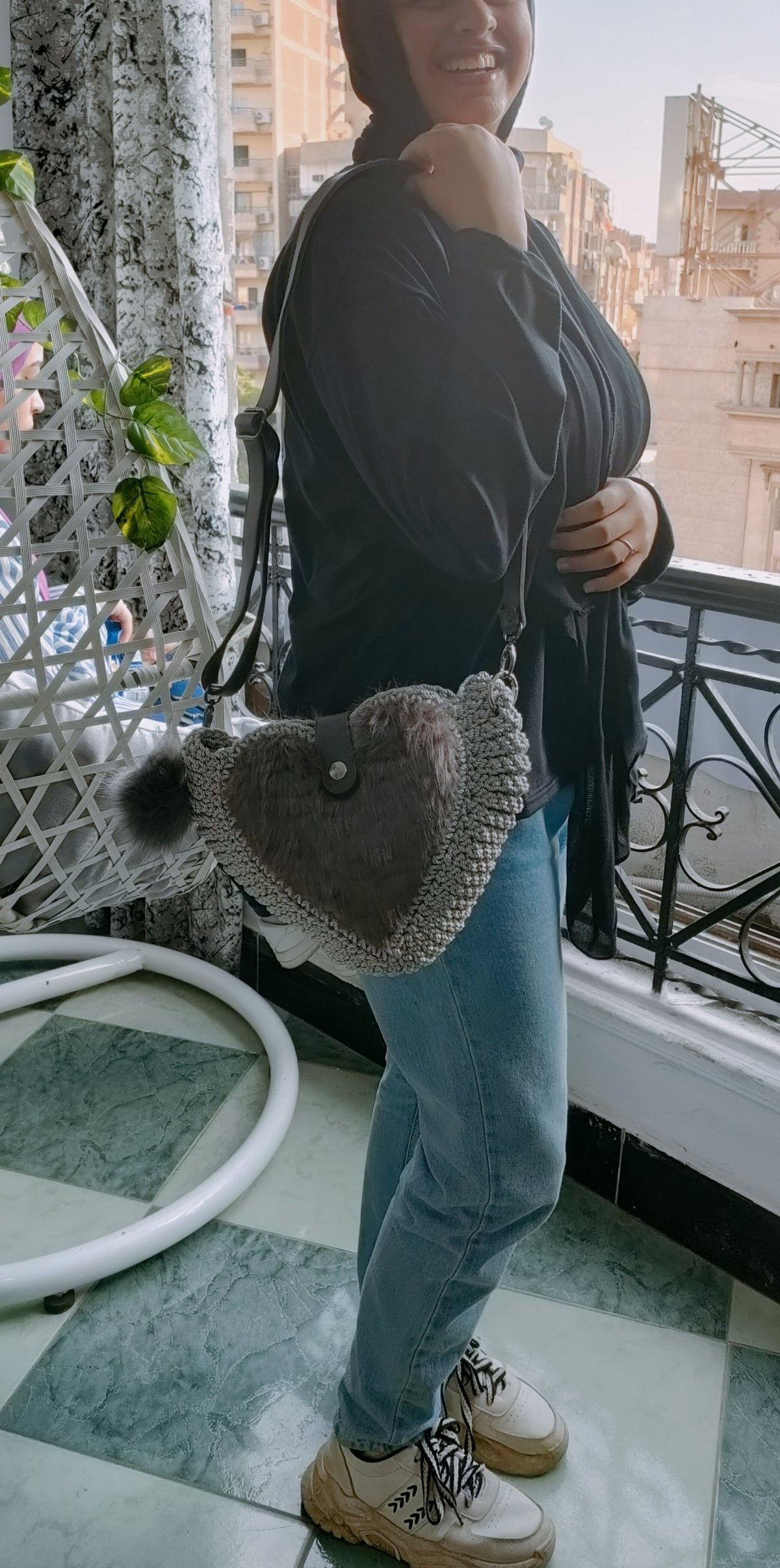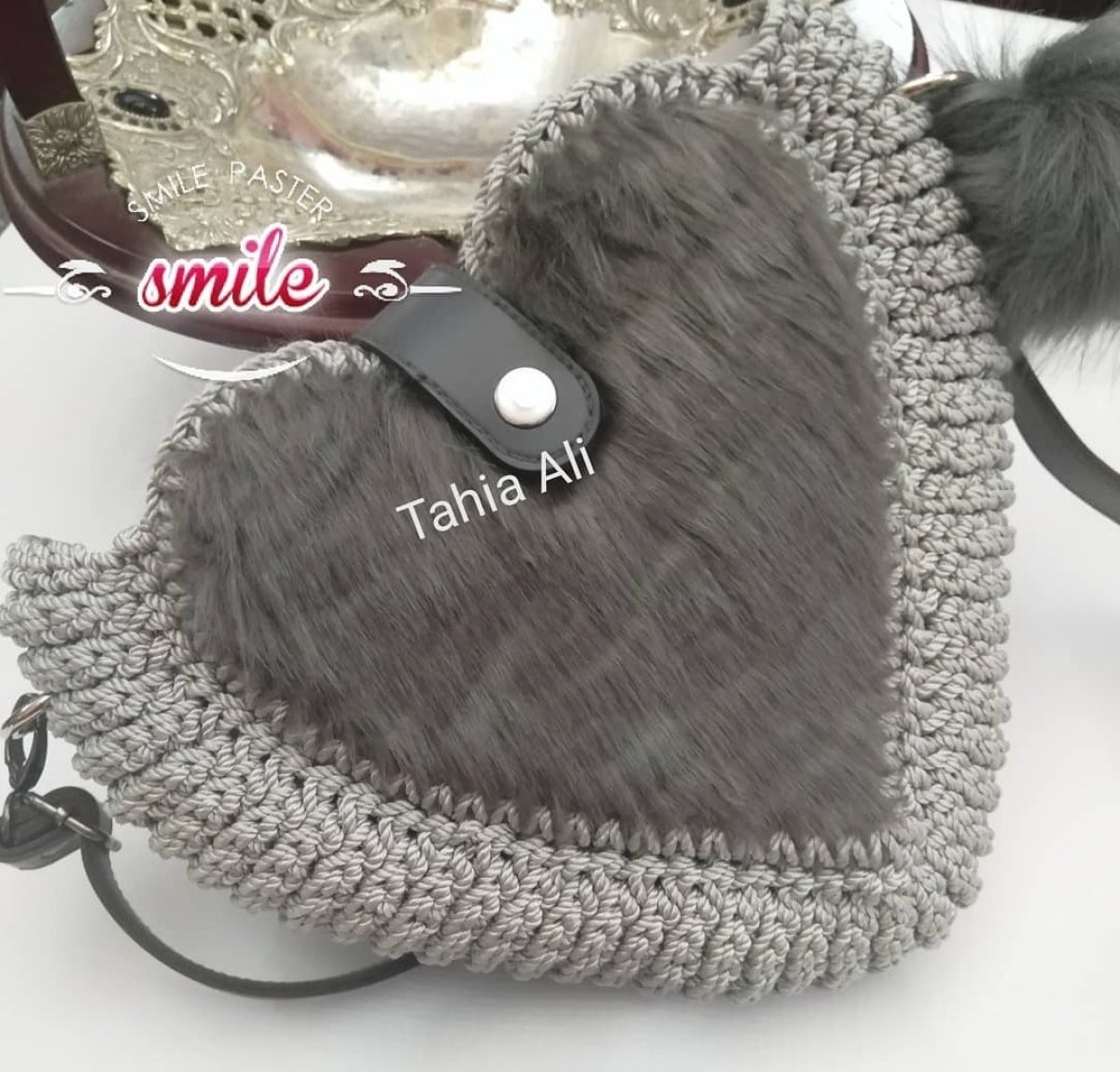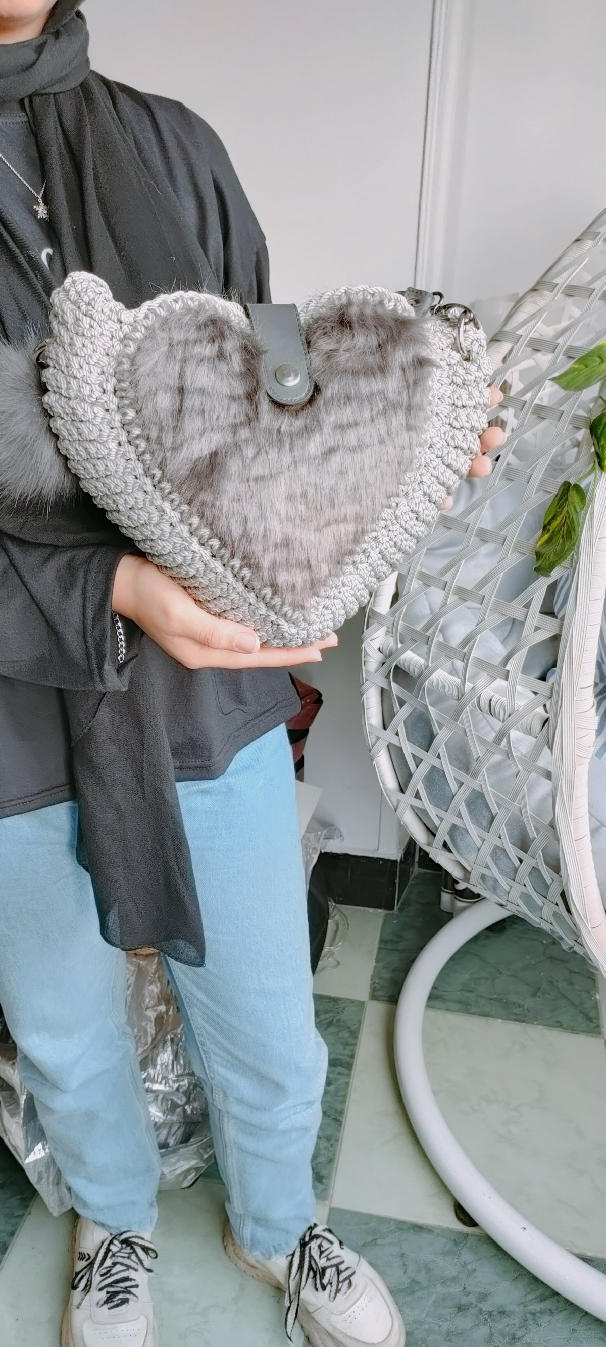 An elegant heart-shaped bag made of crochet and leather