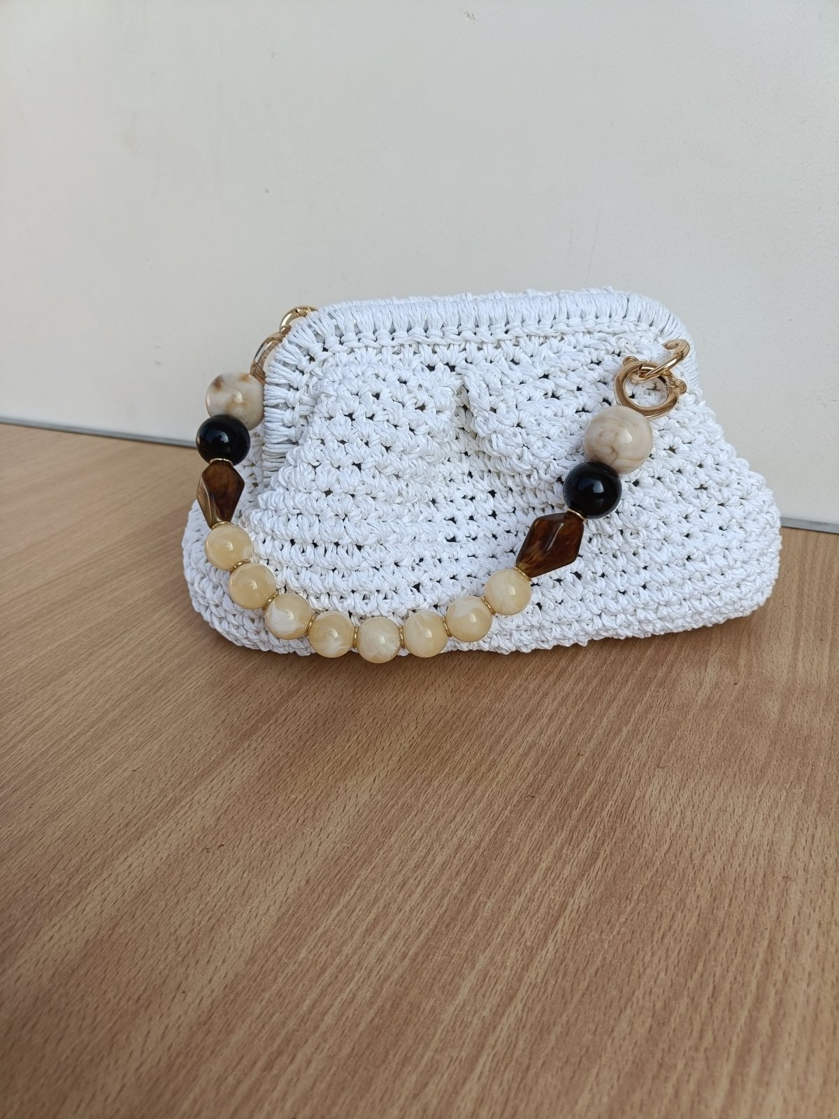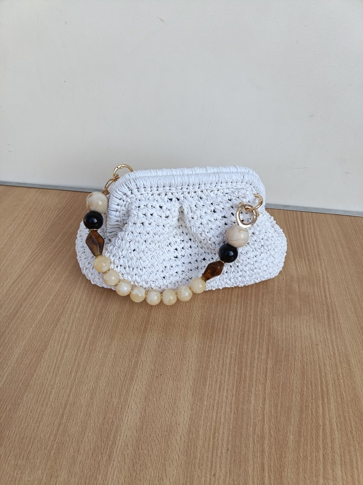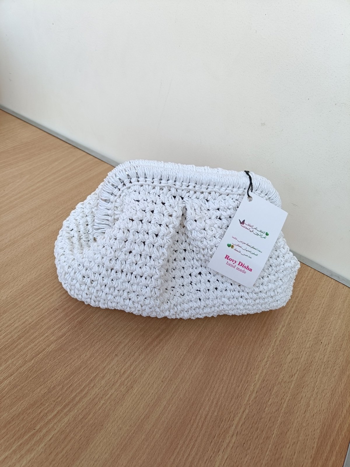 Trendy crochet clutch with imported raffia threads in royal white, available in all colors, size 18*27, and lined from the inside with a Turkish satin lining.