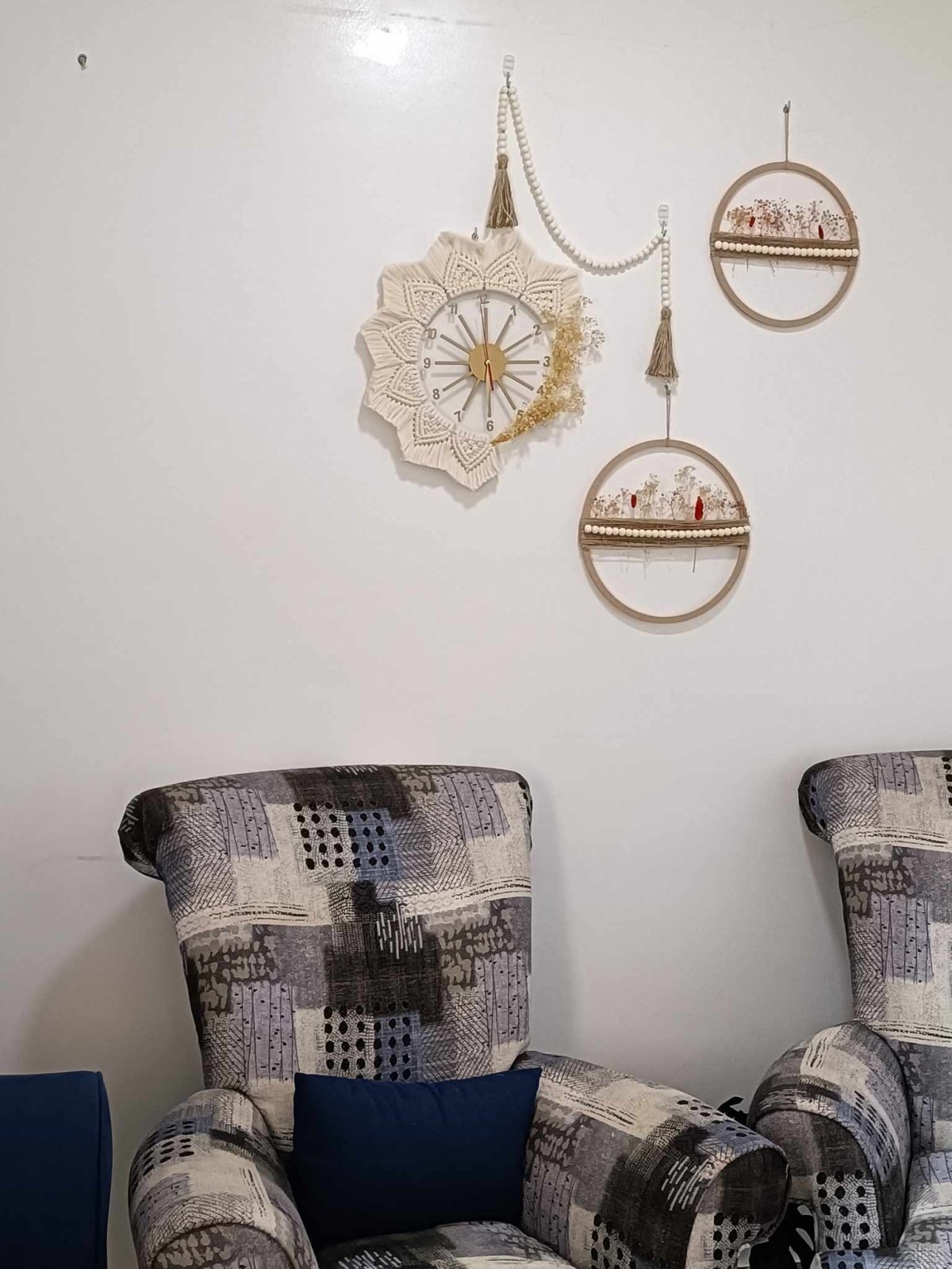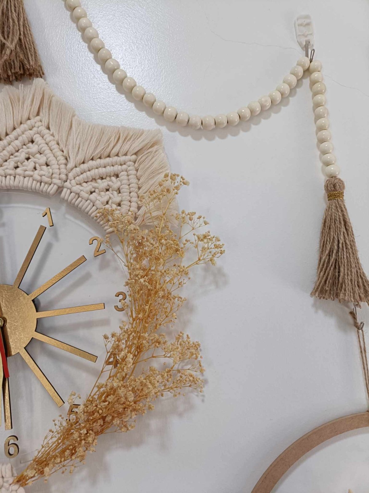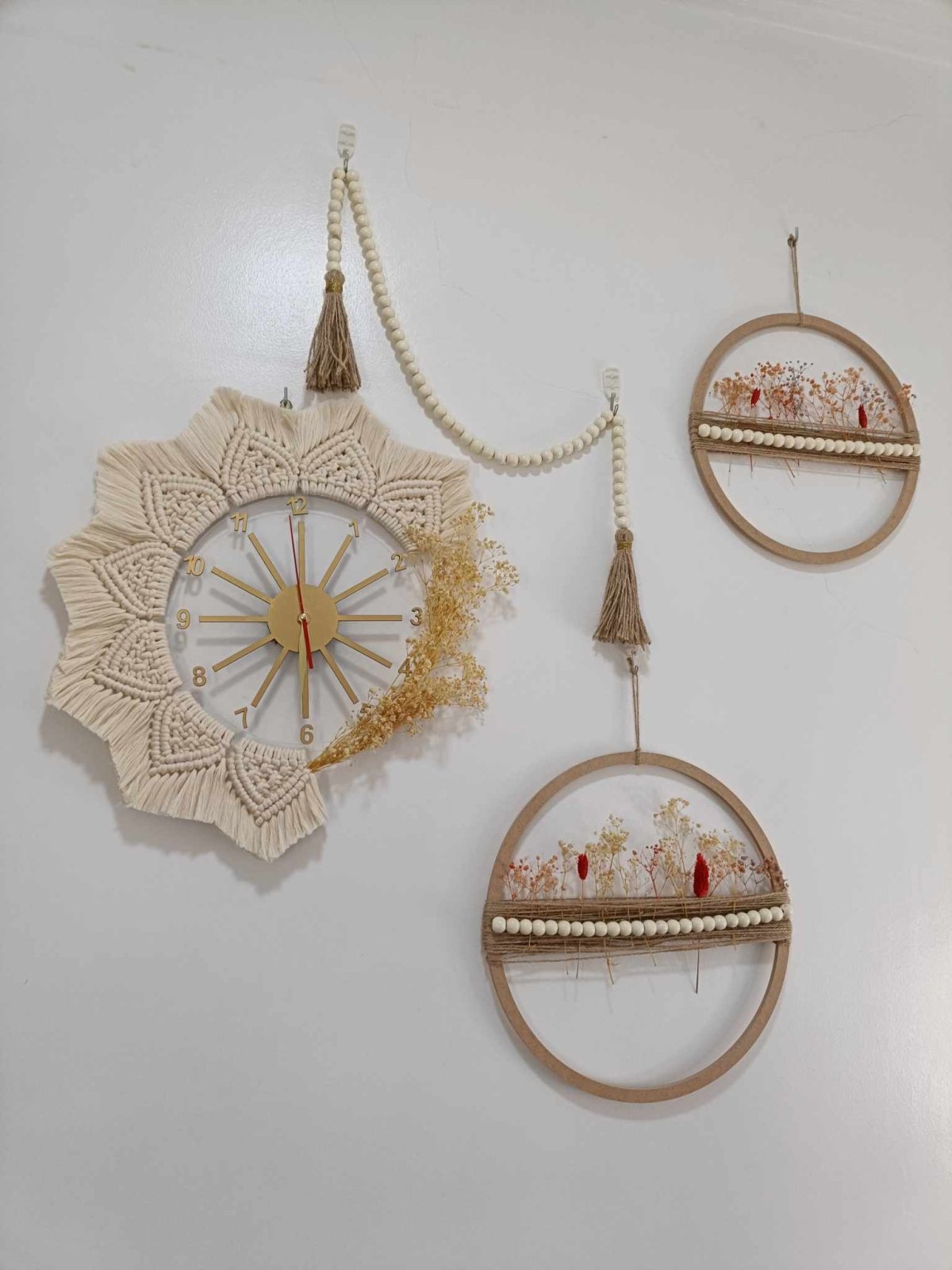Macrame wall decor consisting of 4 pieces, an acrylic clock with macrame and baby flower art, imported baby flower hoops, a Turkish beaded rosary, and matrail. The entire decor is imported.