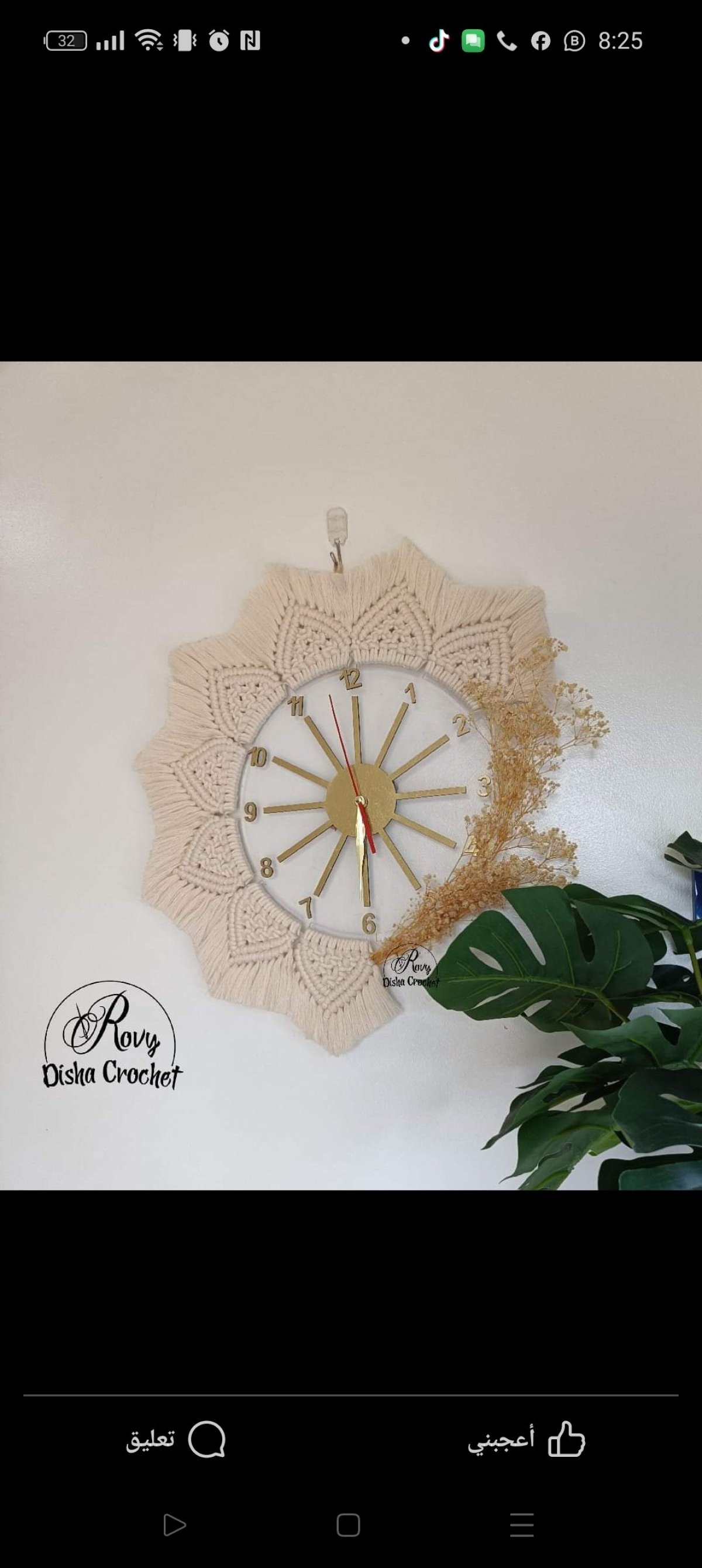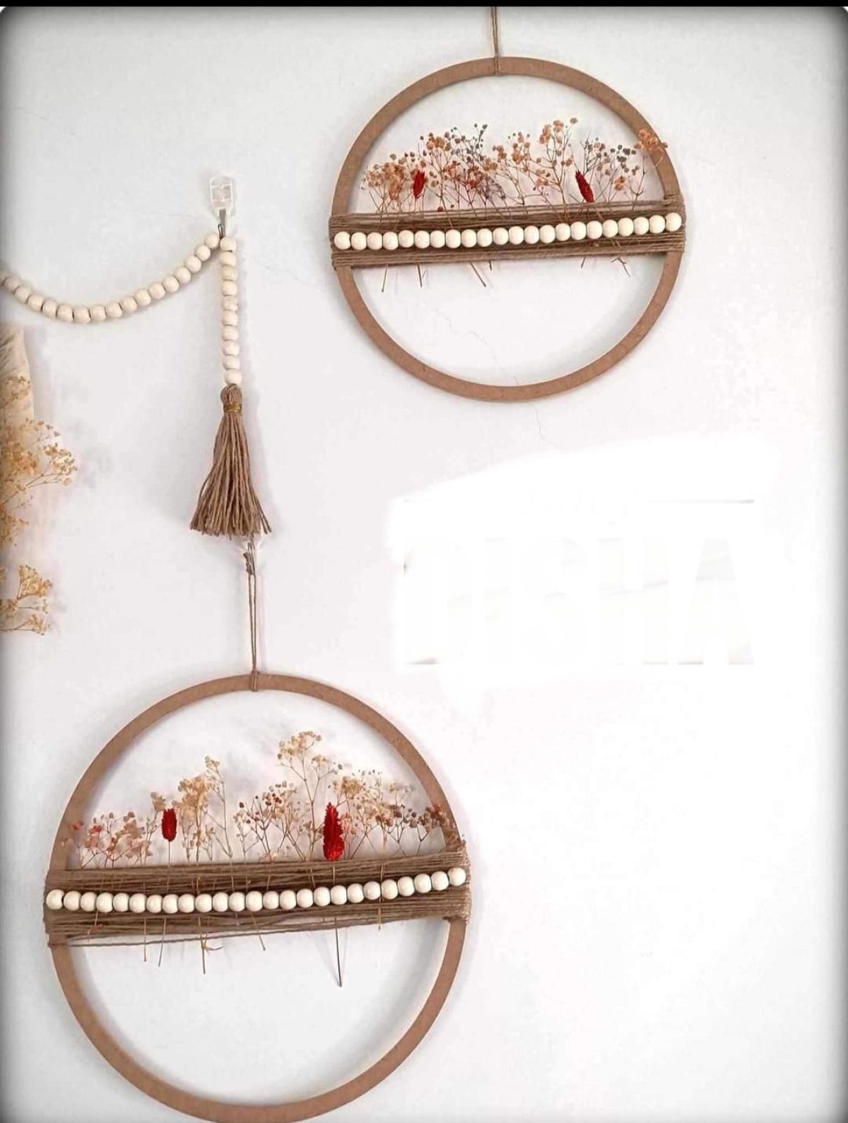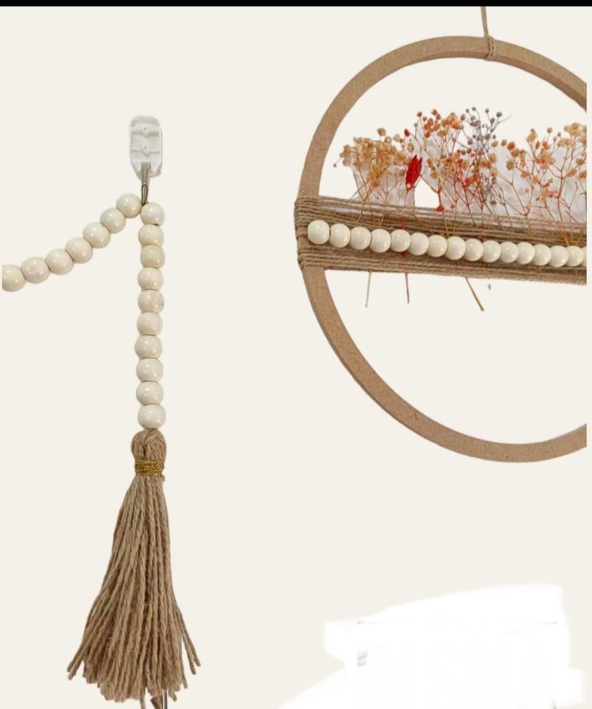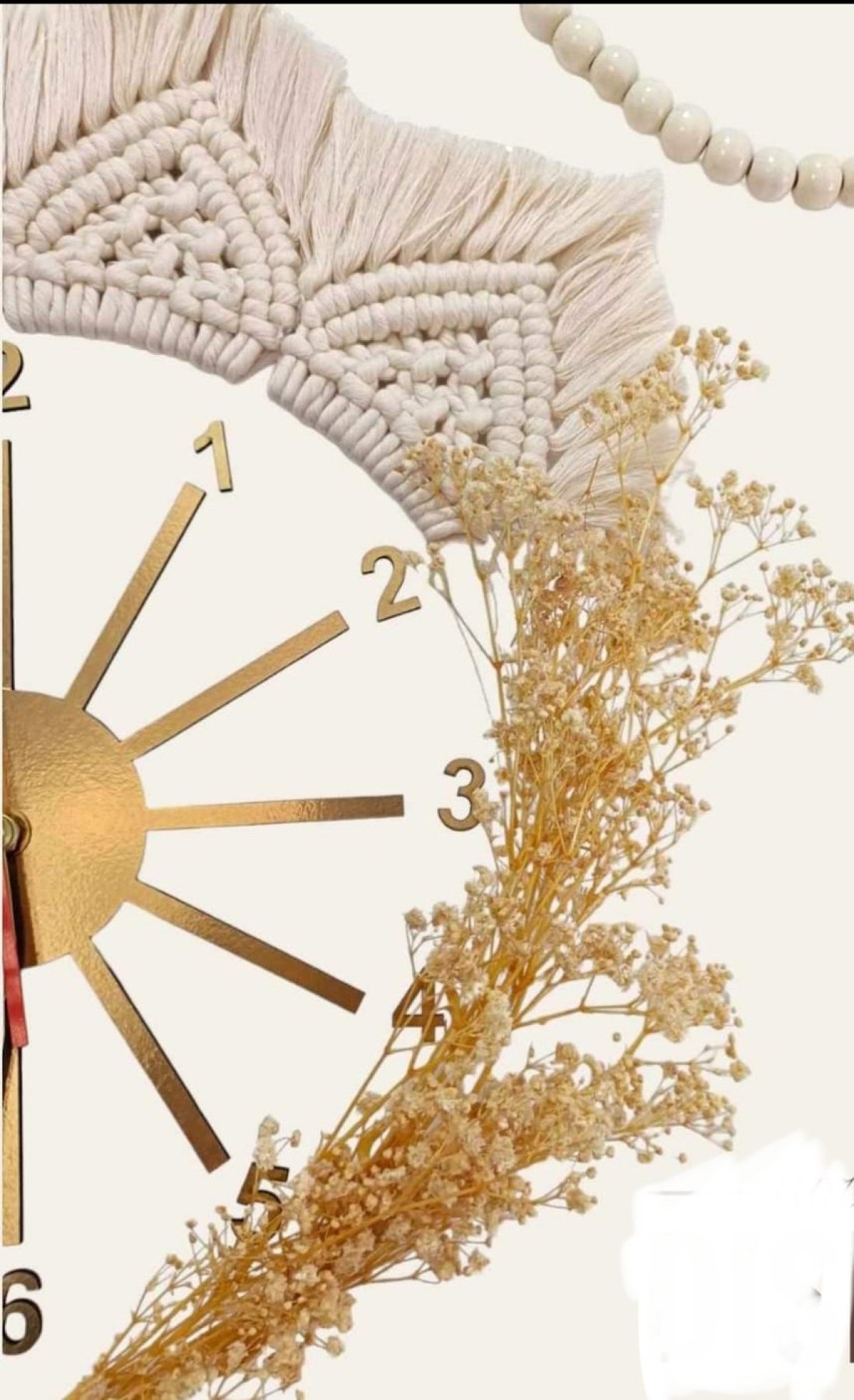 Macrame wall decor consisting of 4 pieces, an acrylic clock with macrame and baby flower art, imported baby flower hoops, a Turkish beaded rosary, and matrail. The entire decor is imported.