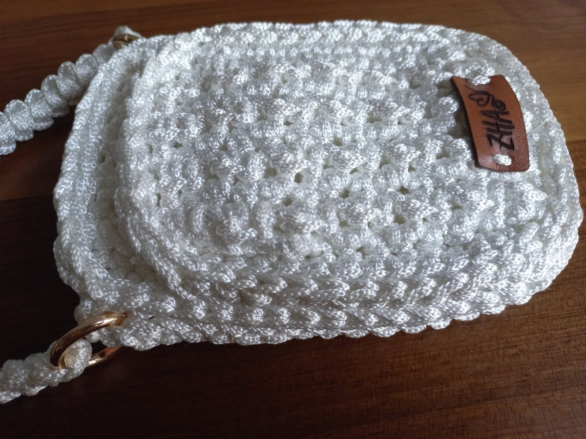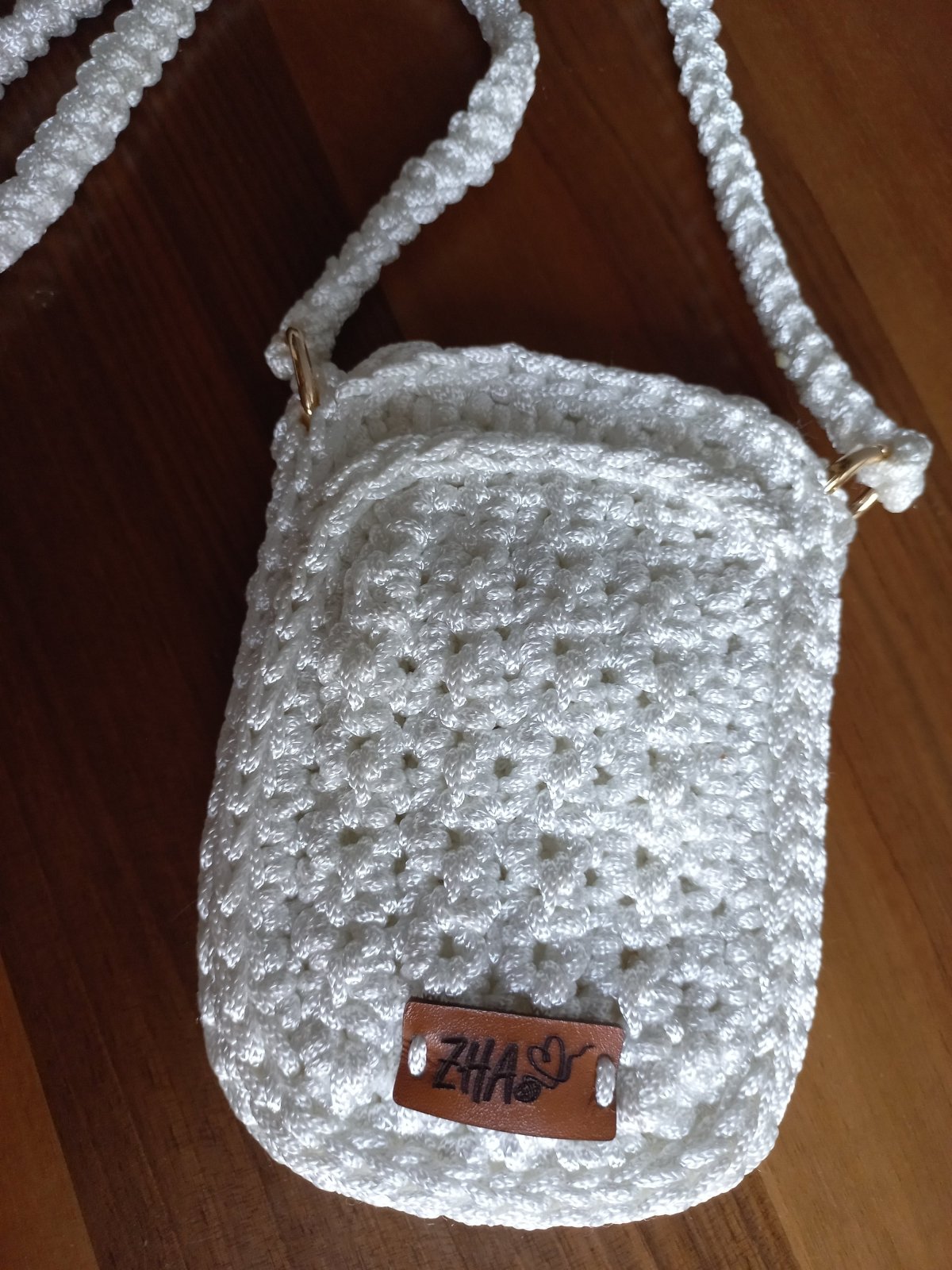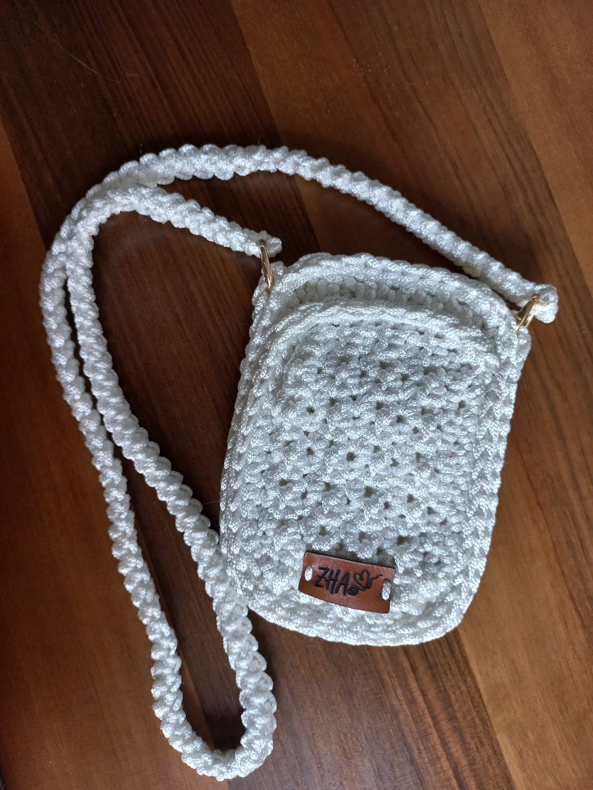 A crochet bag made of silk thread and two pockets. The bag measures 12 cm in width and 17 cm in height and has 110 cm in arms.