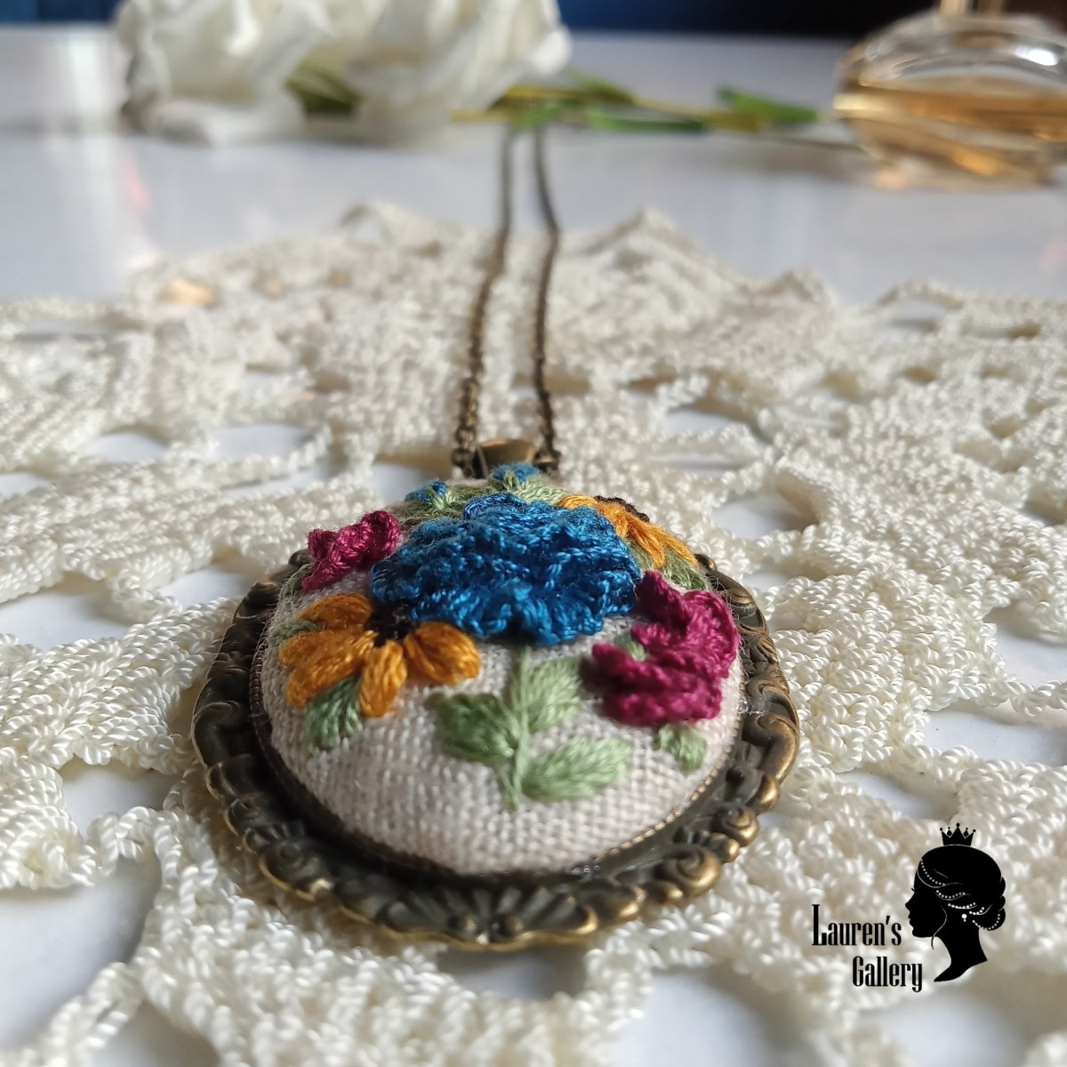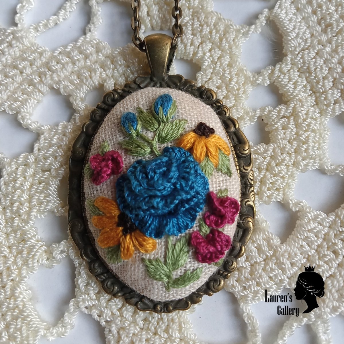 Unique embroidered pendant, using DMC Mouliné Stranded Cotton Embroidery Thread which made in France.