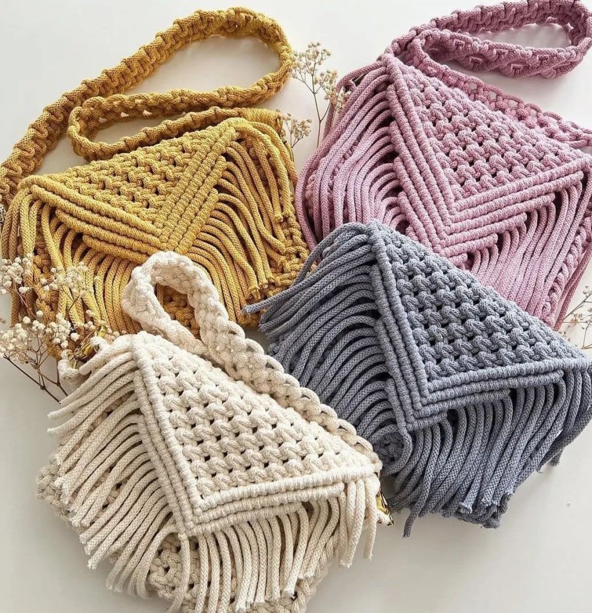 Trendy macrame art bag with imported candy threads, size 22*18, has a cross-body handle and is lined on the inside.
